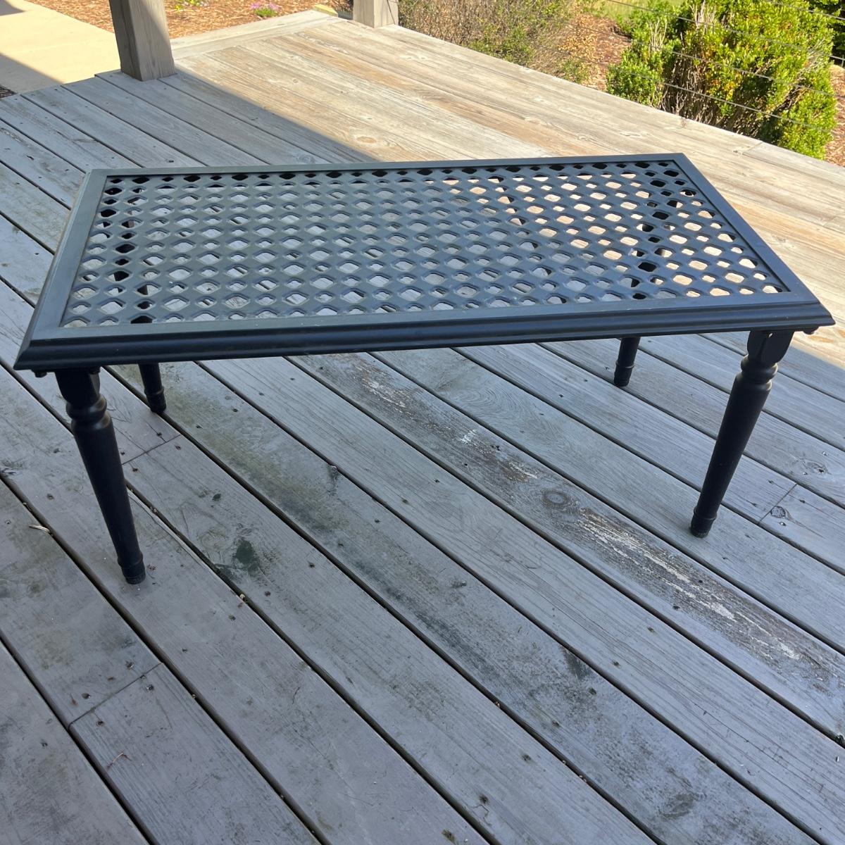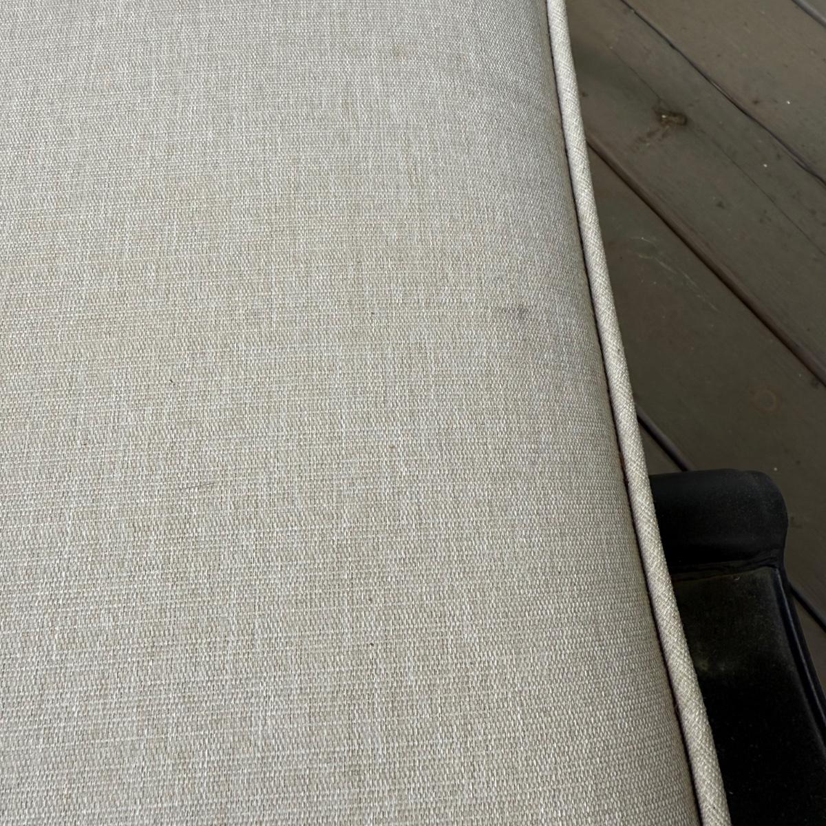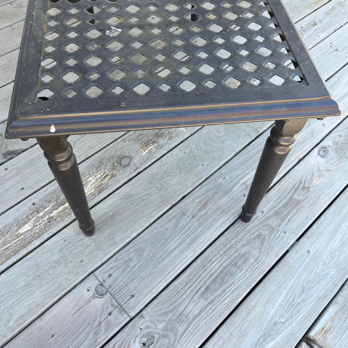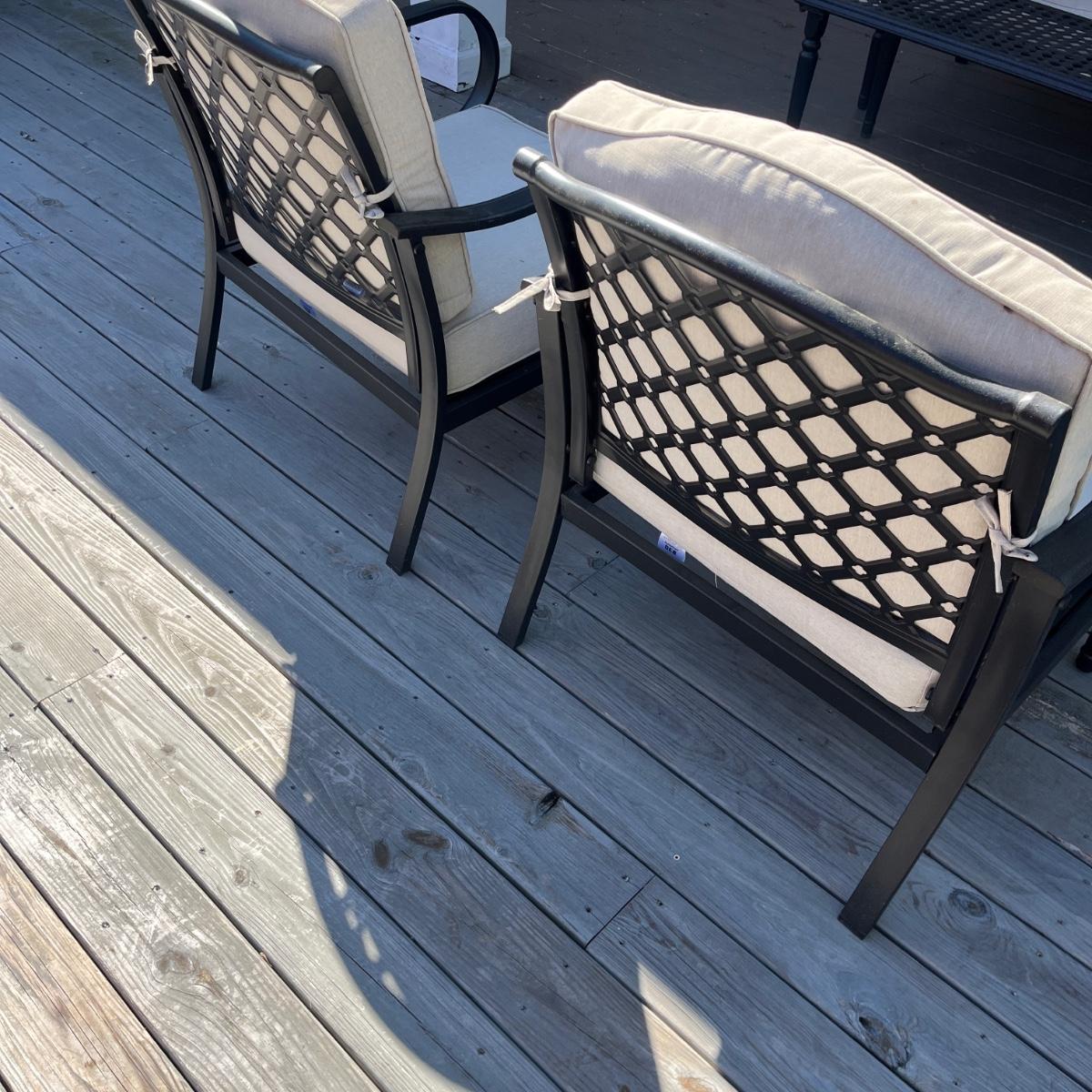 Lot contains an aluminum framed Hampton Bay four piece patio set that includes a loveseat with cushions, two chairs with cushion and a table. Loveseat measures 51” x 32” x 35”H with a 18” seat height and chairs measure 32” x 28” x 35”H with a 18” seat height. Cushions have some marks, see pictures.