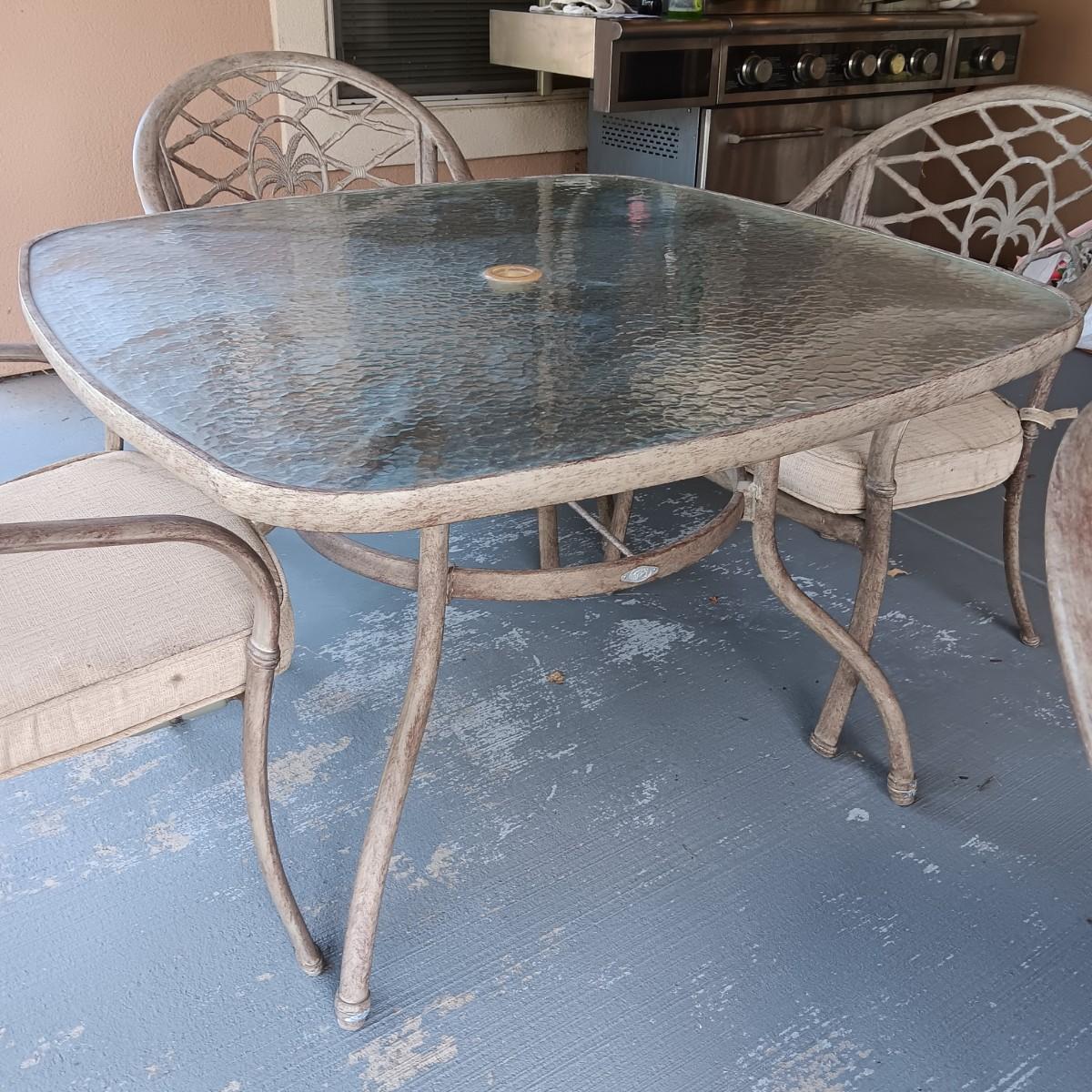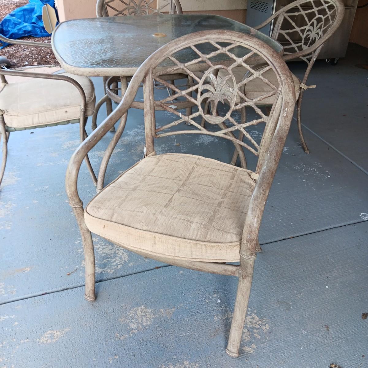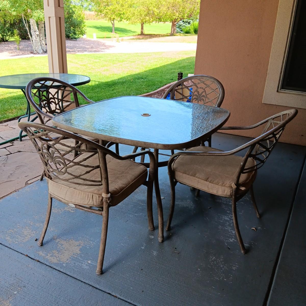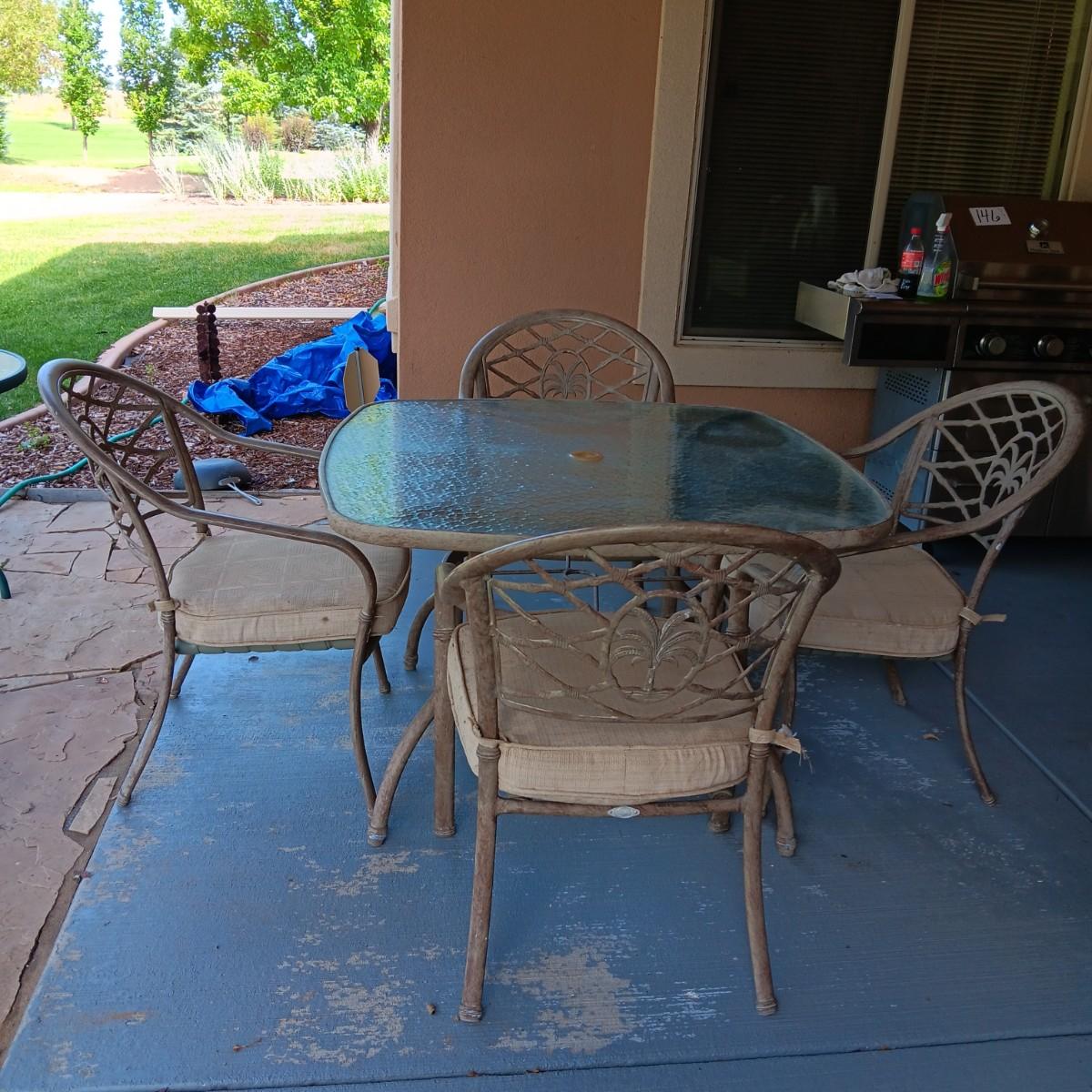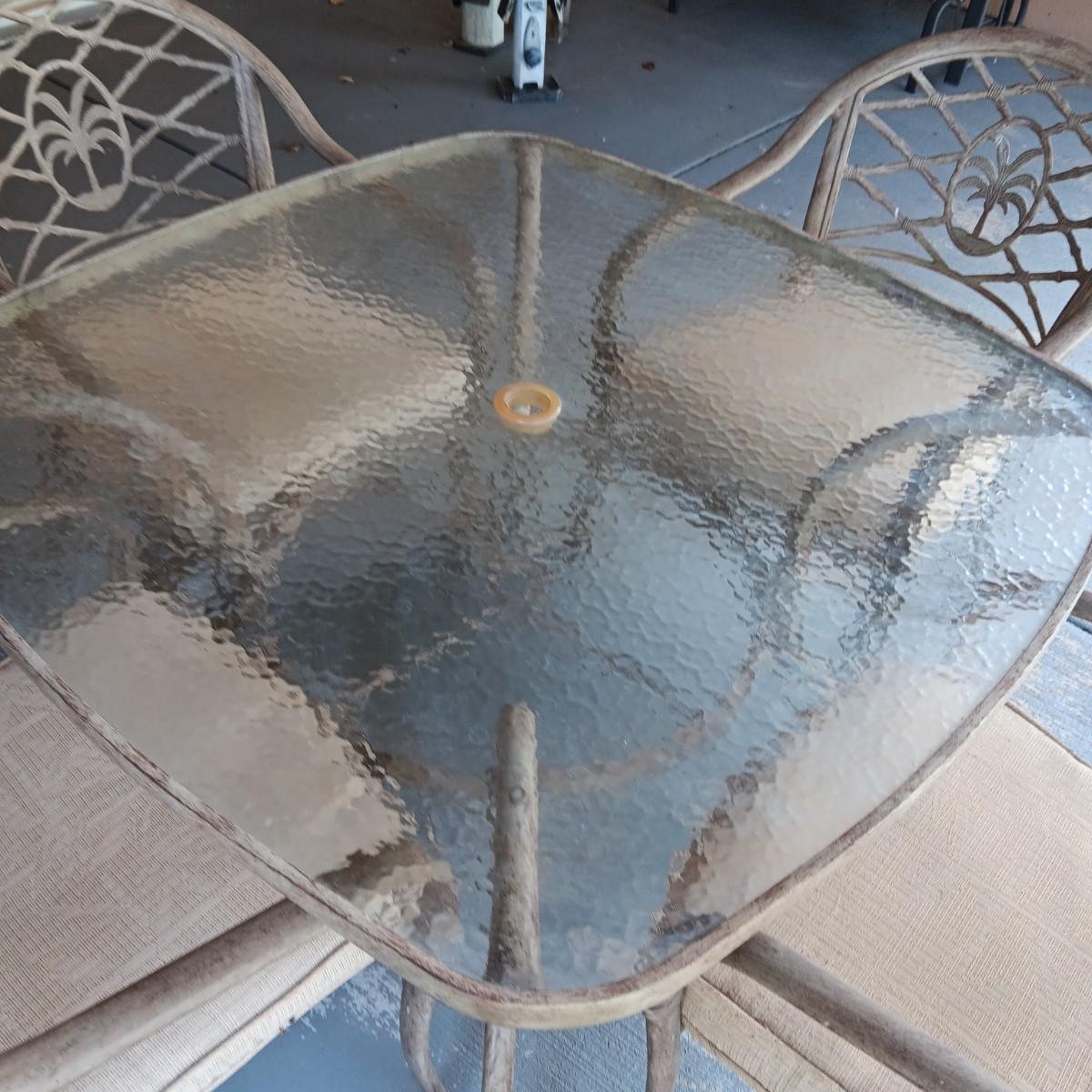 HAMPTON BAY GLASS TOP PATIO TABLE WITH 4 CHAIRS