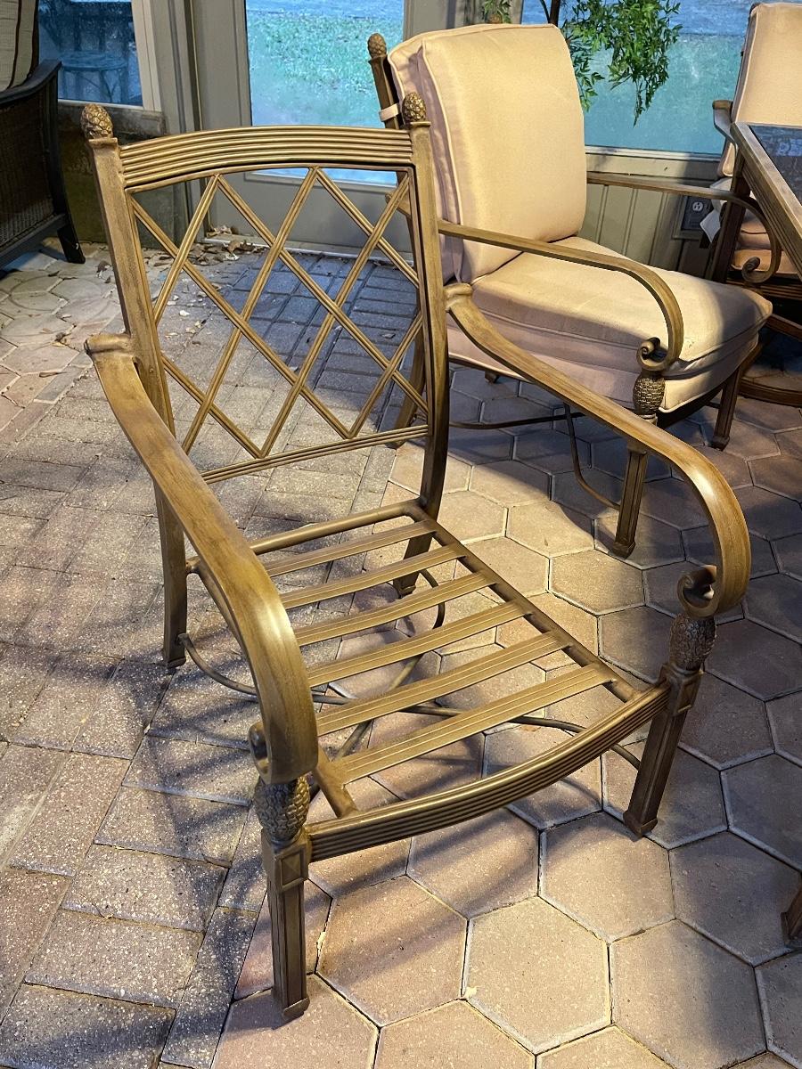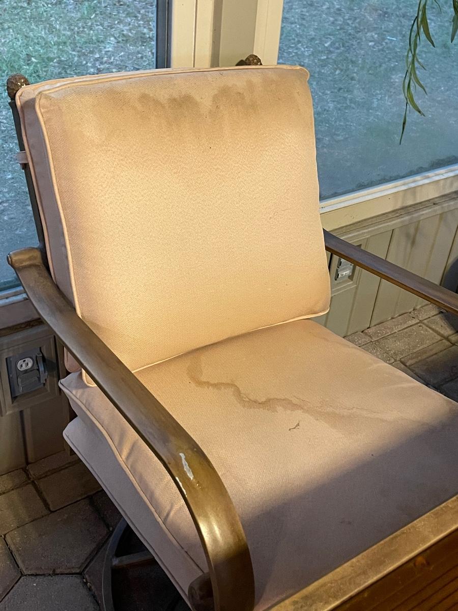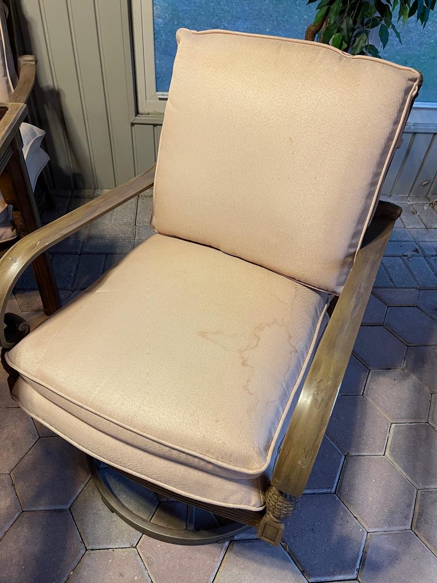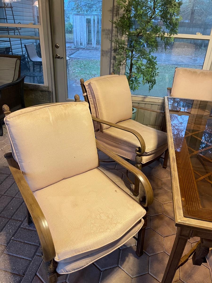 Has been stored indoors in sunroom. Metal Table base and chairs are in great shape. Cushions are only Dirty. Only 1 chair cushion has a small hole on the seat cushion. See photo. No rips or tears on others