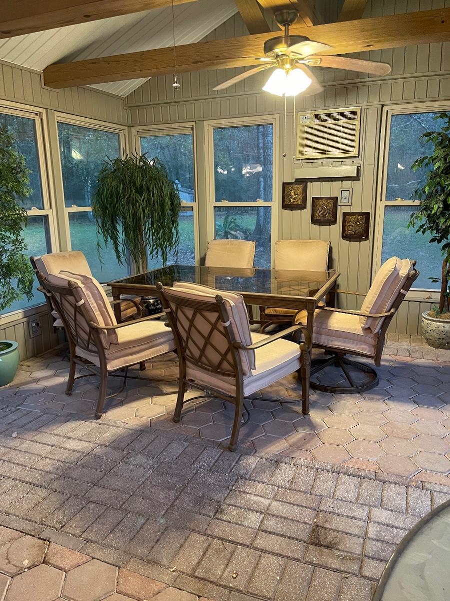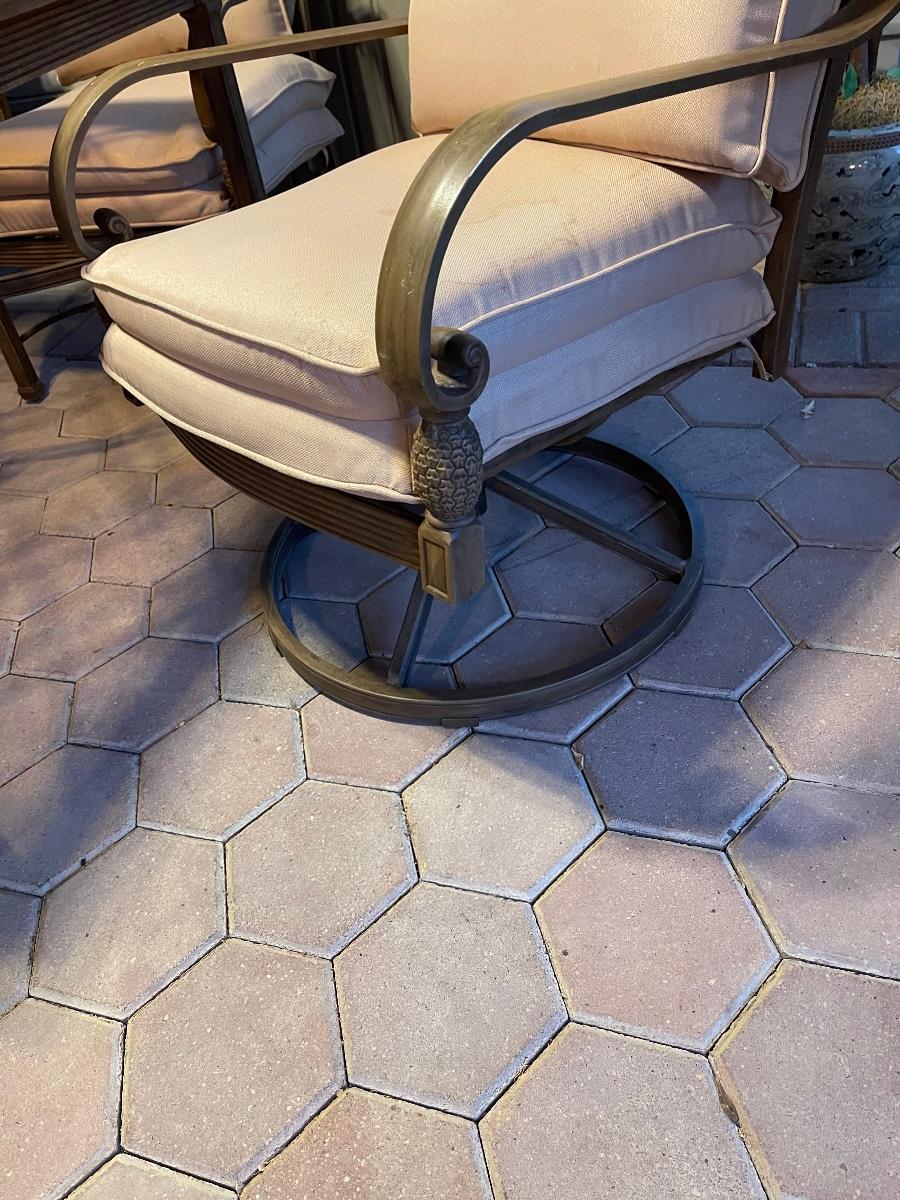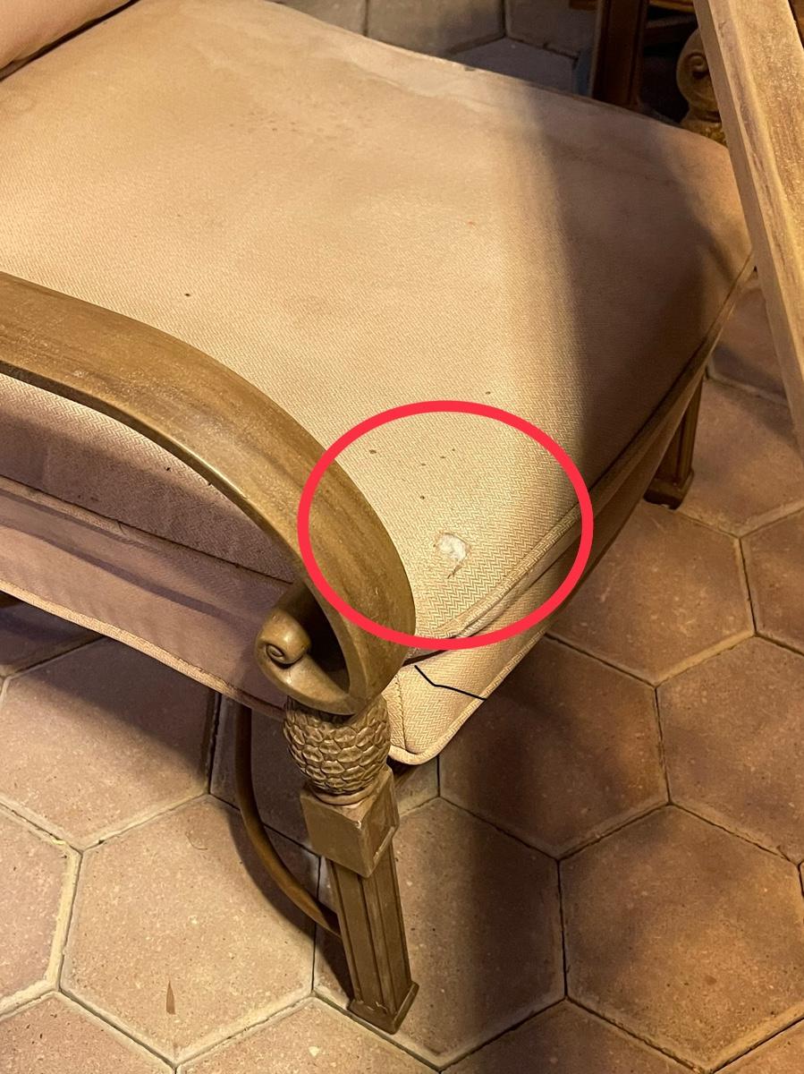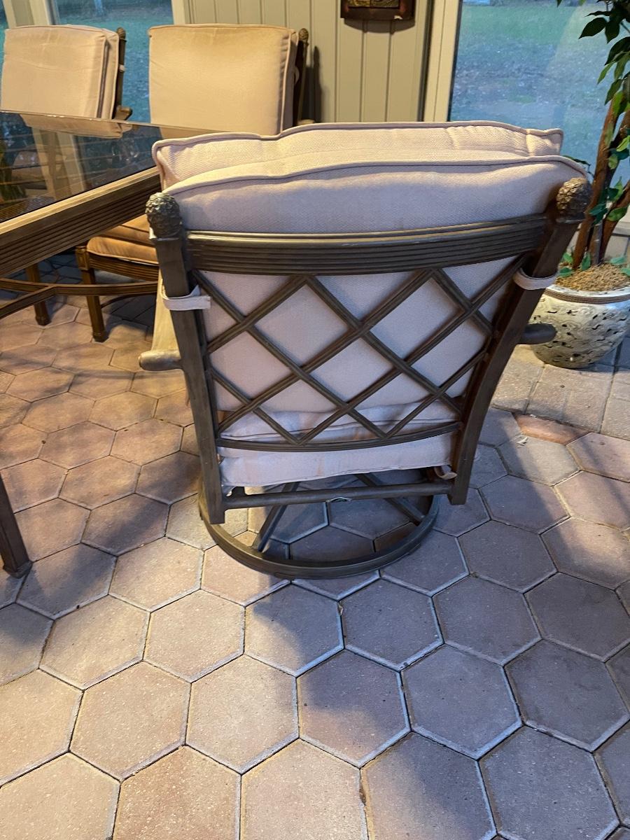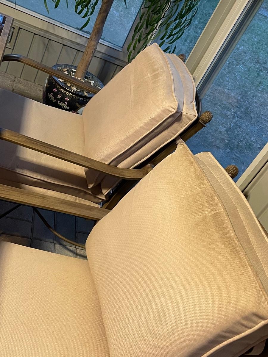 Has been stored indoors in sunroom. Metal Table base and chairs are in great shape. Cushions are only Dirty. Only 1 chair cushion has a small hole on the seat cushion. See photo. No rips or tears on others