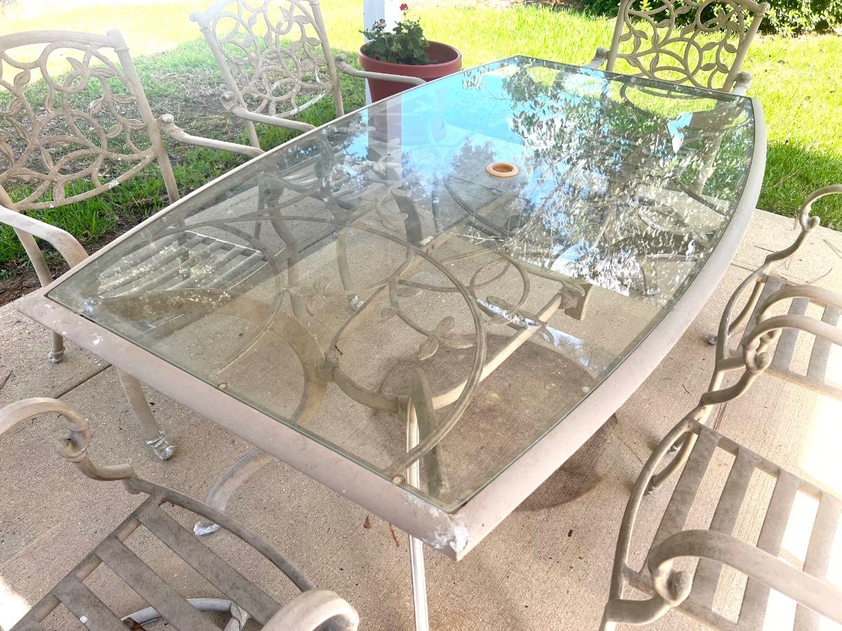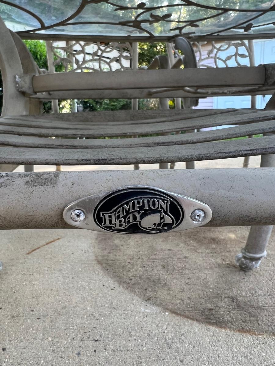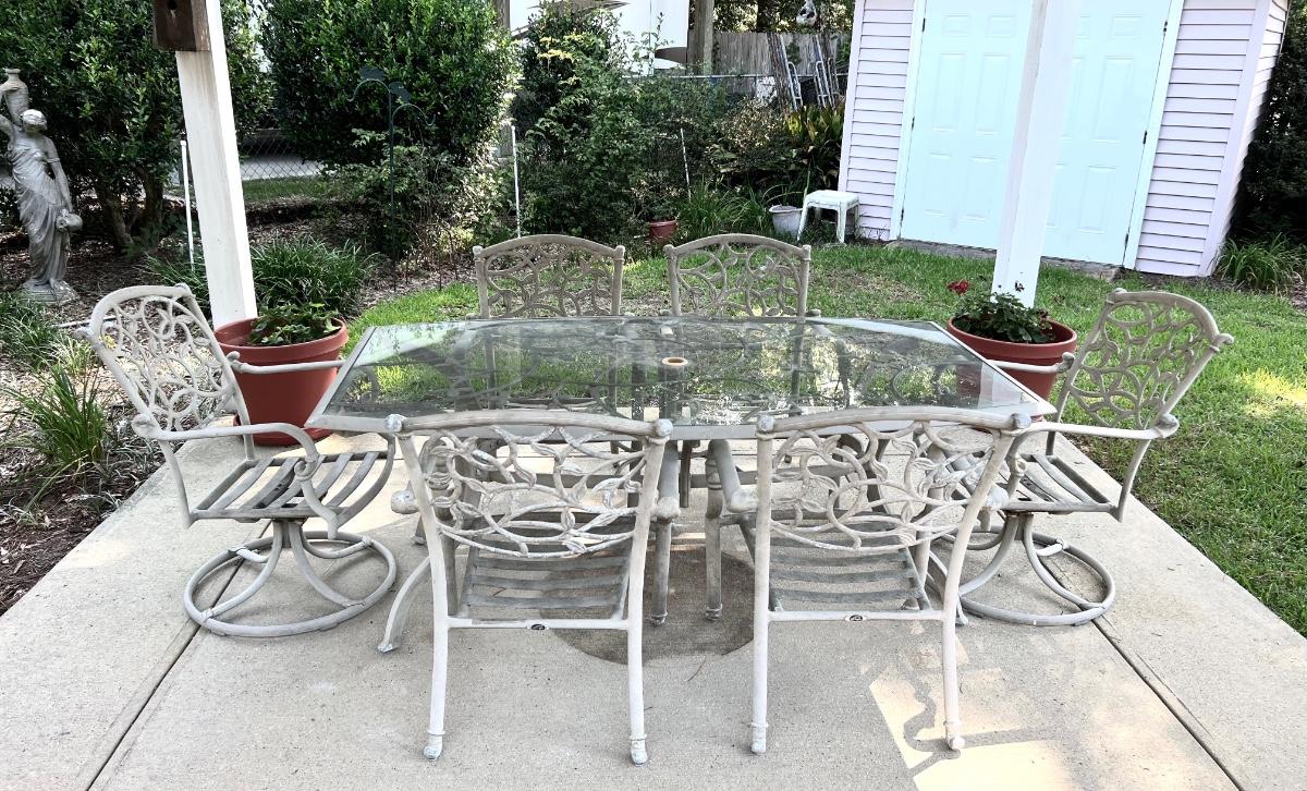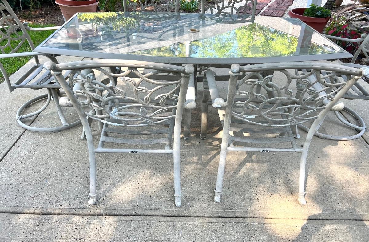 HAMPTON BAY glass top Outdoor Table & 6 Chairs. 4 chairs are regular and two swivel. Table is metal and does show signs of use. The middle does have an opening for an umbrella stand. Table measures 72”X 42 “X 28” Back of Chairs measure 35 inches tall Floor to seat measure 14 inches. Chair seat measures 24 inches wide and 19 inches deep.
