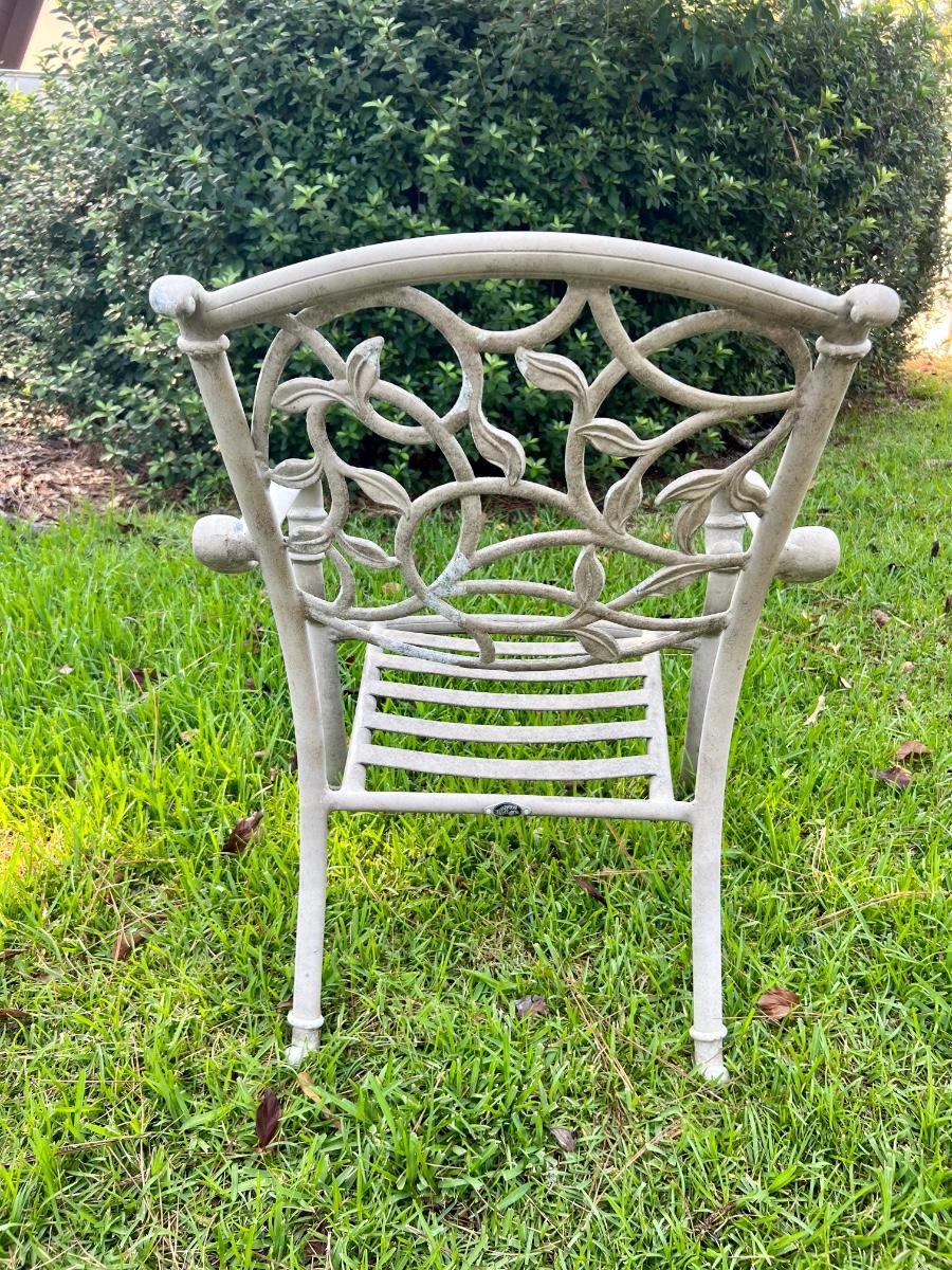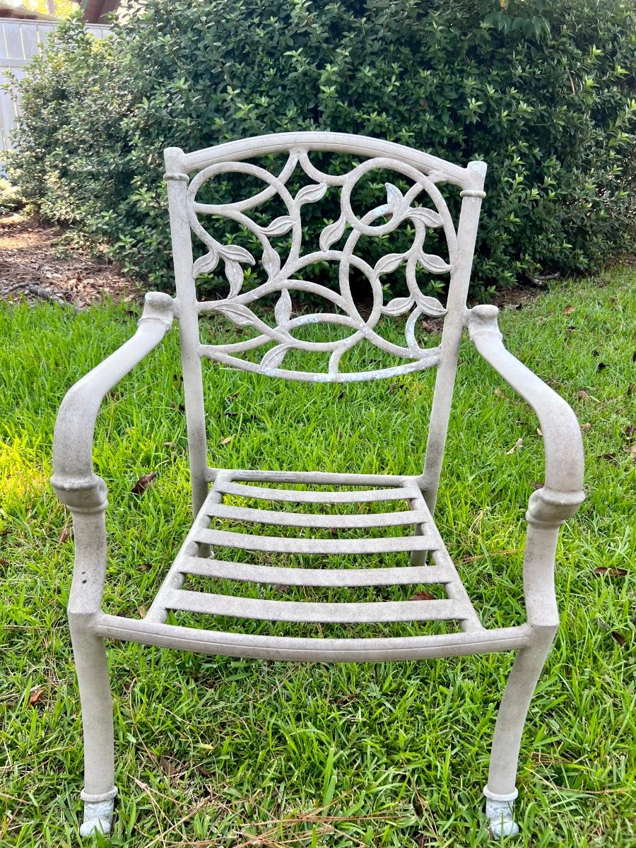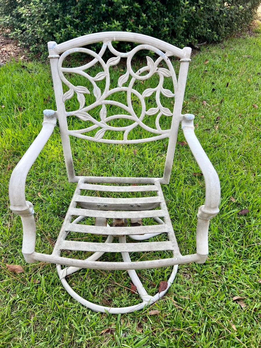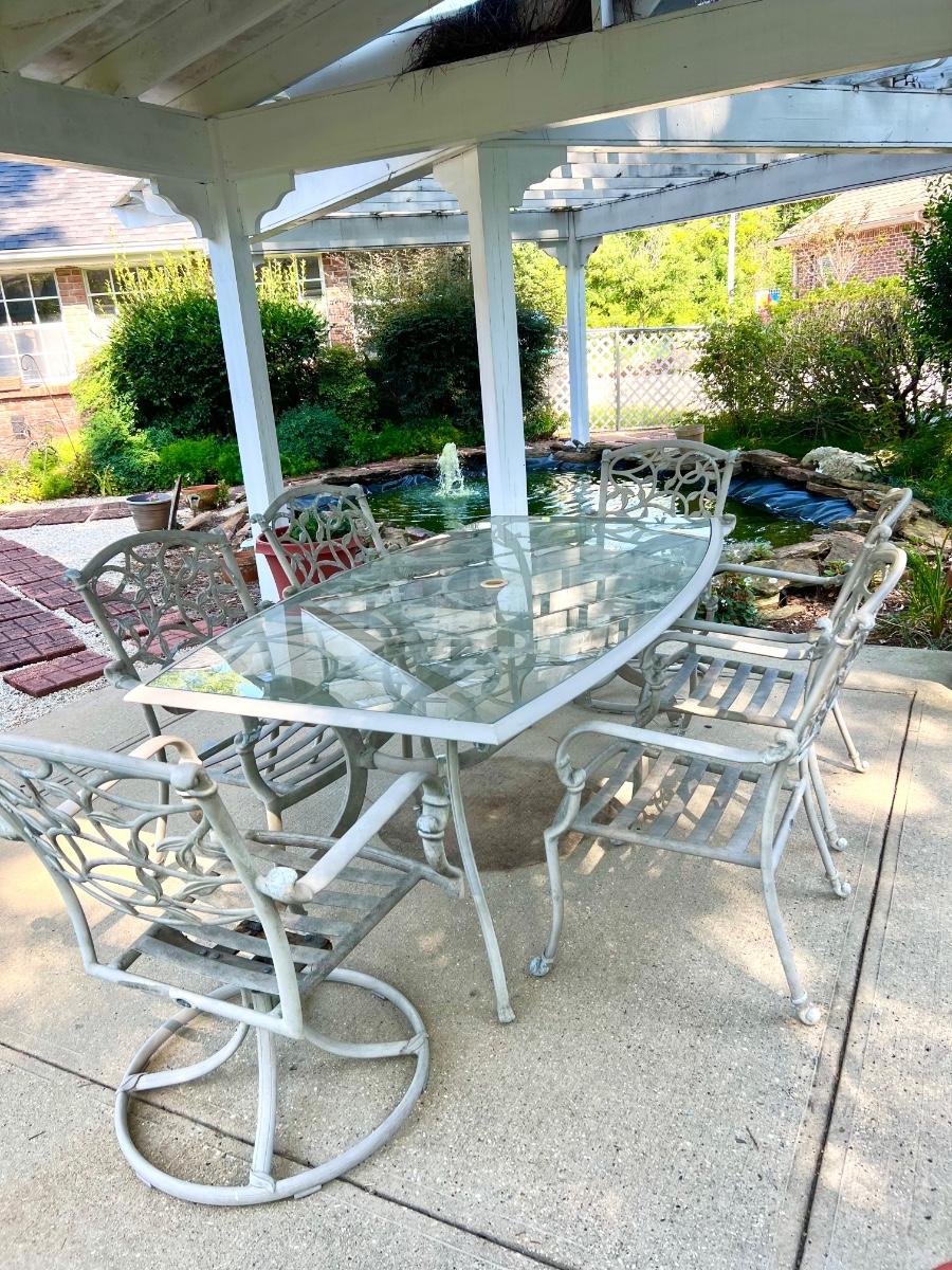 HAMPTON BAY glass top Outdoor Table & 6 Chairs. 4 chairs are regular and two swivel. Table is metal and does show signs of use. The middle does have an opening for an umbrella stand. Table measures 72”X 42 “X 28” Back of Chairs measure 35 inches tall Floor to seat measure 14 inches. Chair seat measures 24 inches wide and 19 inches deep.