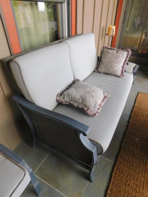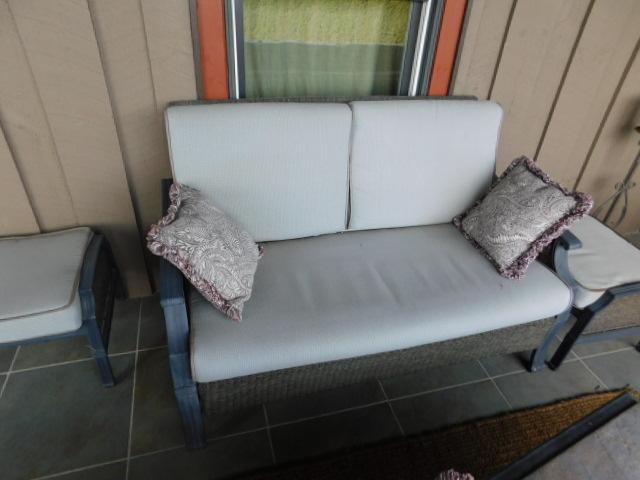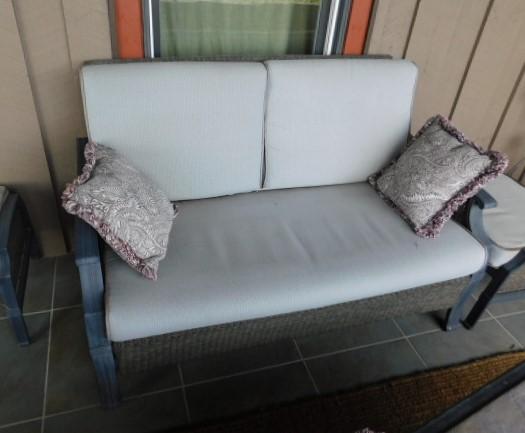 Hampton Bay Patio Furniture Love Seat Composite and Rush Frame with Cushions in very good conditions