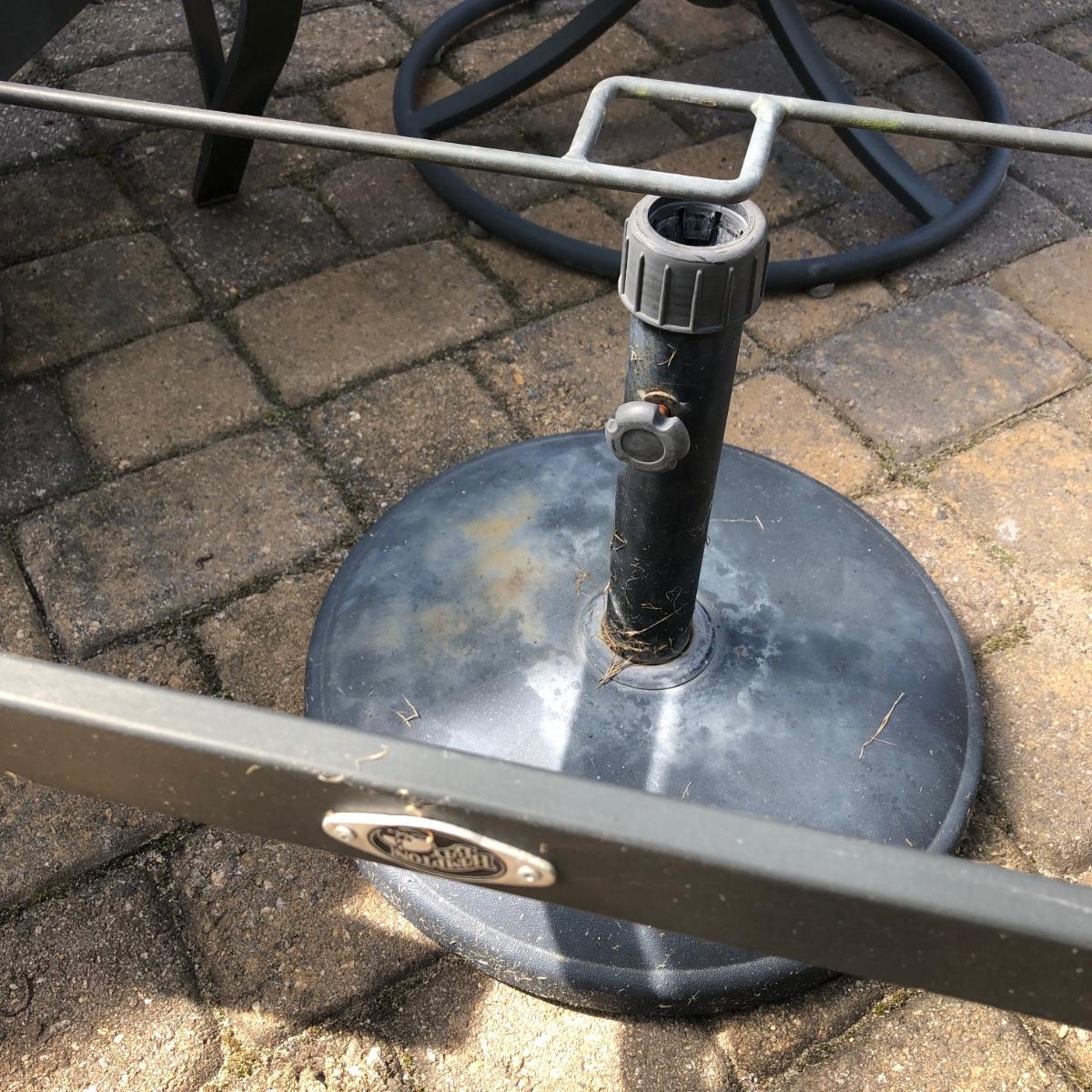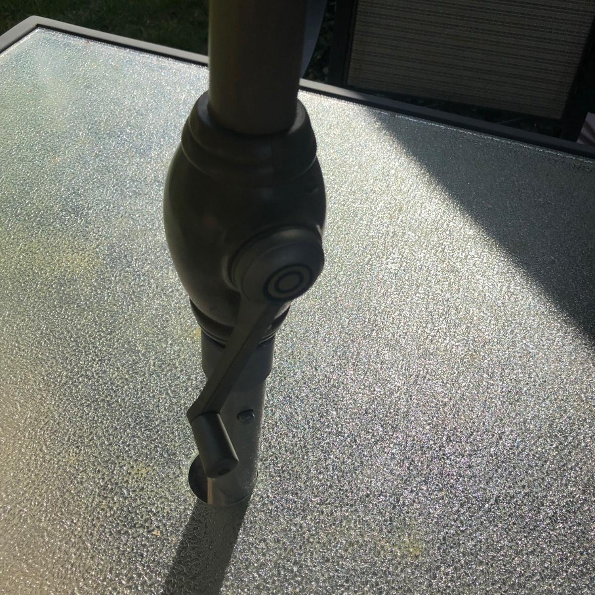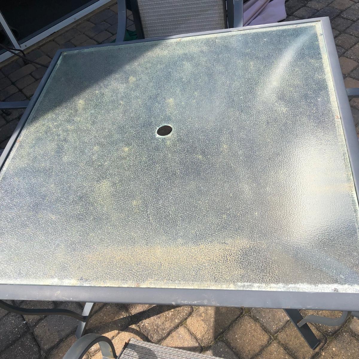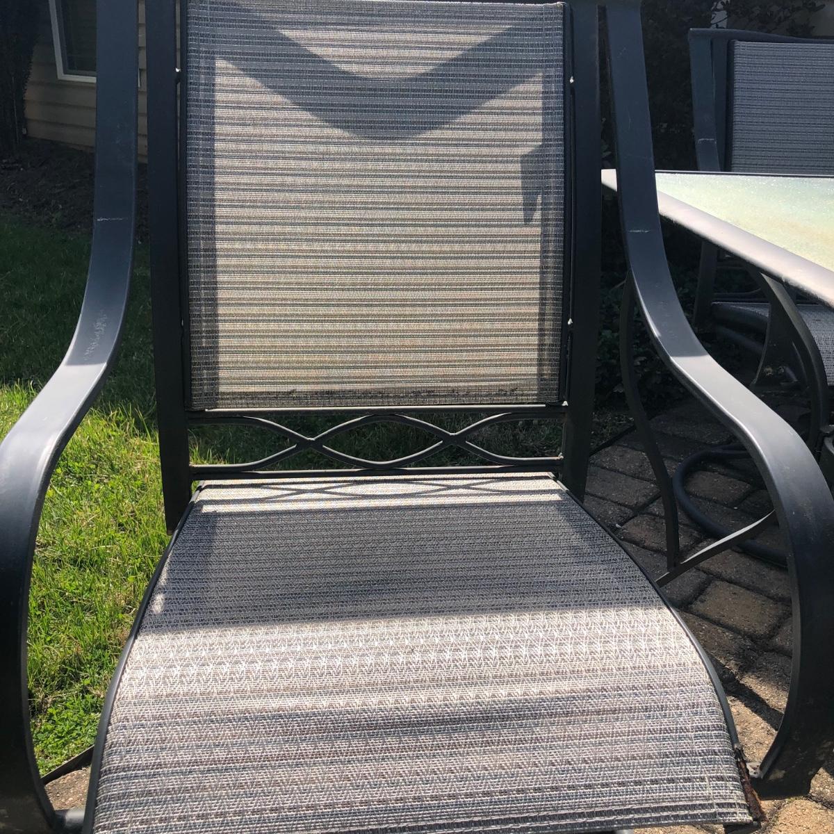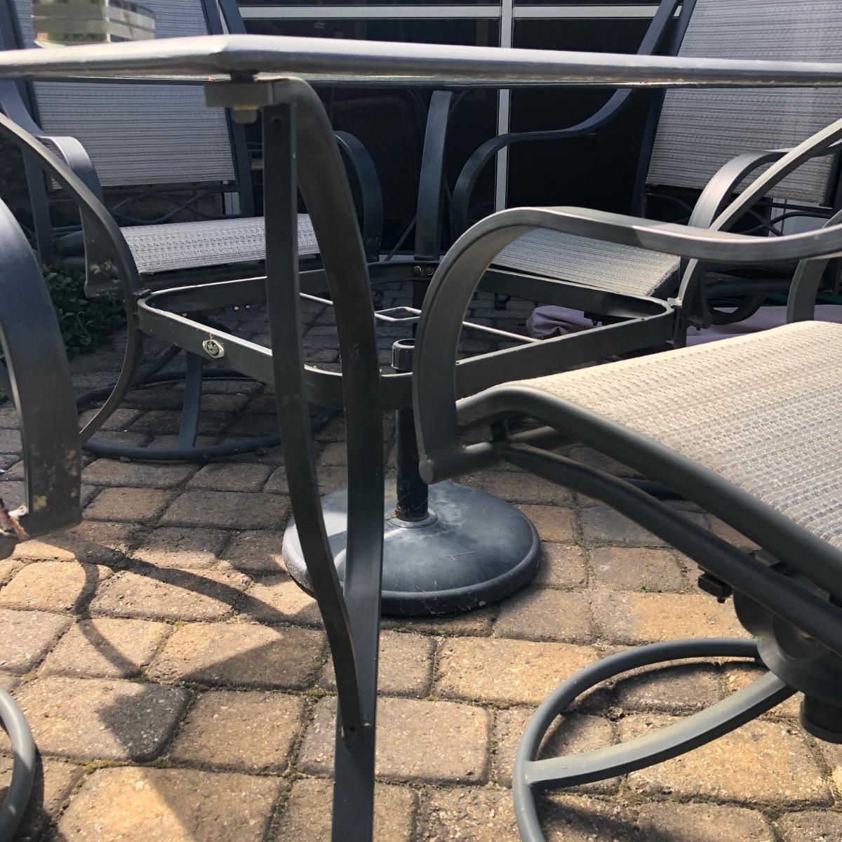 This lot includes a glass top table that is dirty but appears to clean up, four patio chairs that swivel and rock and two patio umbrellas. The table measures 44” x 44” x 27”. Note a few rust spots on chairs and table. Both umbrellas open and close, tilt and have no tears. Umbrella stand included. Local pick up only.