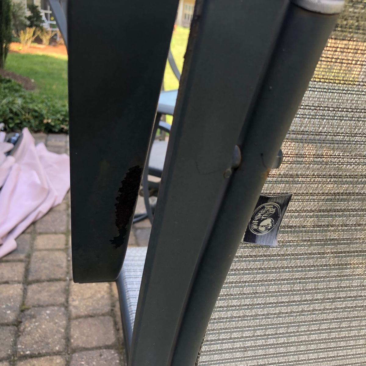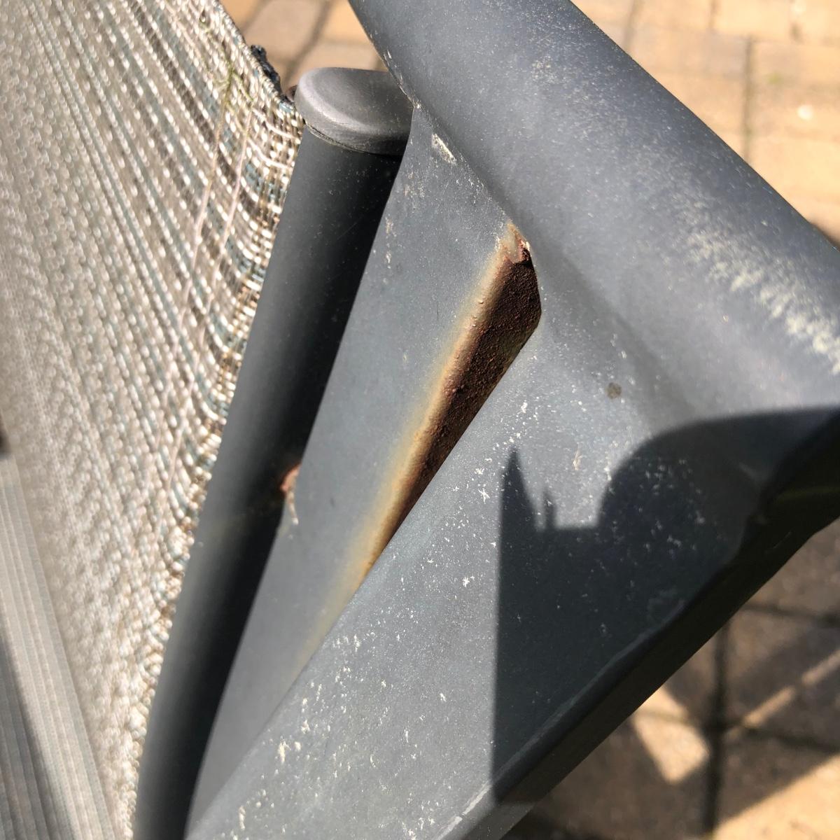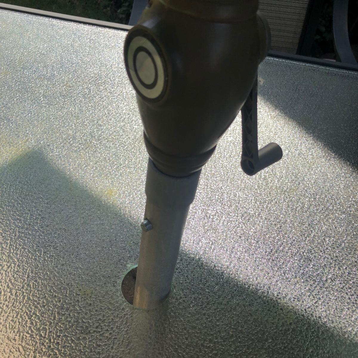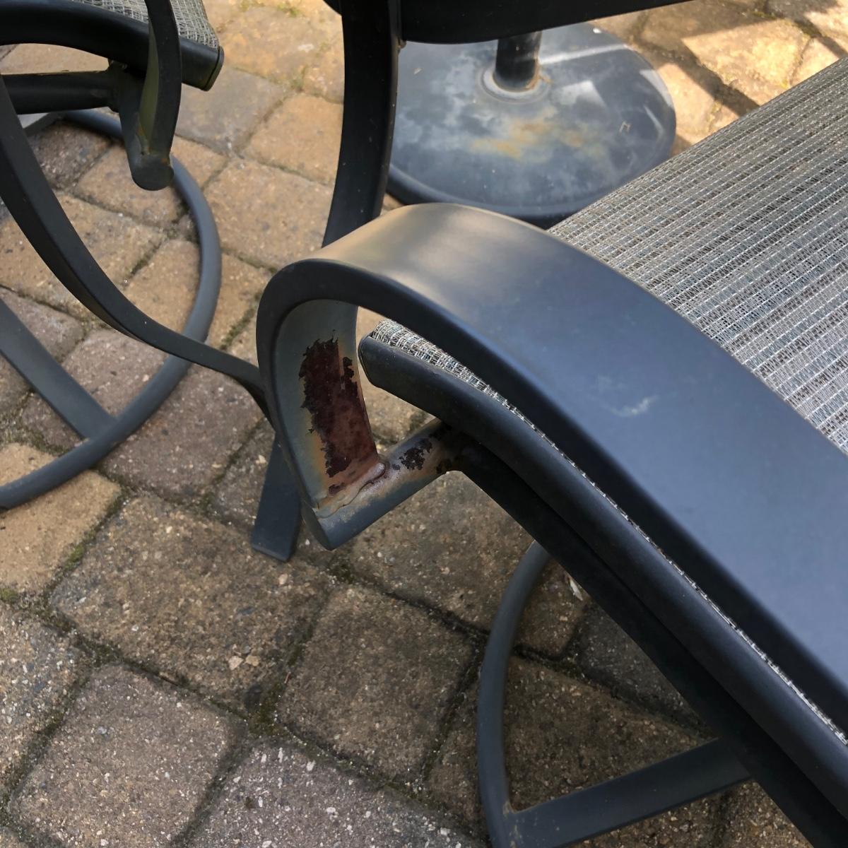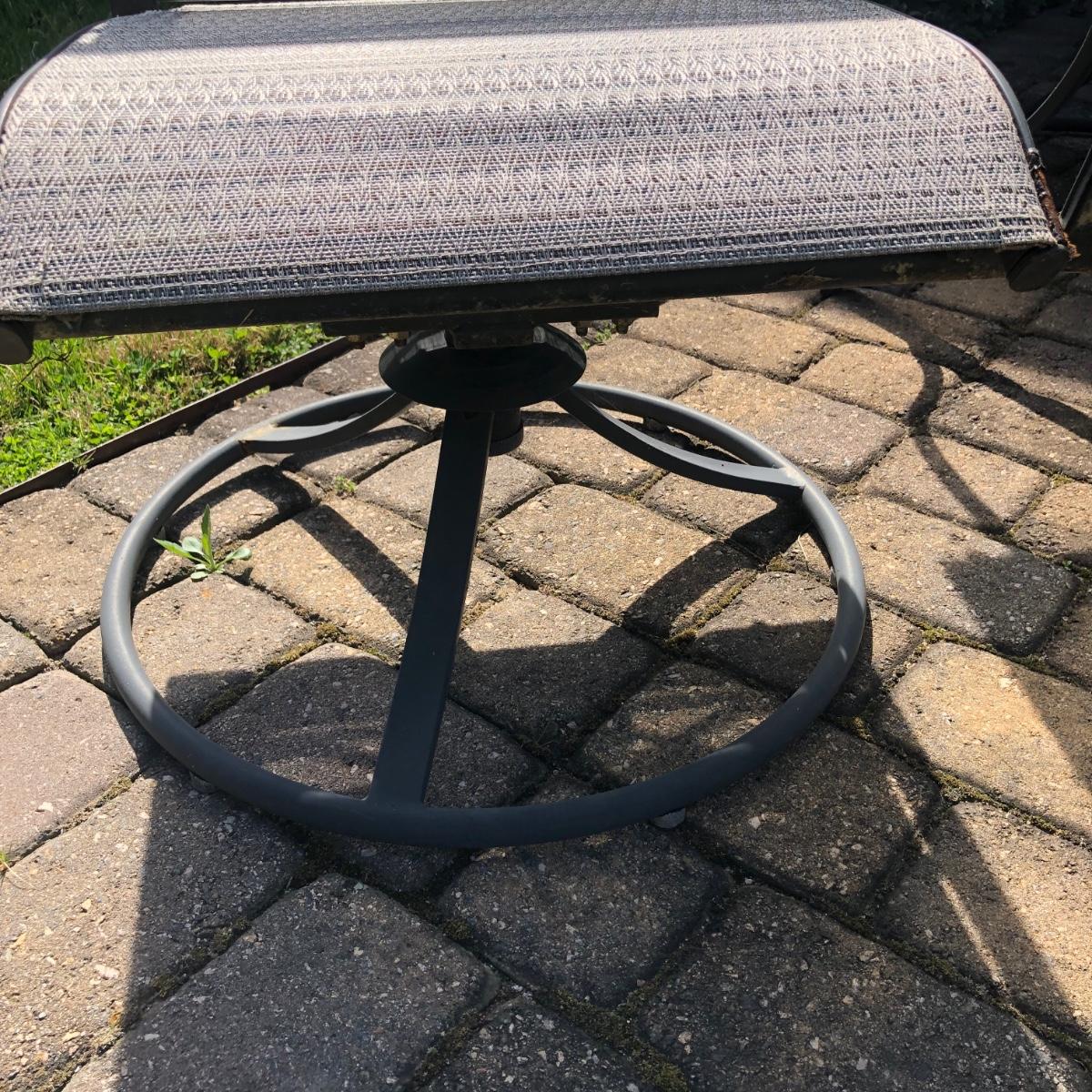 This lot includes a glass top table that is dirty but appears to clean up, four patio chairs that swivel and rock and two patio umbrellas. The table measures 44” x 44” x 27”. Note a few rust spots on chairs and table. Both umbrellas open and close, tilt and have no tears. Umbrella stand included. Local pick up only.