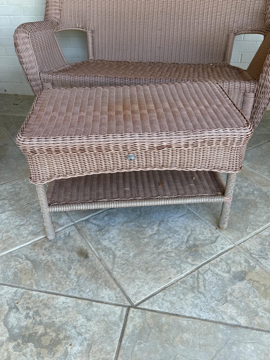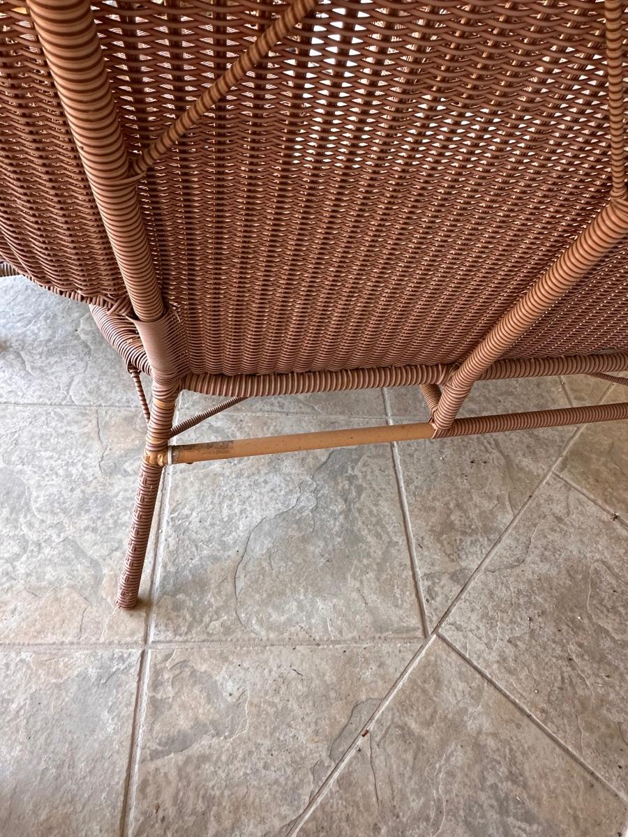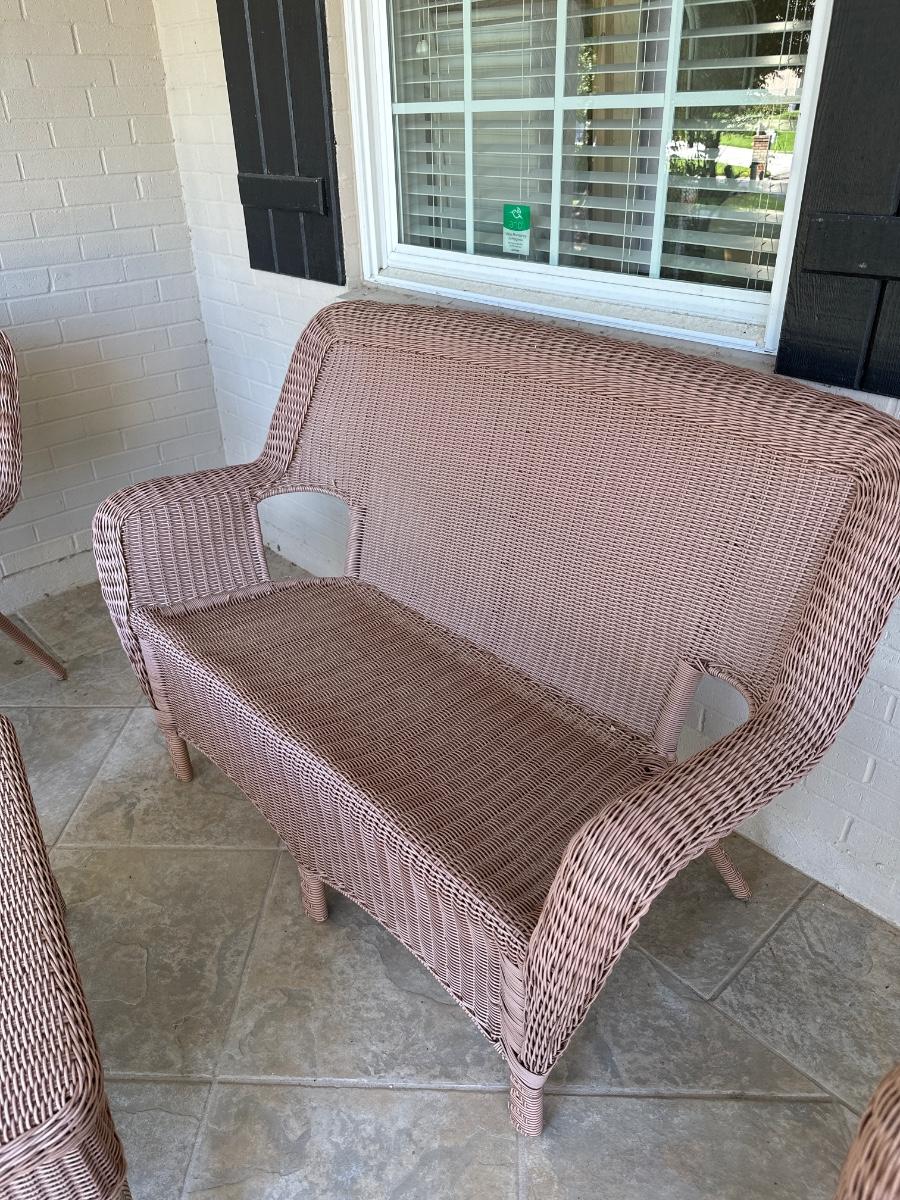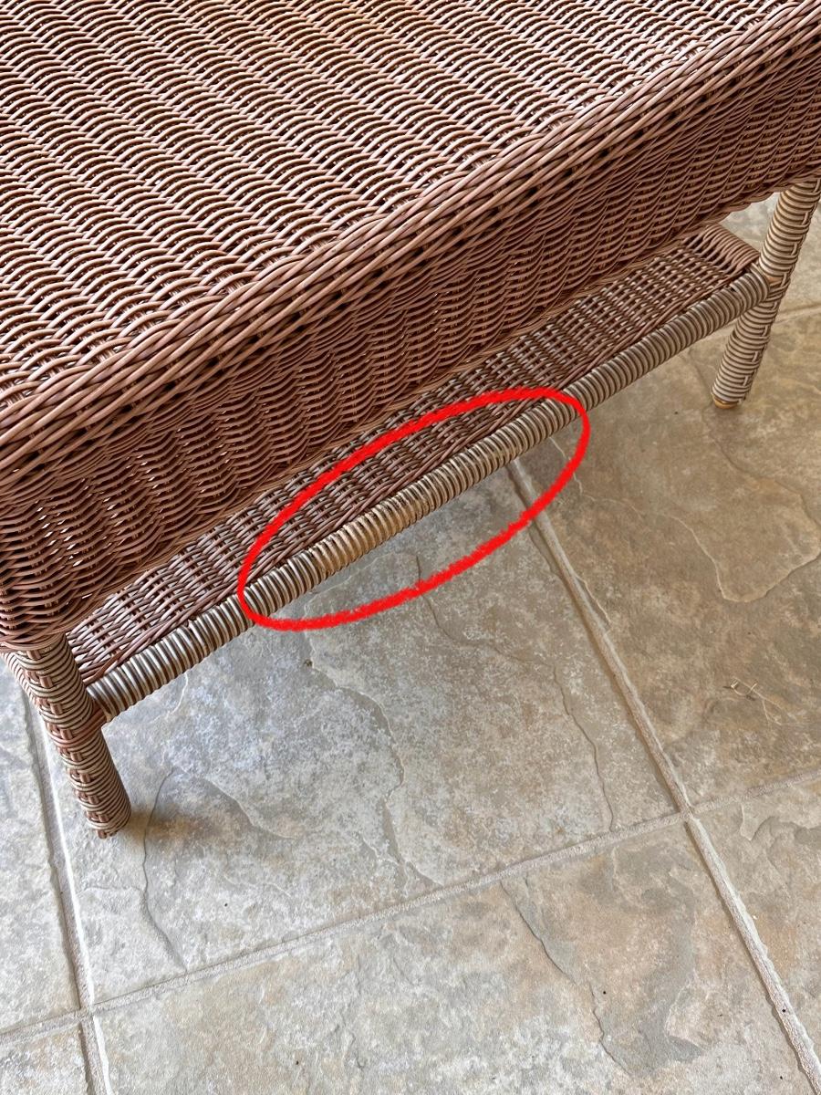 Patio Kept ~7 piece set includes 4 chairs ~ 52” Sattee, coffee table that measures 18” H x 30” W x 18” D and side table that measures 21” H x 18” x 18” ~ As shown in photos, the table has a stain in the center and the Sattee has some unraveling in the back as shown. Of course you can’t see it if it’s up against a wall
