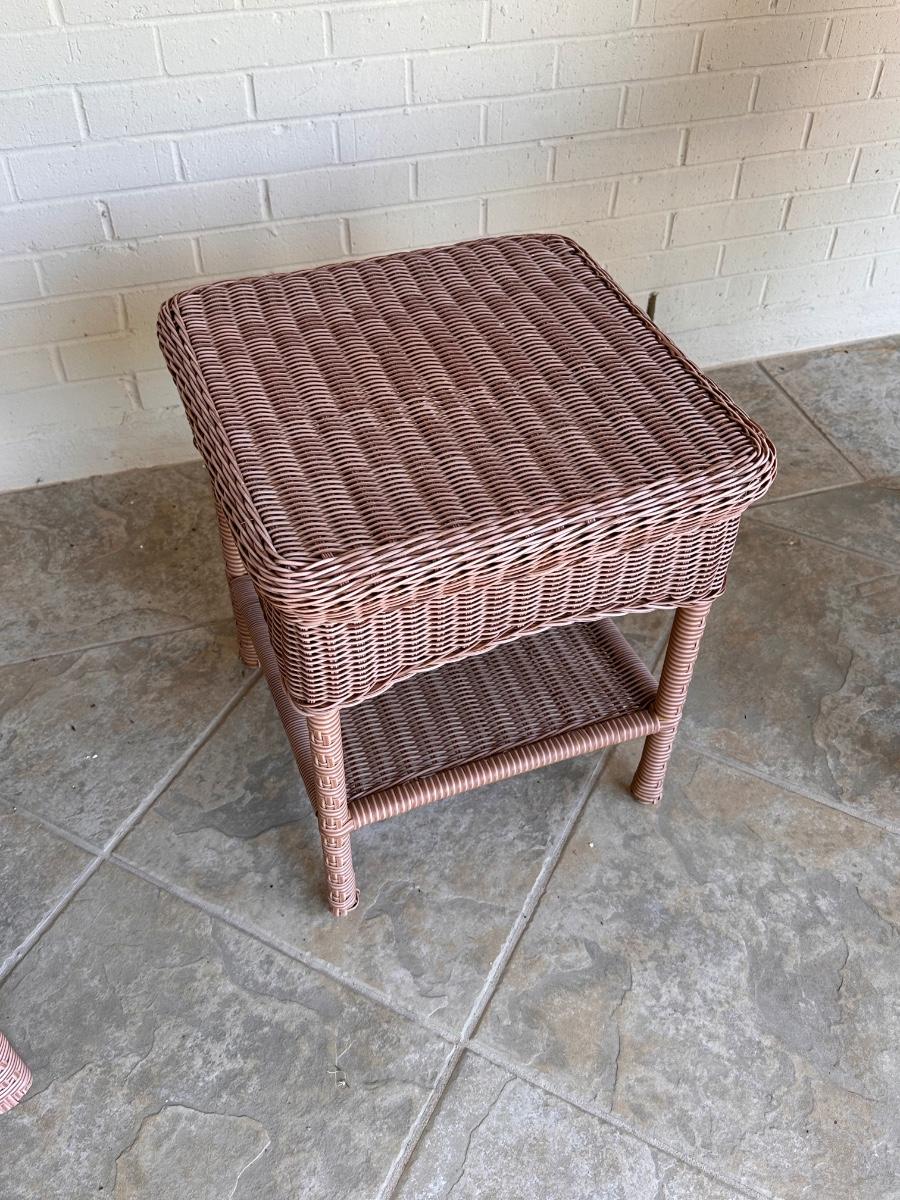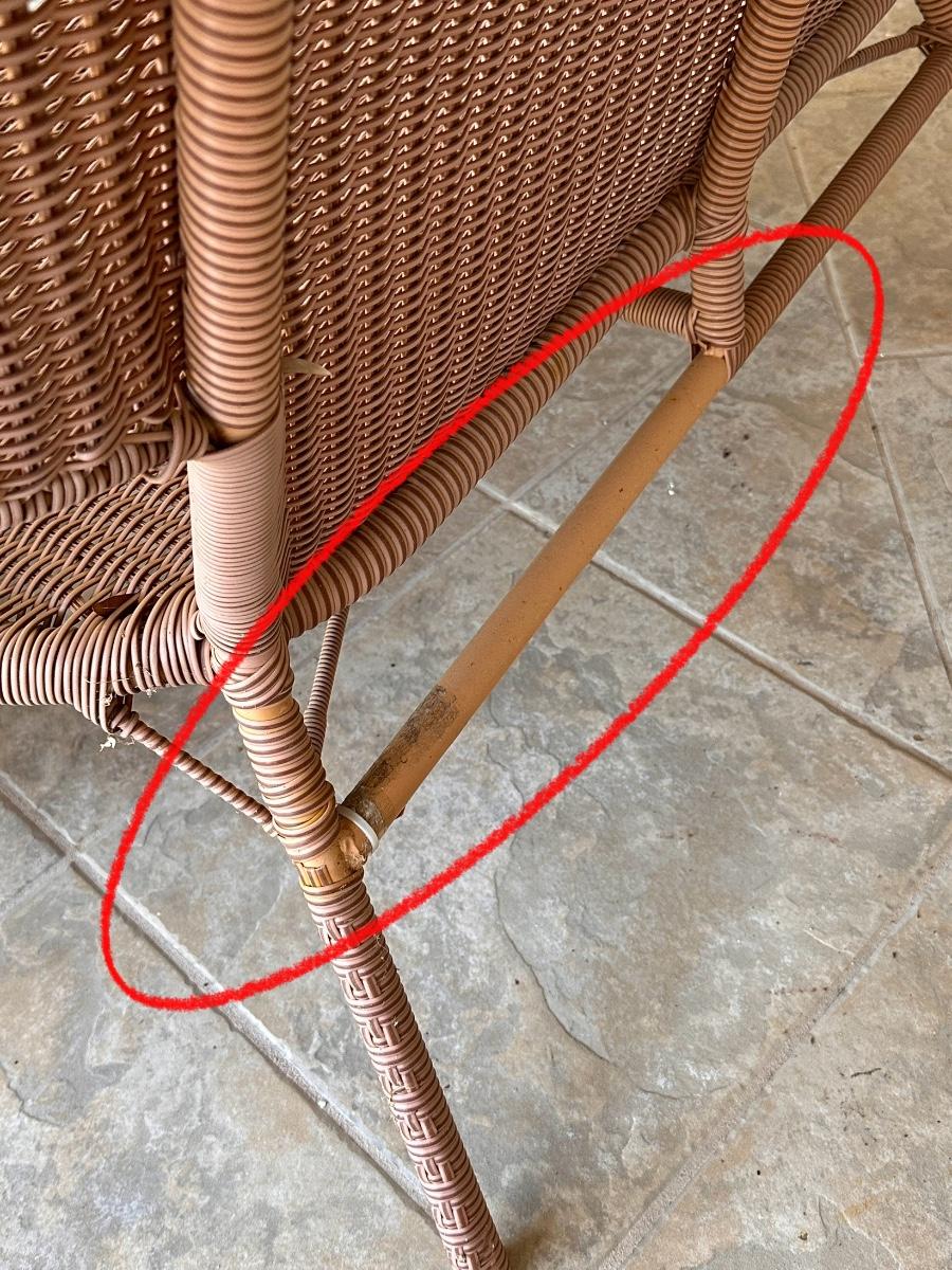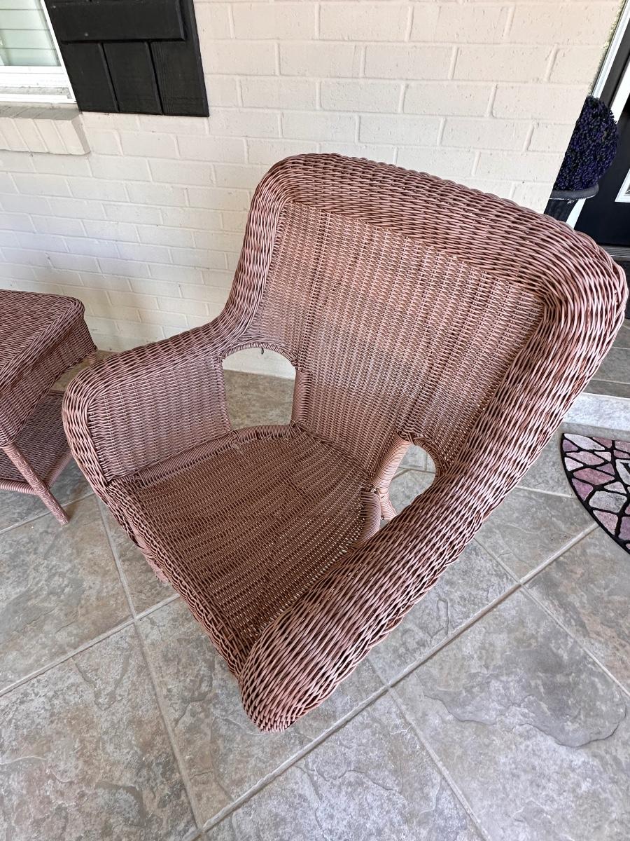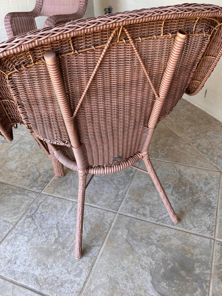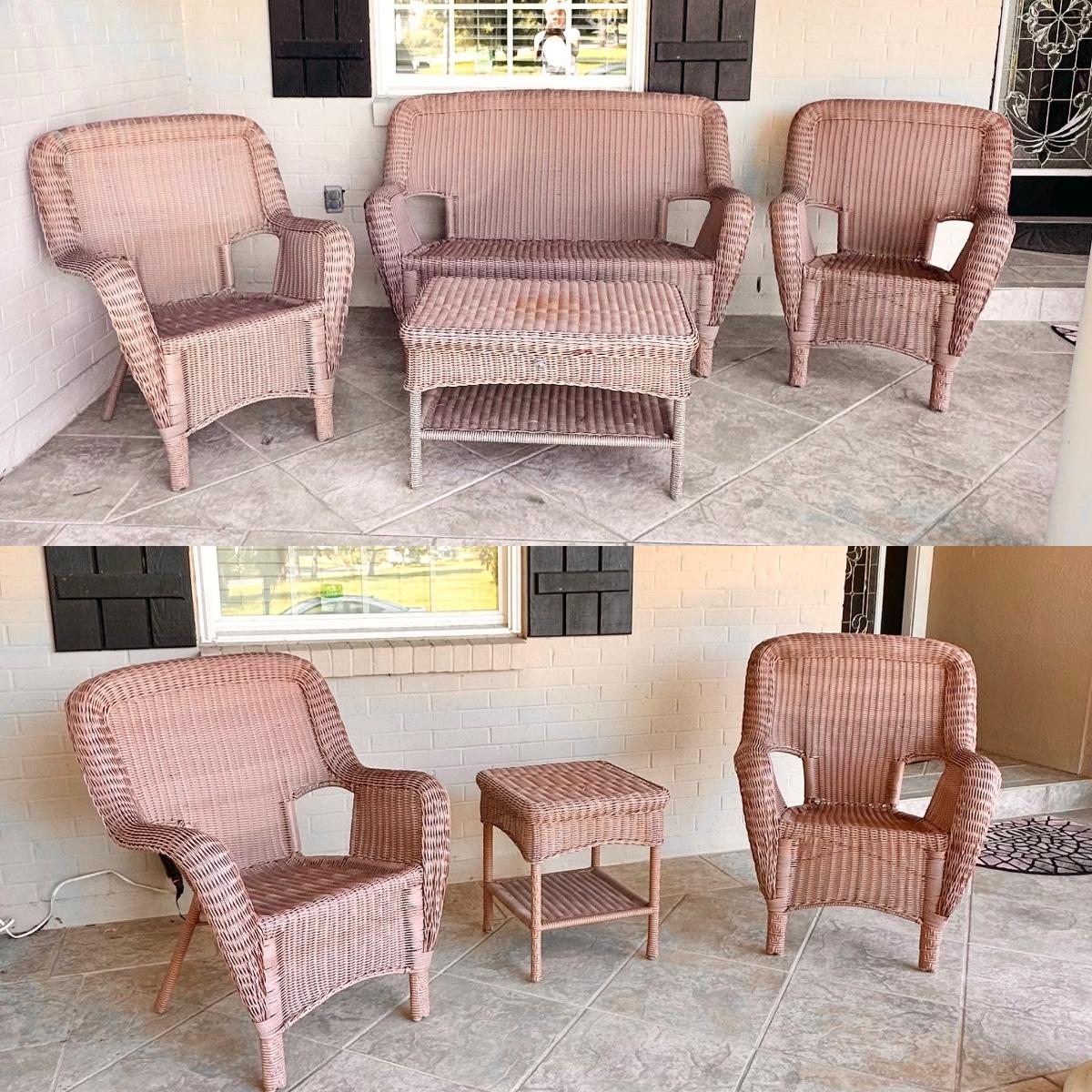 Patio Kept ~7 piece set includes 4 chairs ~ 52” Sattee, coffee table that measures 18” H x 30” W x 18” D and side table that measures 21” H x 18” x 18” ~ As shown in photos, the table has a stain in the center and the Sattee has some unraveling in the back as shown. Of course you can’t see it if it’s up against a wall