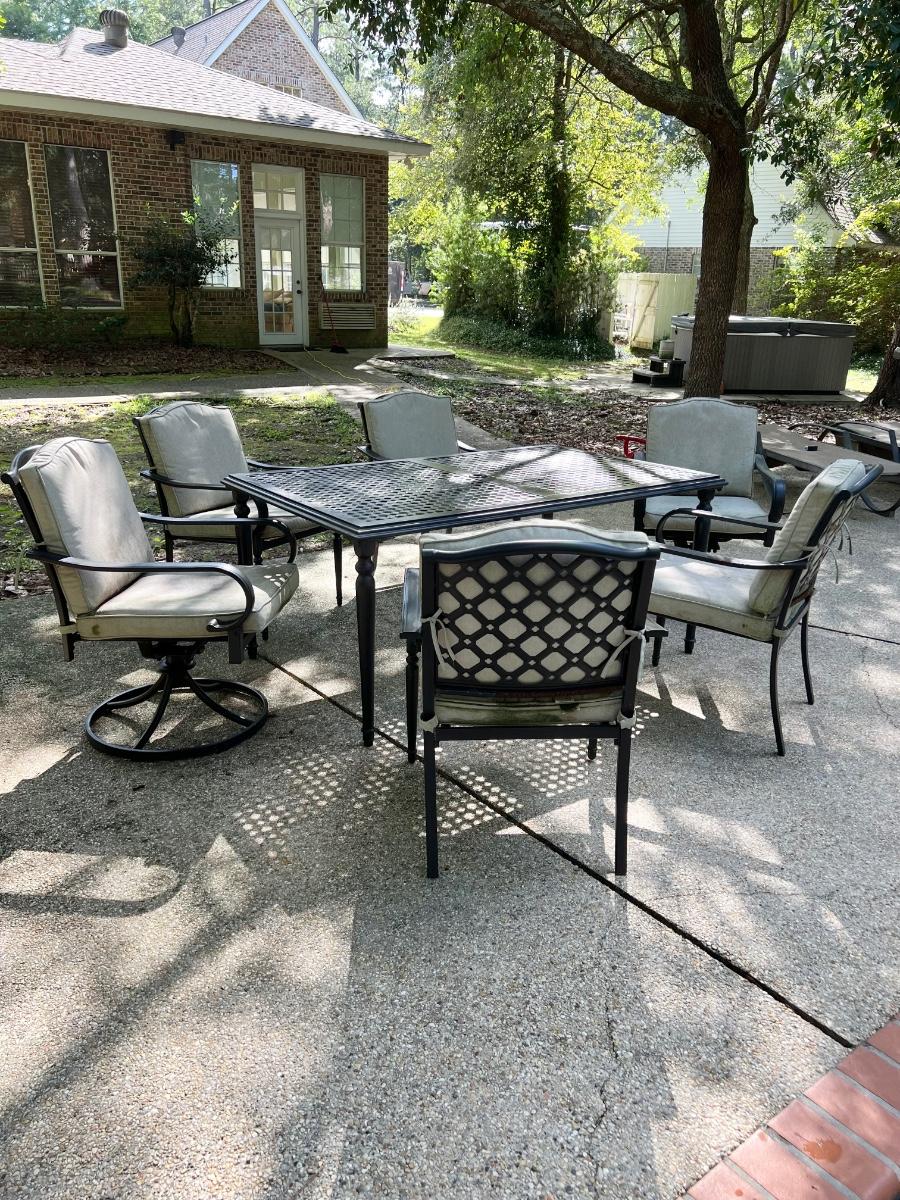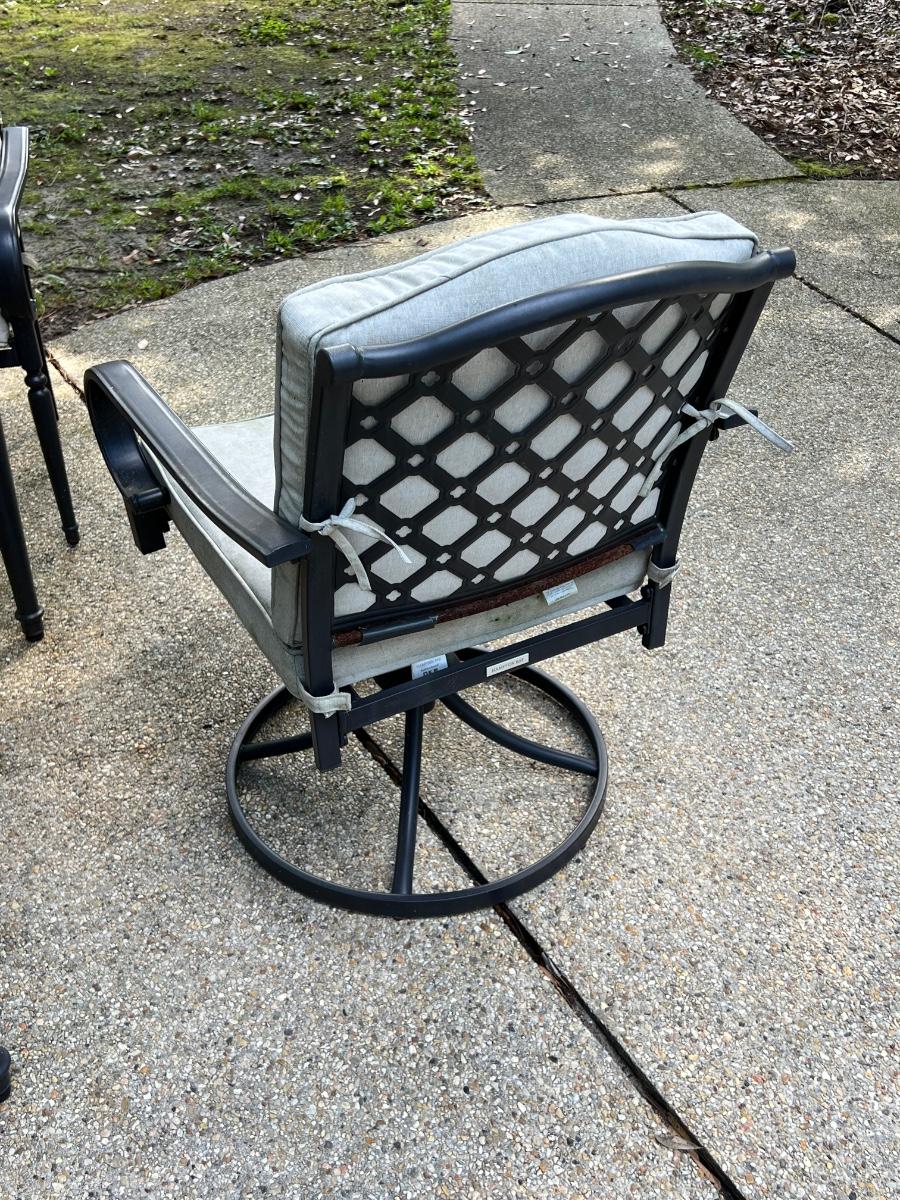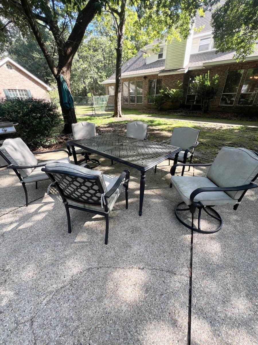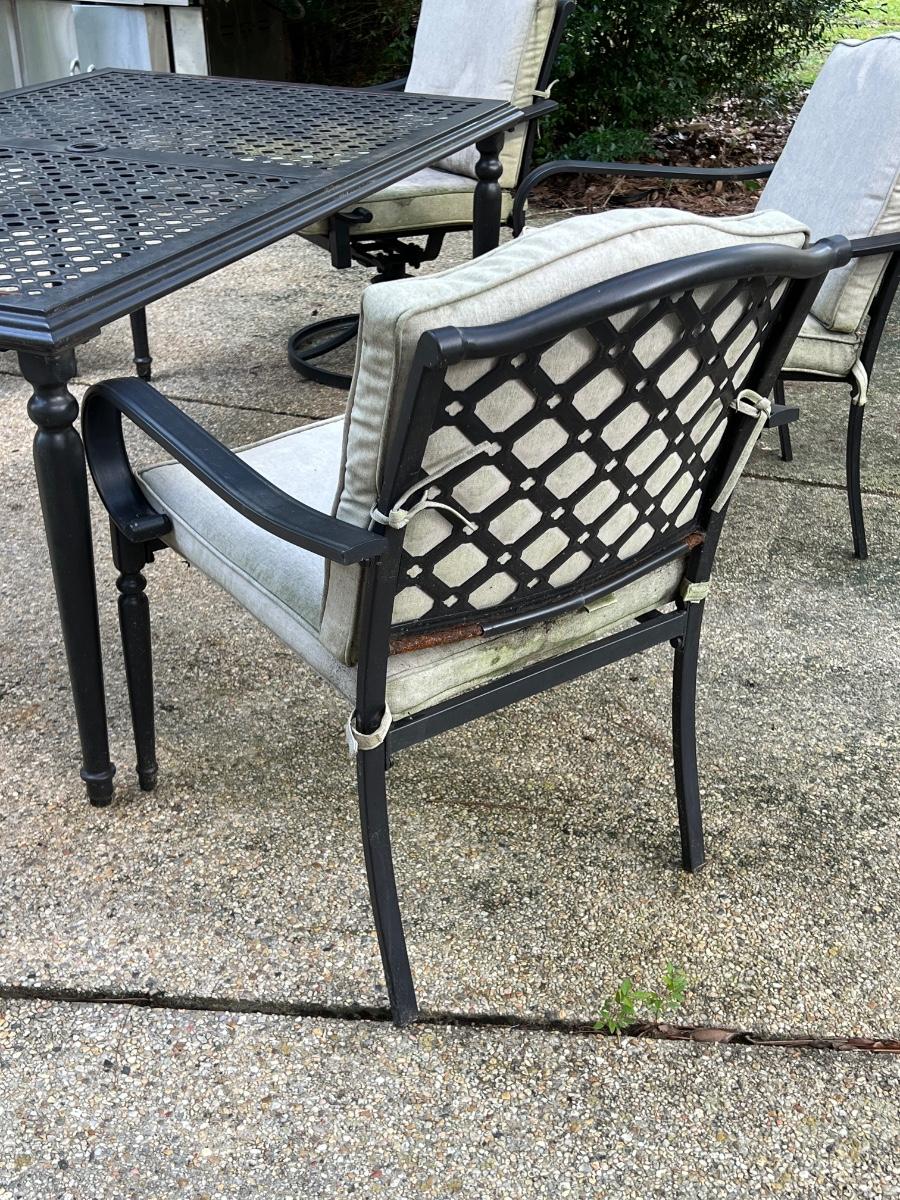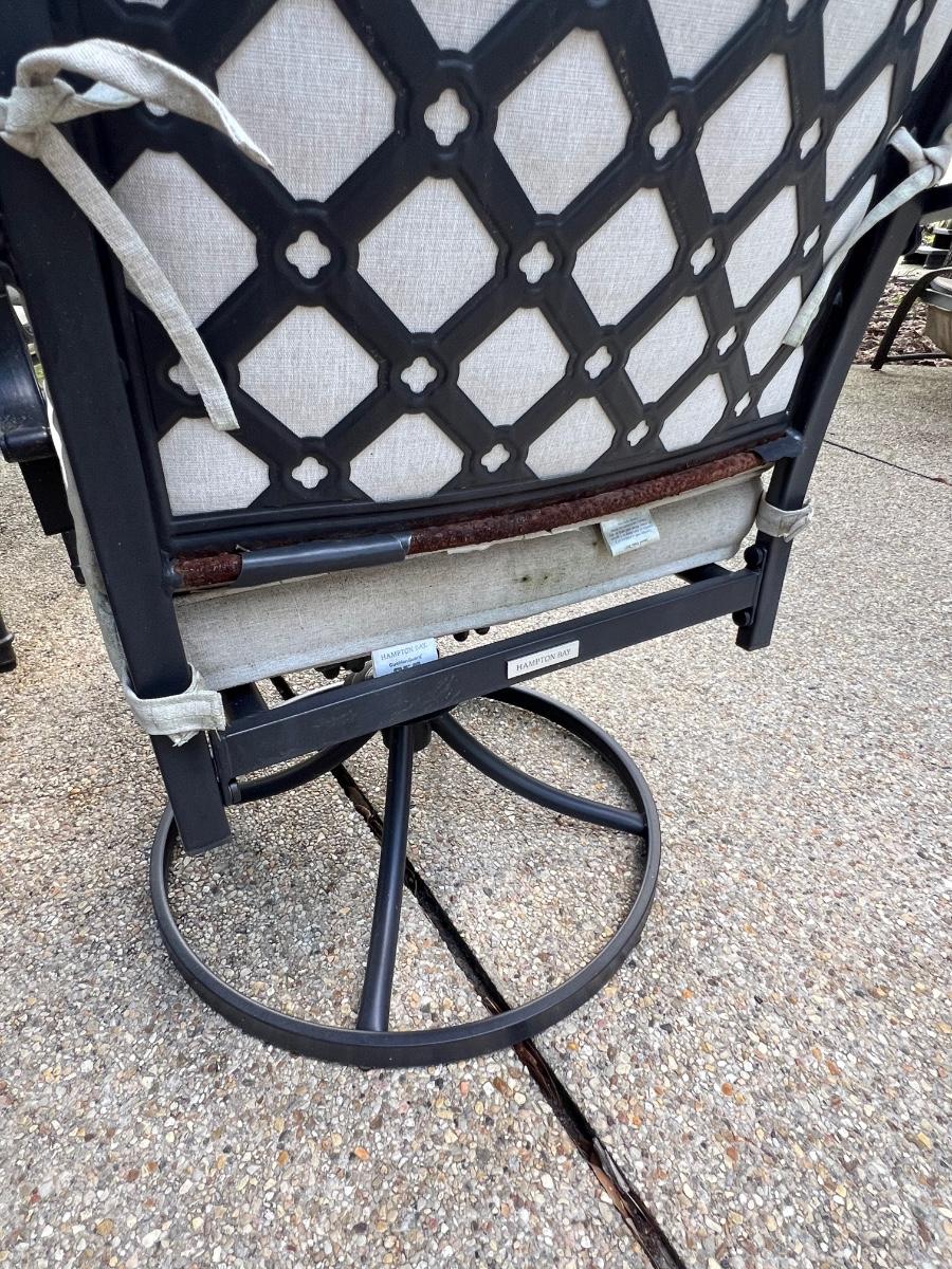 Set includes: Table, 2 swivel rocking chairs, 4 regular chairs ~ Has surface rust, cushions need cleaning or replacing, see photos for condition ~ Table = 28” H x 40” W x 64” D