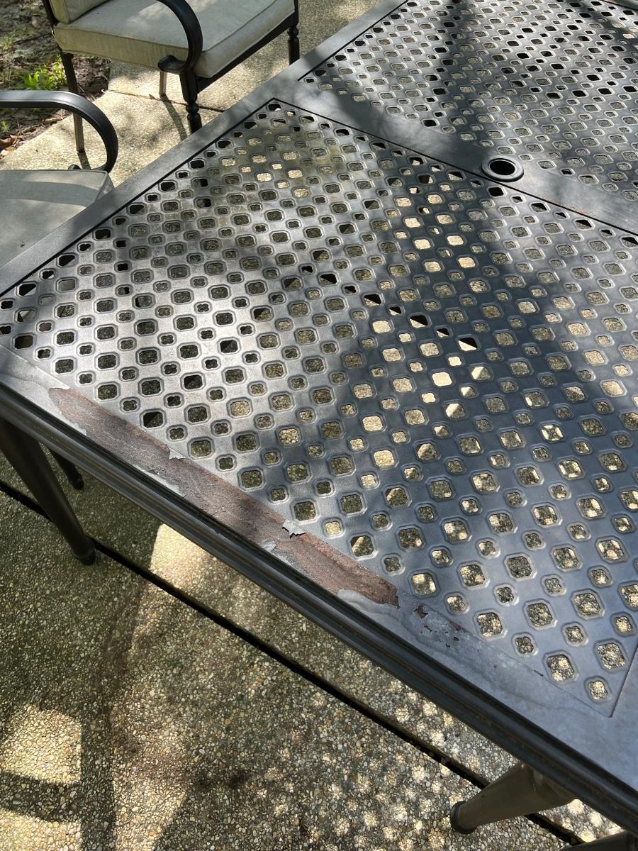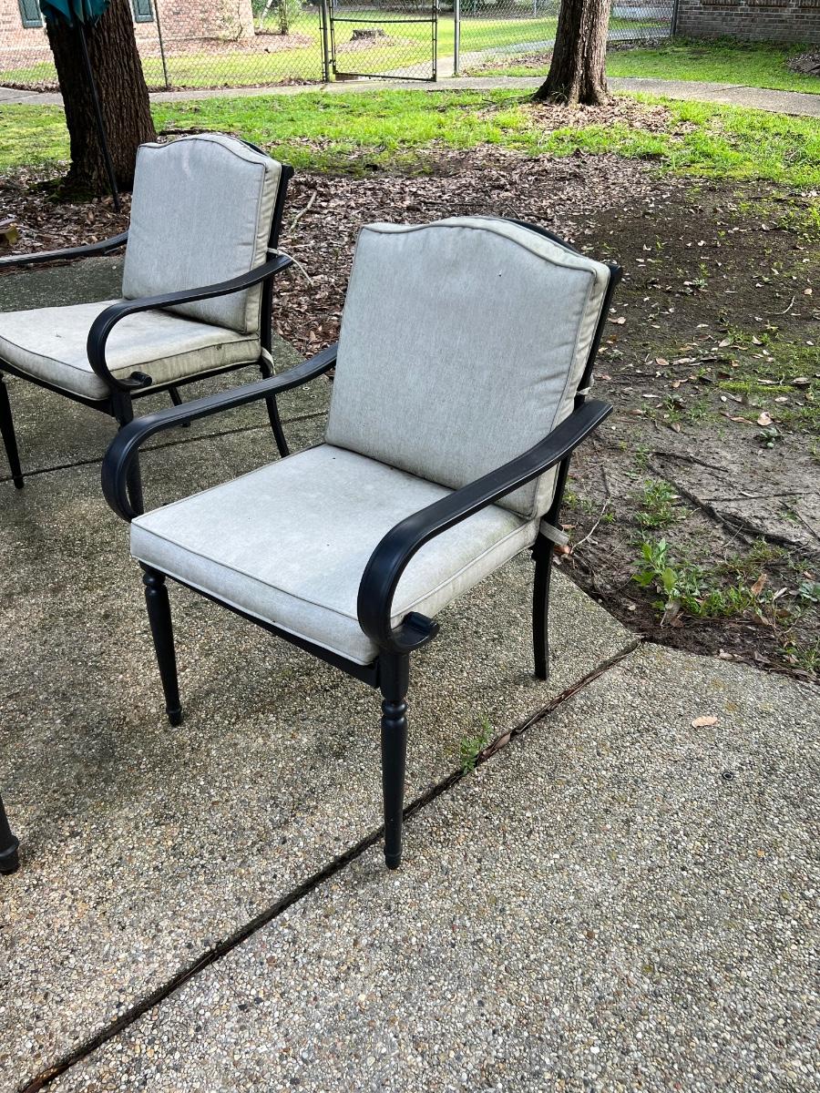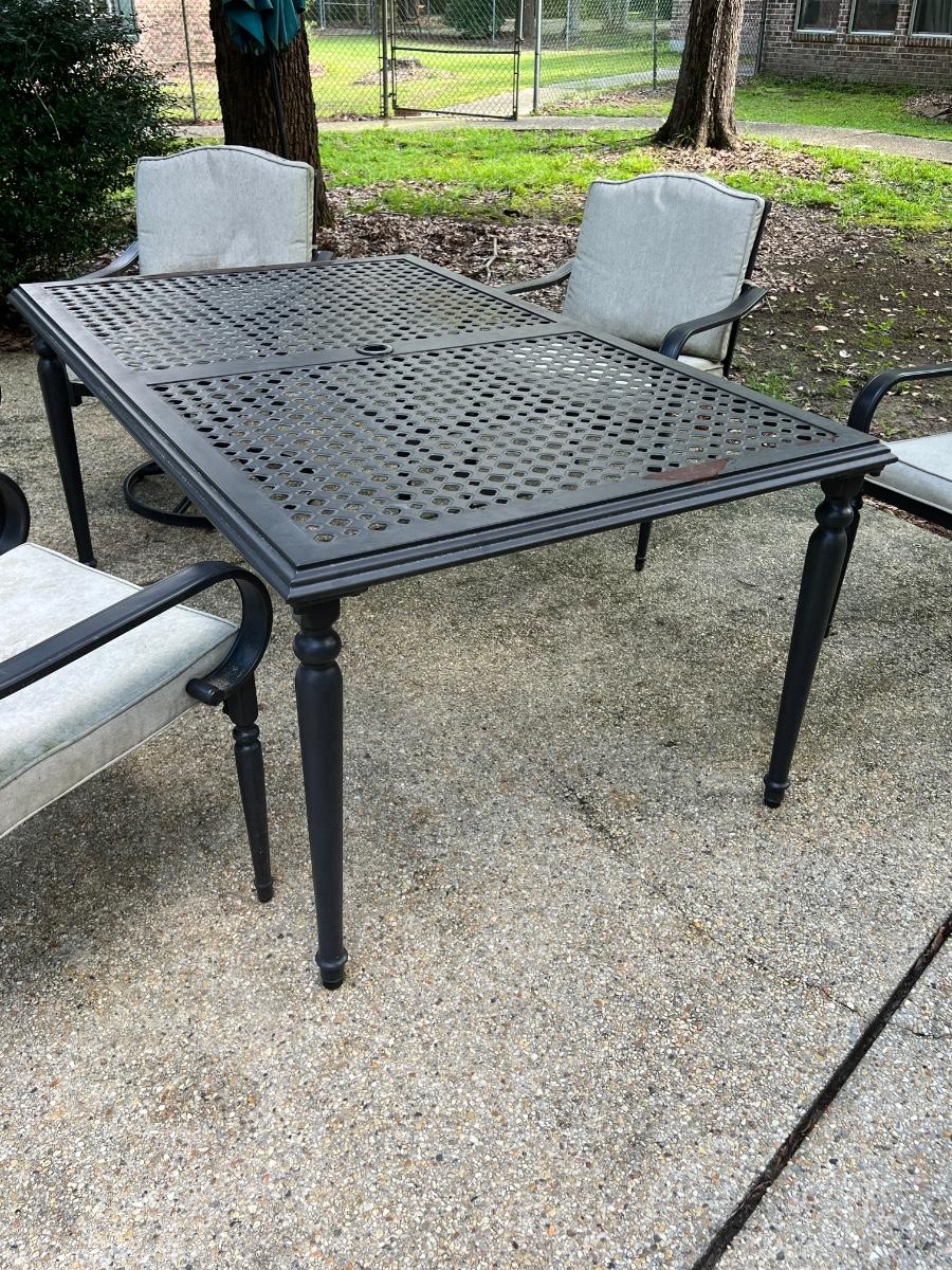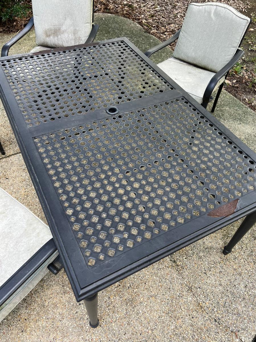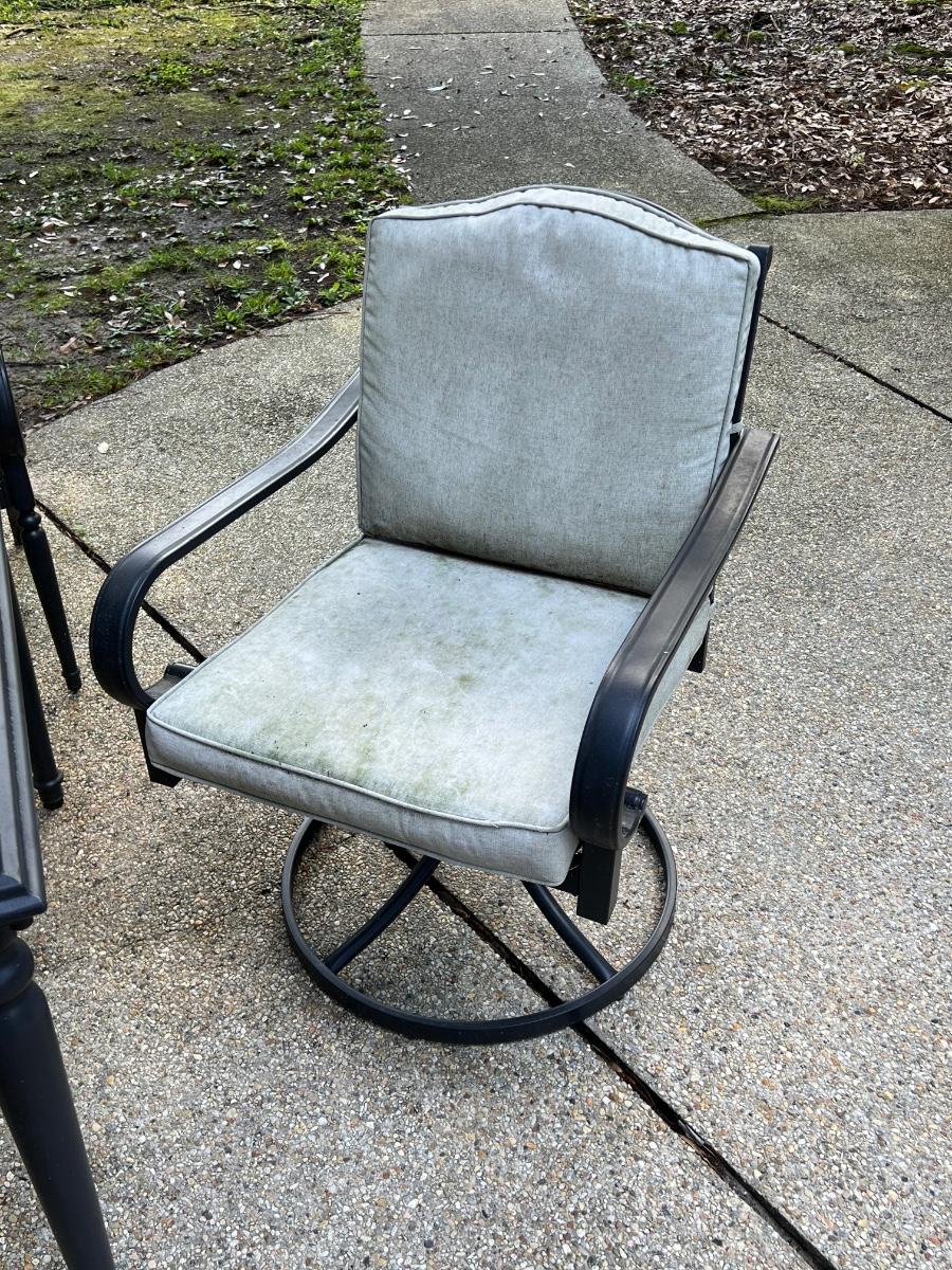 Set includes: Table, 2 swivel rocking chairs, 4 regular chairs ~ Has surface rust, cushions need cleaning or replacing, see photos for condition ~ Table = 28” H x 40” W x 64” D