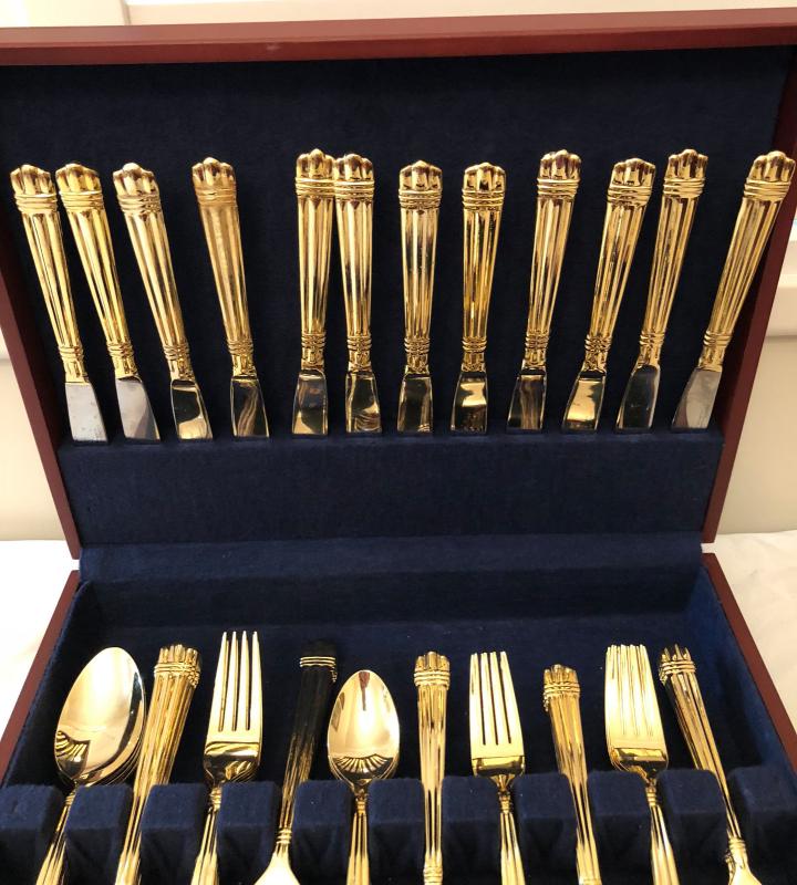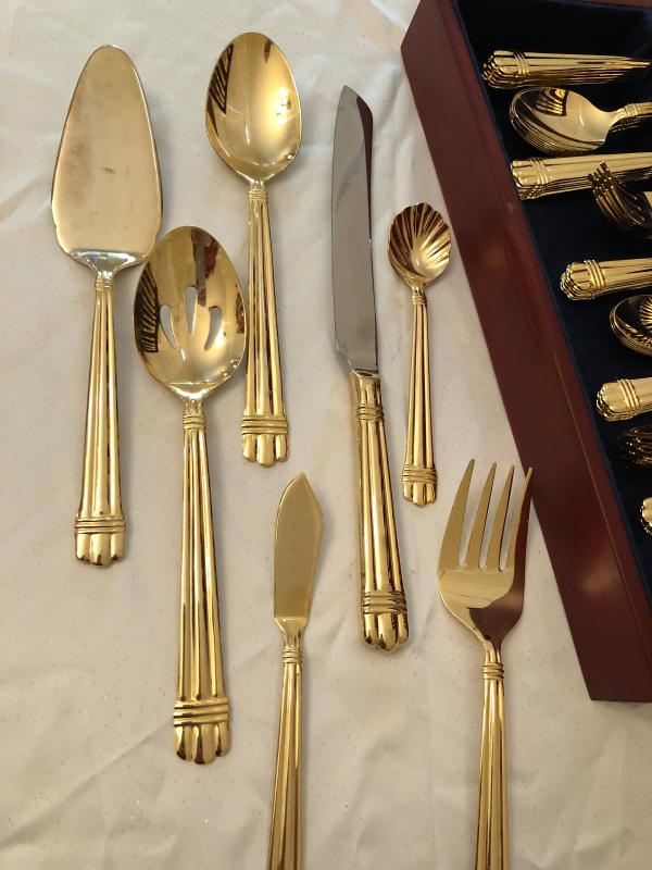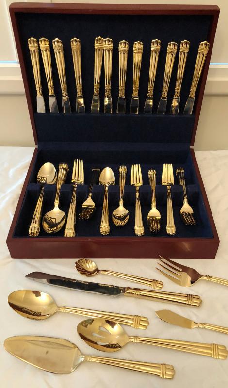 5 place setting, service for 12 with serving pieces. Gold toned. Some wear of a few pieces. Comes with wood storage case.