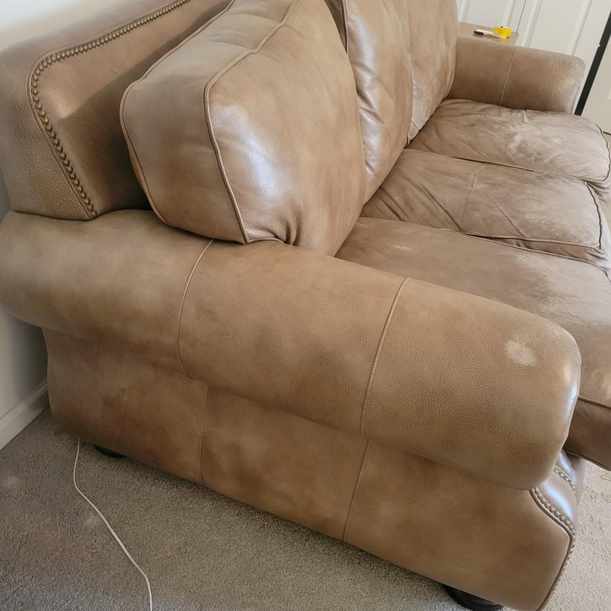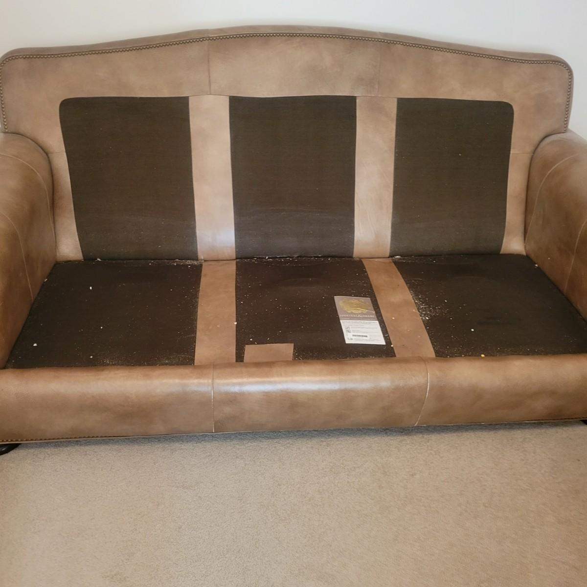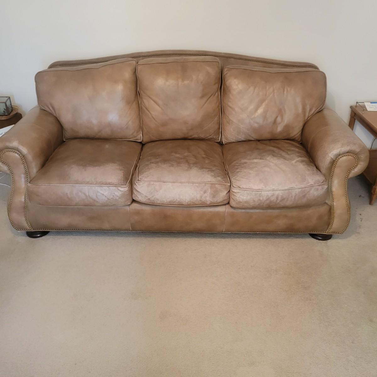 A leather couch manufactured by Hancock and Moore. This couch has removable cushions that are held in place by velcro. The leather in a medium brown color that does show some wear. It measures approximately 84" x 44" x 35"H. Local pickup only. Winning bidder must bring assistance to help move and load this item due to its weight and/or size.
