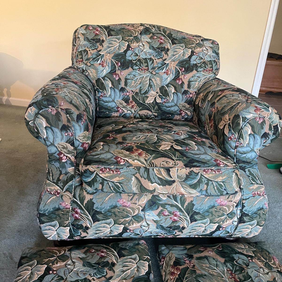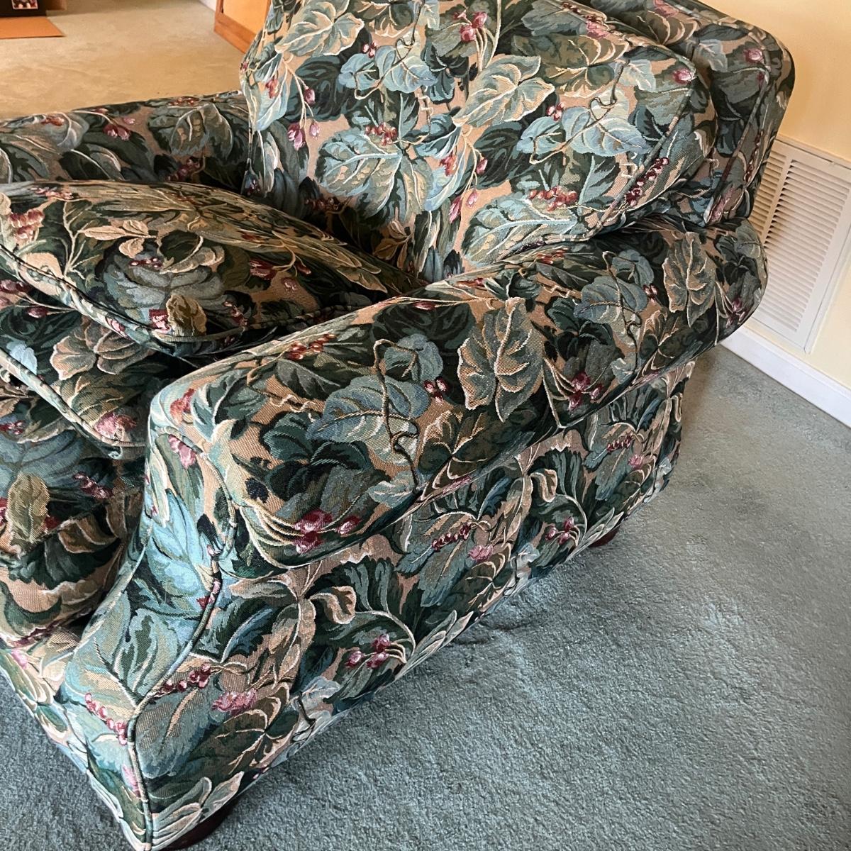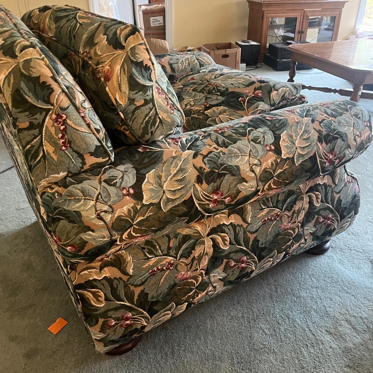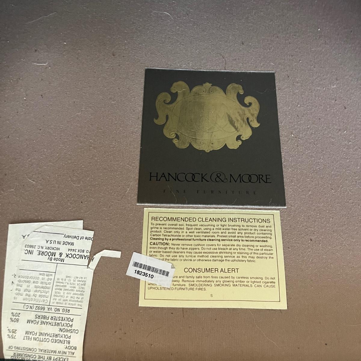Lot includes a Hancock & Moore Upholstered chair with a floral design. Also includes two matching pillows and two arm covers. Chair measures 41” x 41” x 34”H with a 18” seat height. Item is down one flight of stairs.