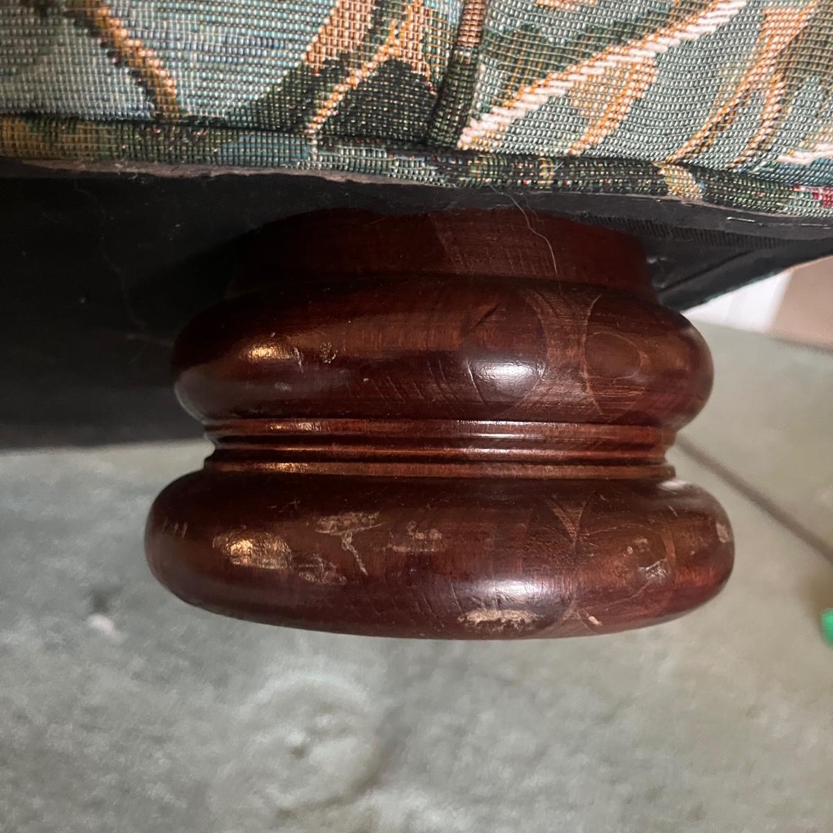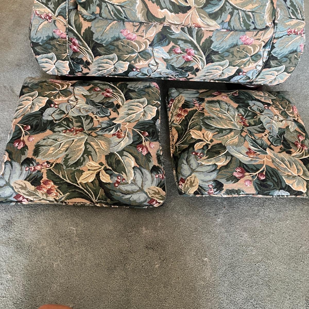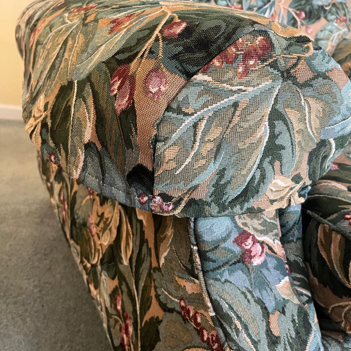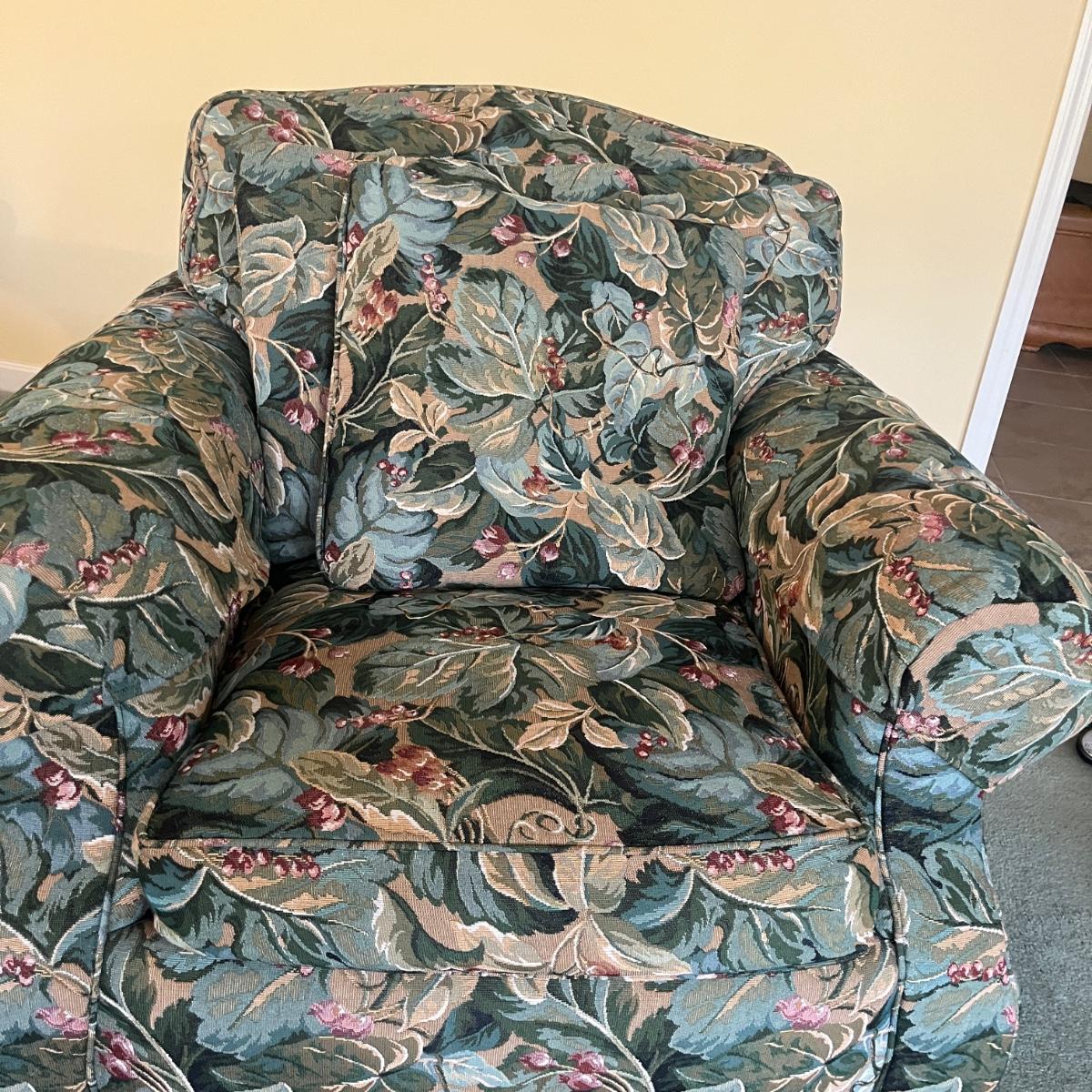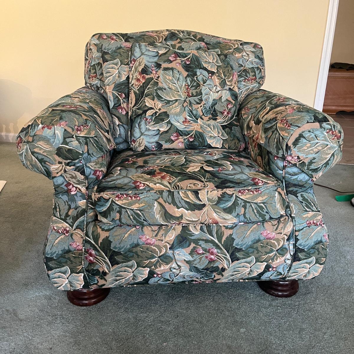 Lot includes a Hancock & Moore Upholstered chair with a floral design. Also includes two matching pillows and two arm covers. Chair measures 41” x 41” x 34”H with a 18” seat height. Item is down one flight of stairs.