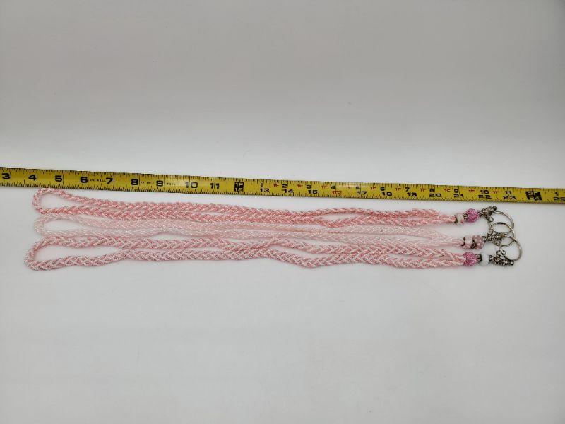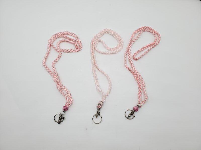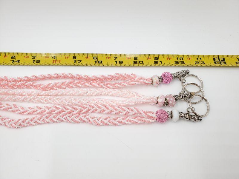 Lot of 3 hand beaded lanyards, approximately 18in long with various shades of pink with white glass beads. Very pretty!!