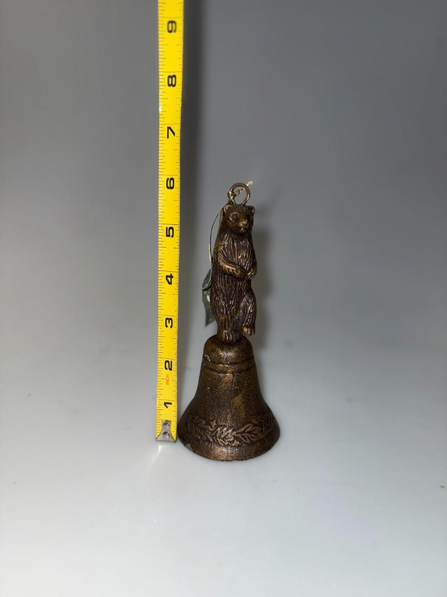 This delightful hand bell features a charming brass dancing bear adorned with intricate oak leaf trim. Standing at 6 inches tall, this unique piece combines whimsical design with functional artistry. The bell produces a clear, lovely sound, making it perfect for use or display. Ideal as a decorative accent in your home or as a fun gift for bear lovers, this hand bell adds a touch of rustic charm to any collection.