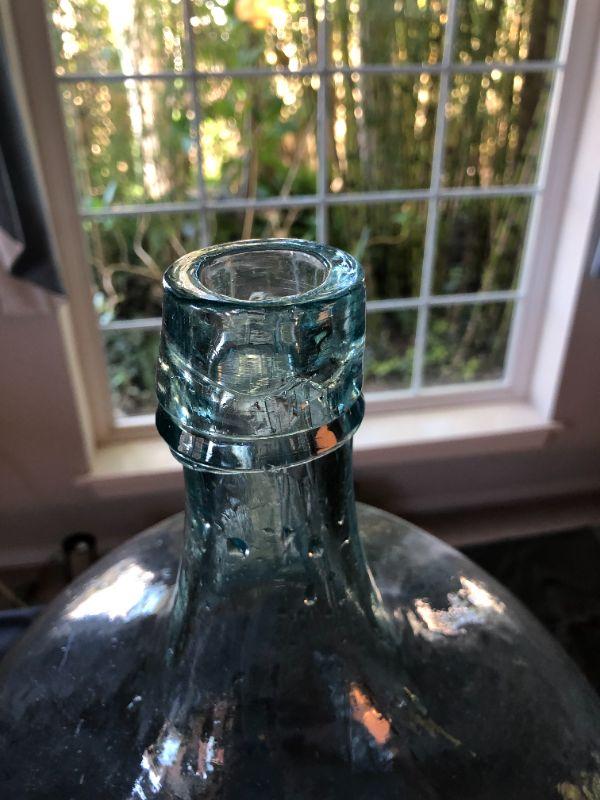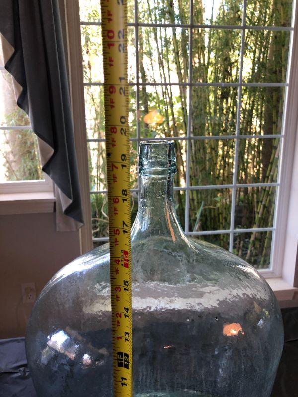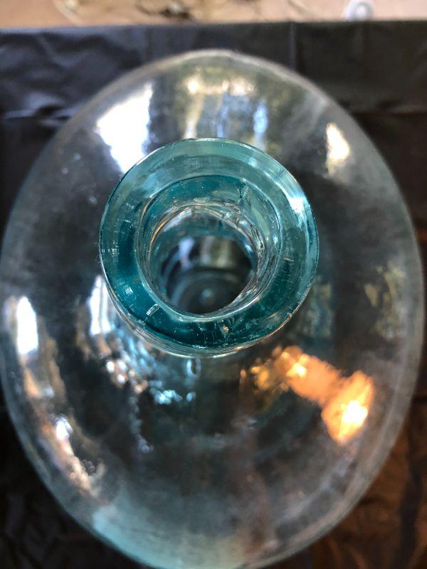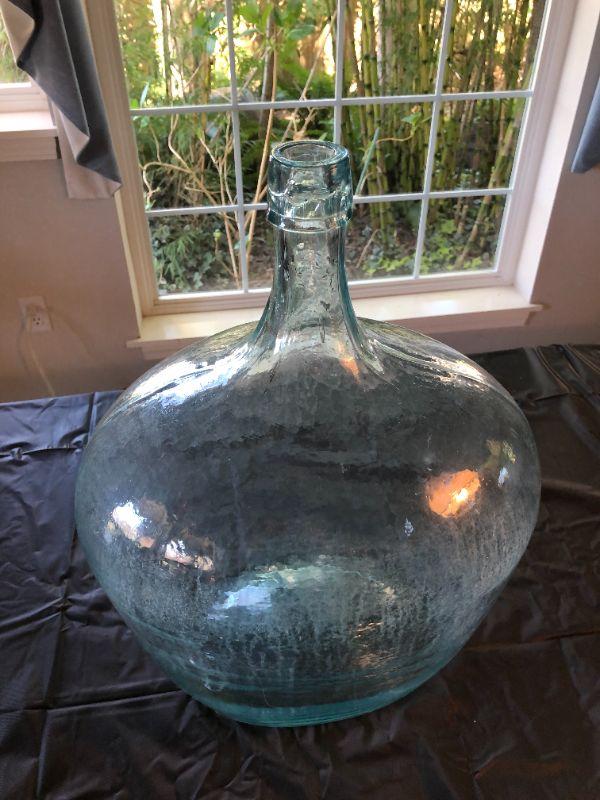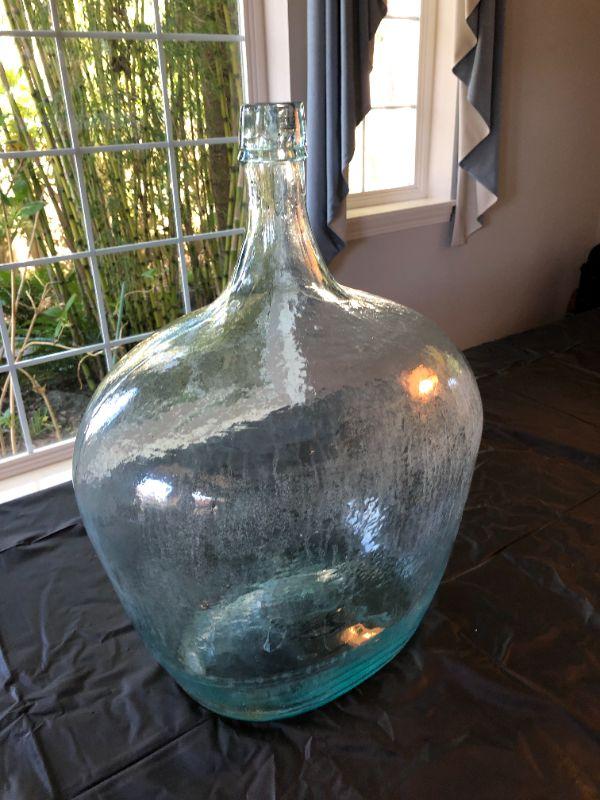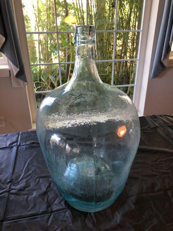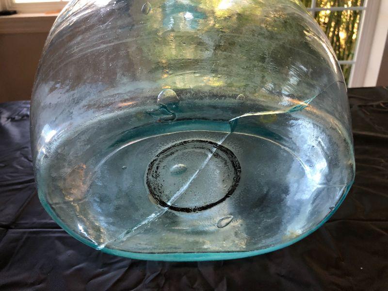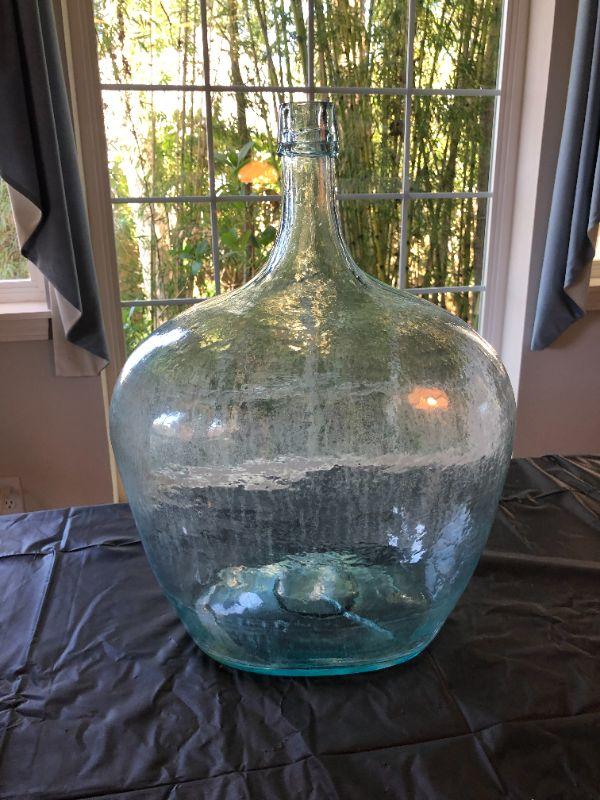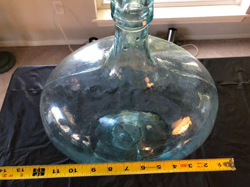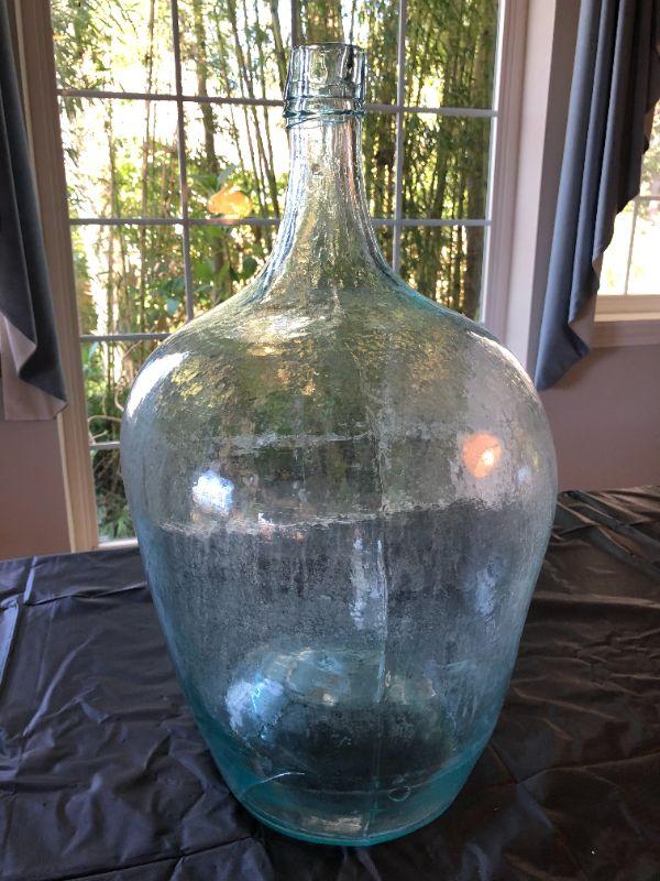 Beautiful hand blown 20 inch tall blue glass jug. Wonderful home decor. There is a crack on the bottom, shown in photos.