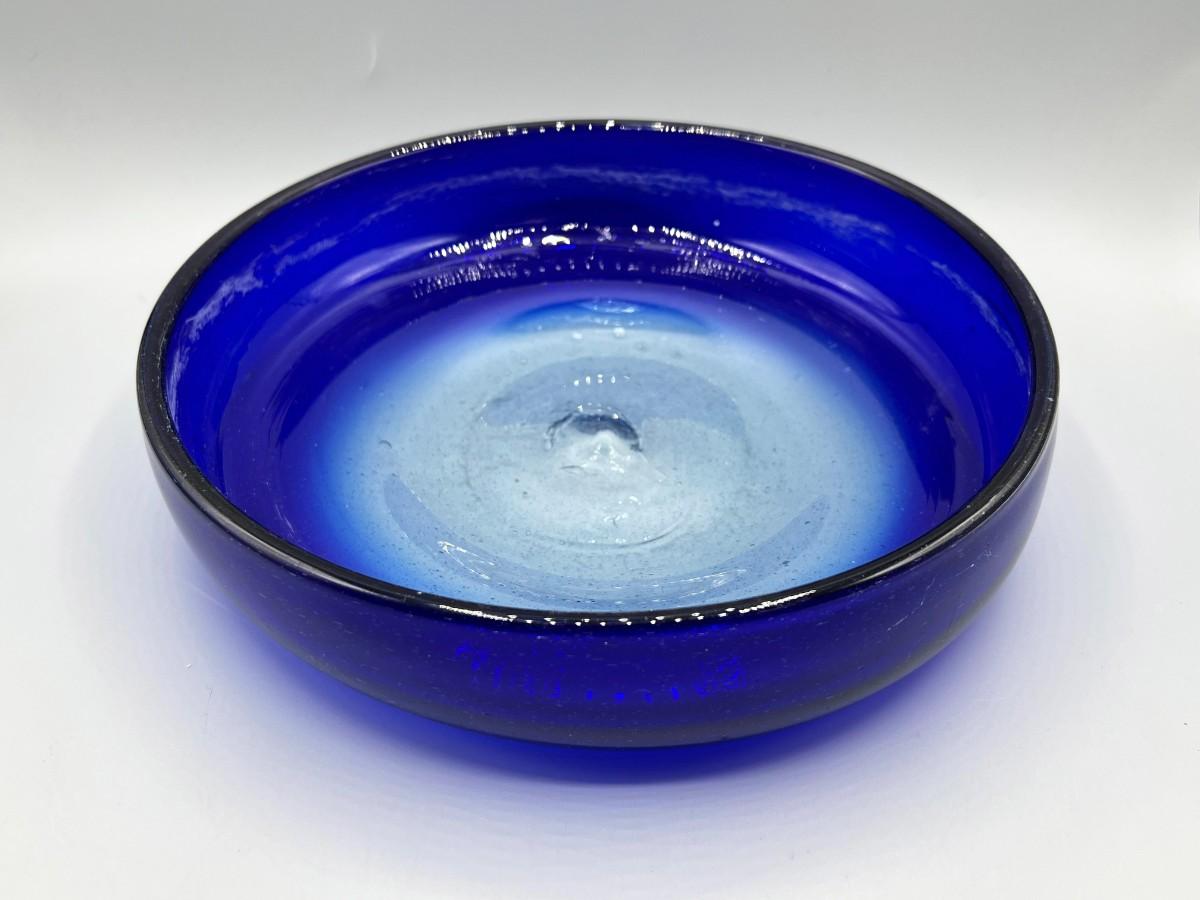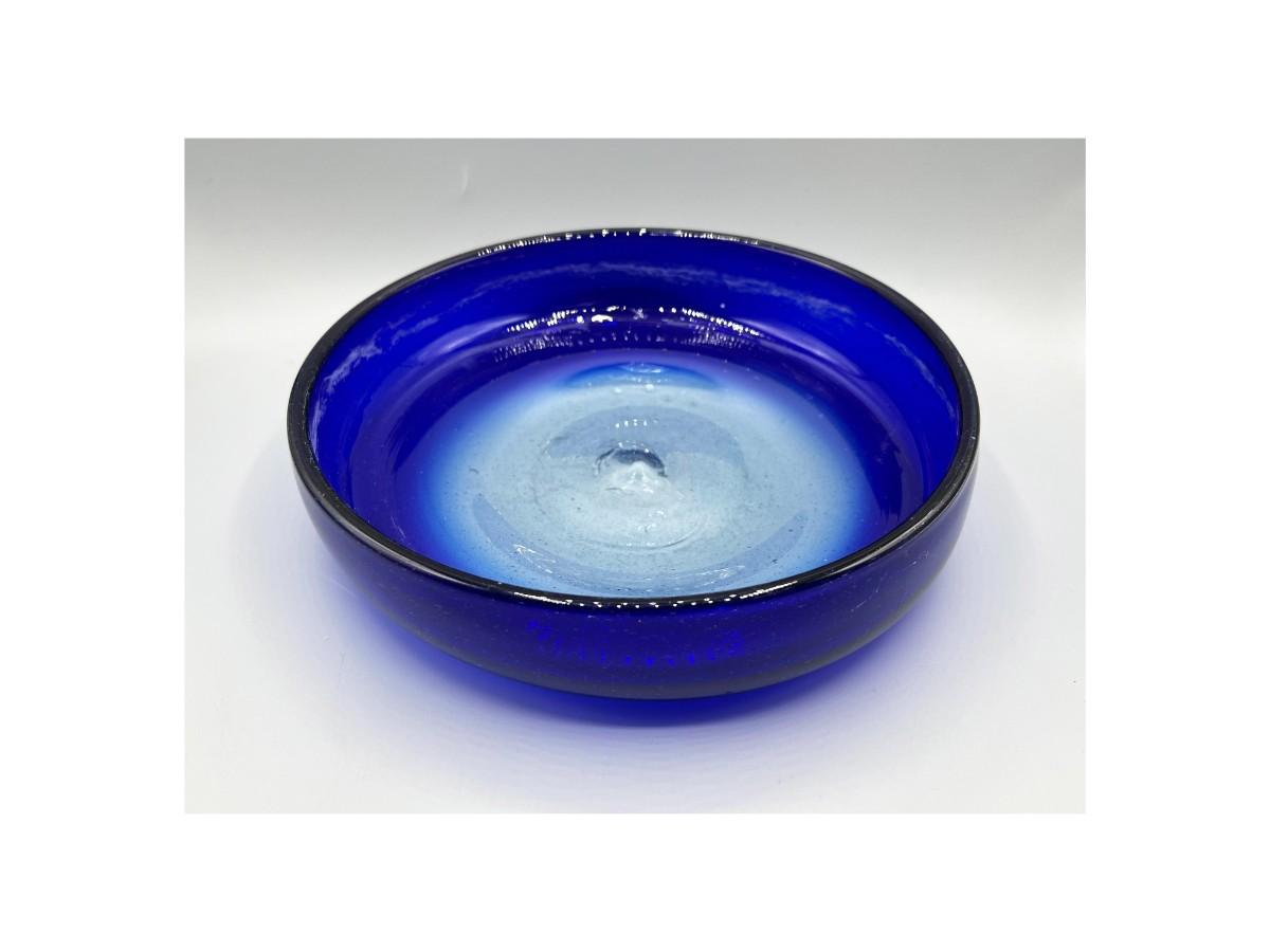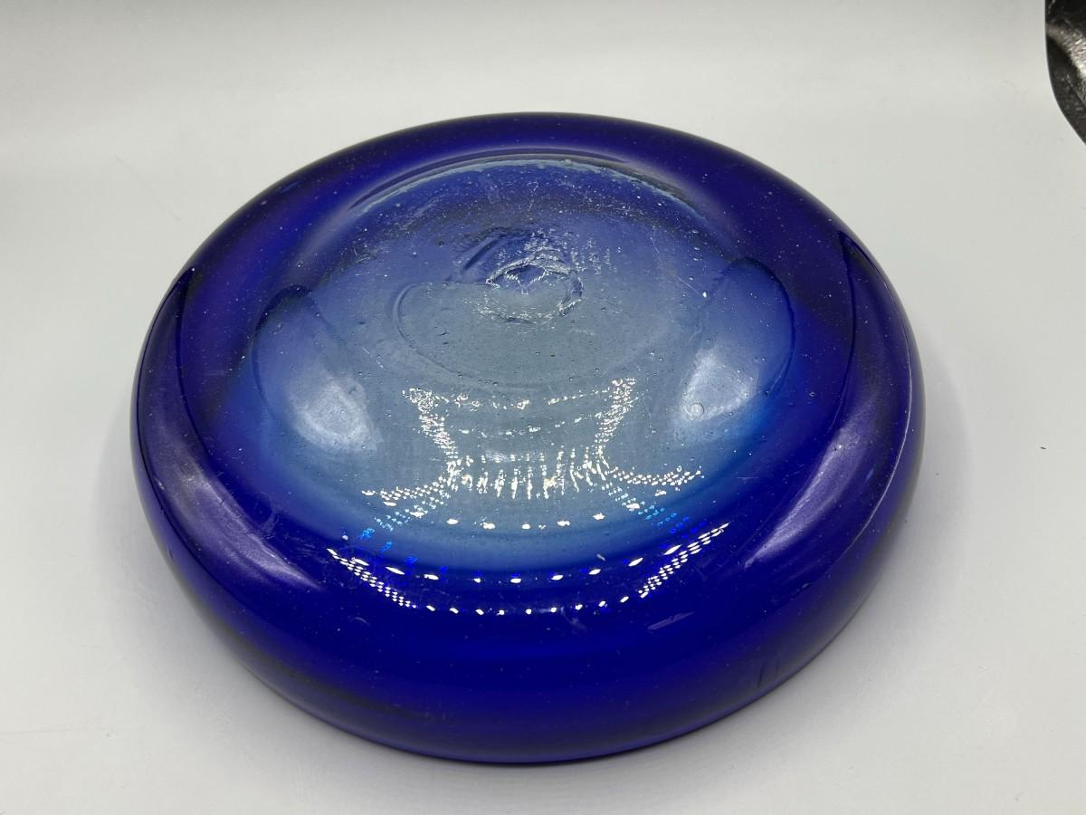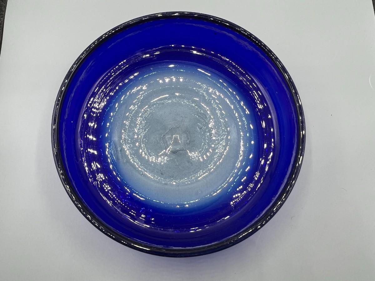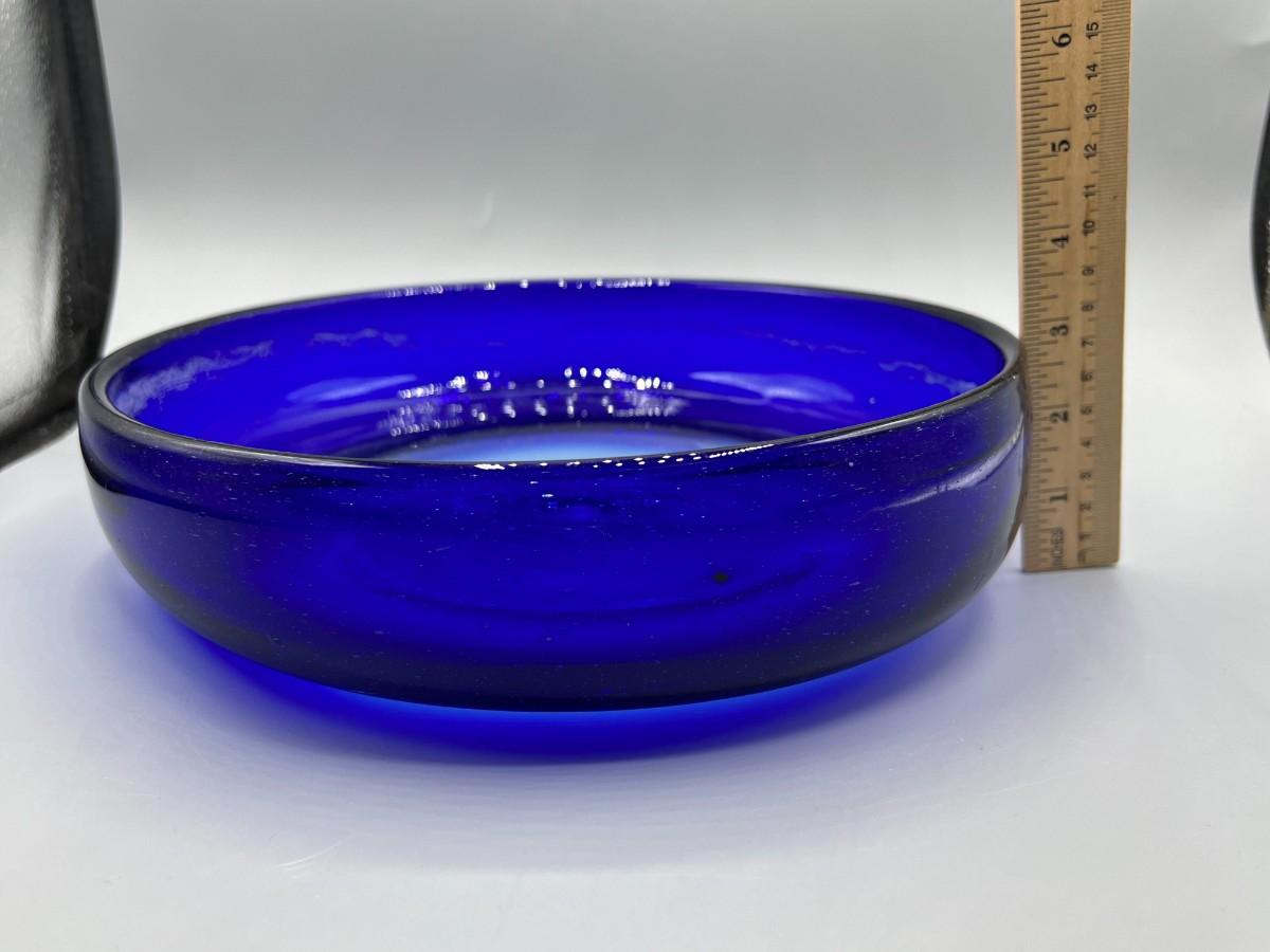 Hand Blown Blue Glass Bowl, there is some light wear, but there is no significant damage to the bowl and is in good useable condition. Check pictures for more details and for sizing.