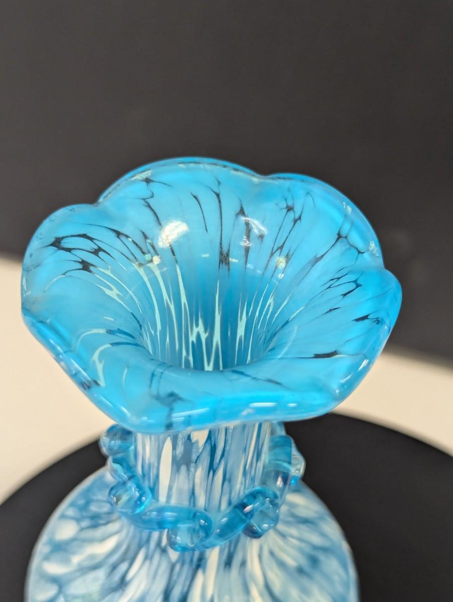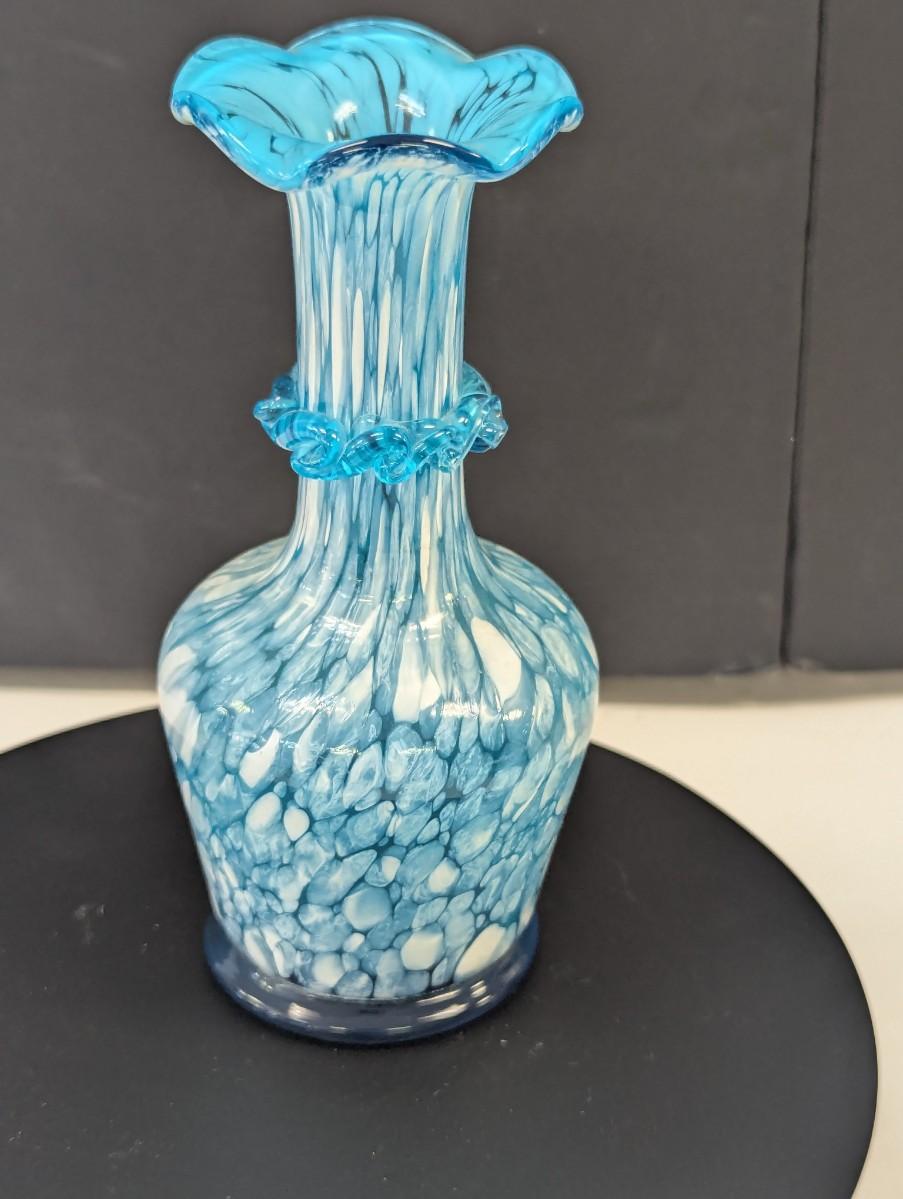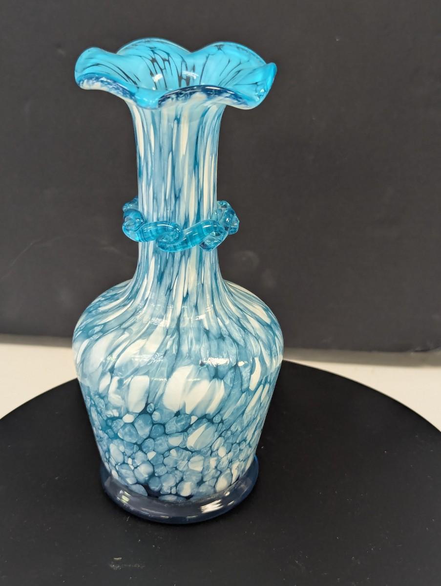 Hand Blown Blue Splatter Art Glass w/ Ruffle Top