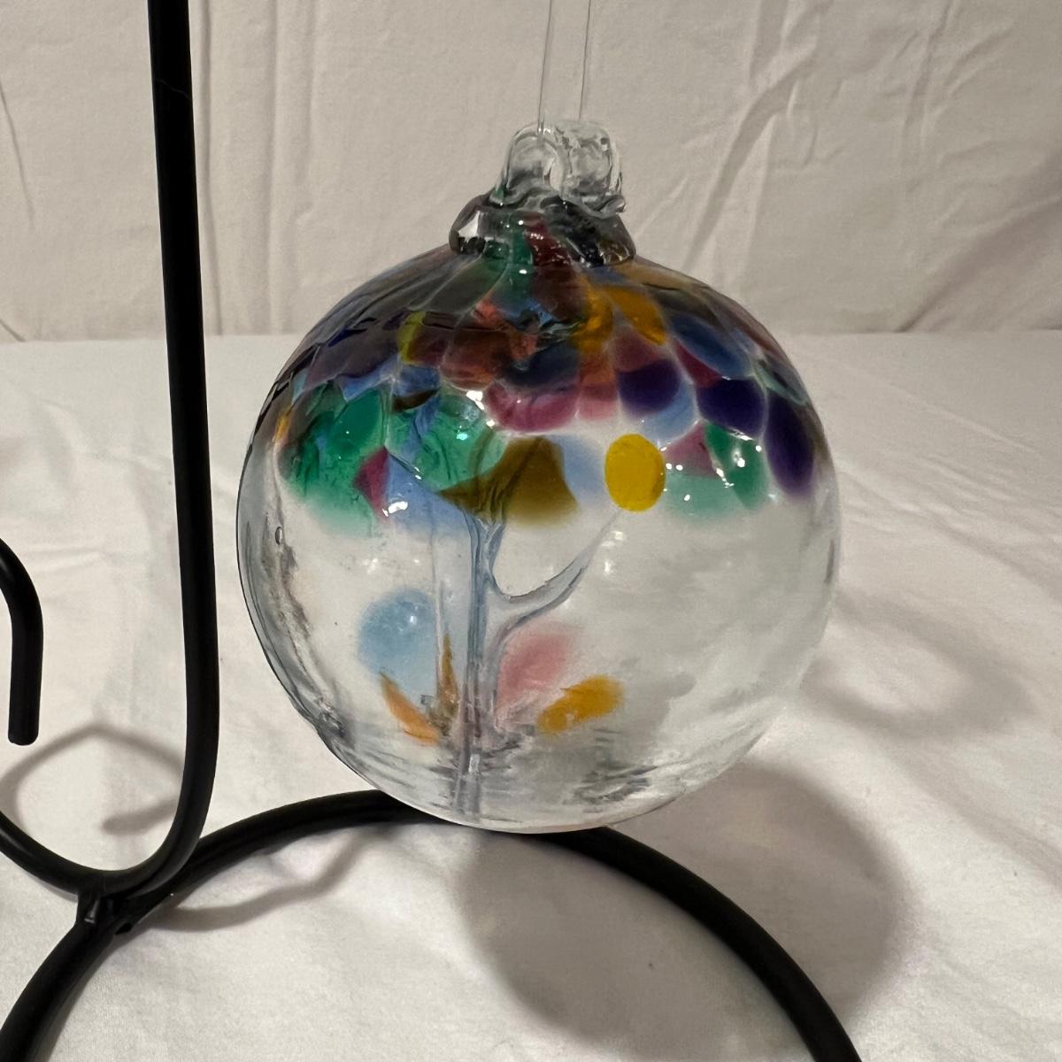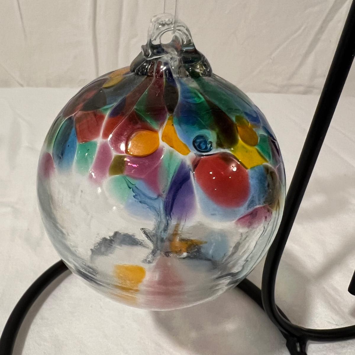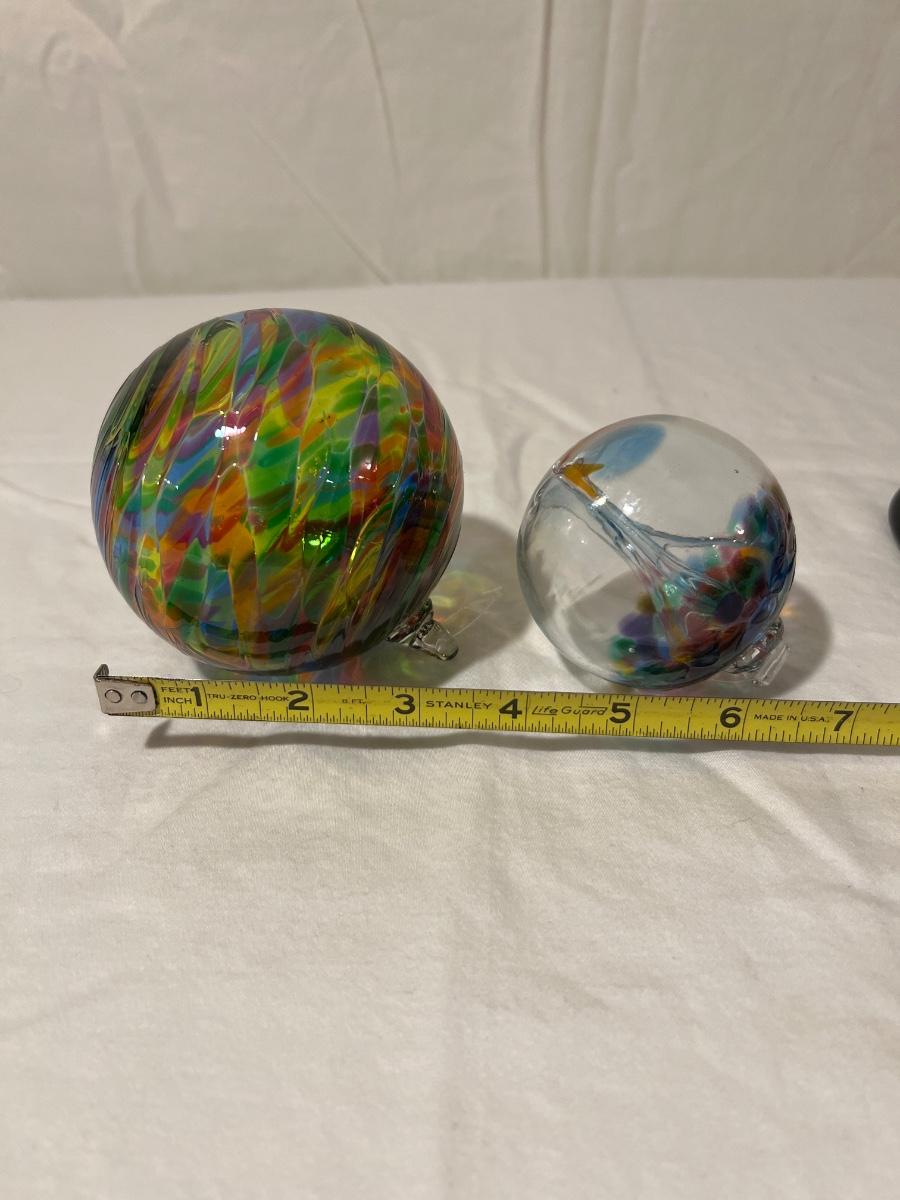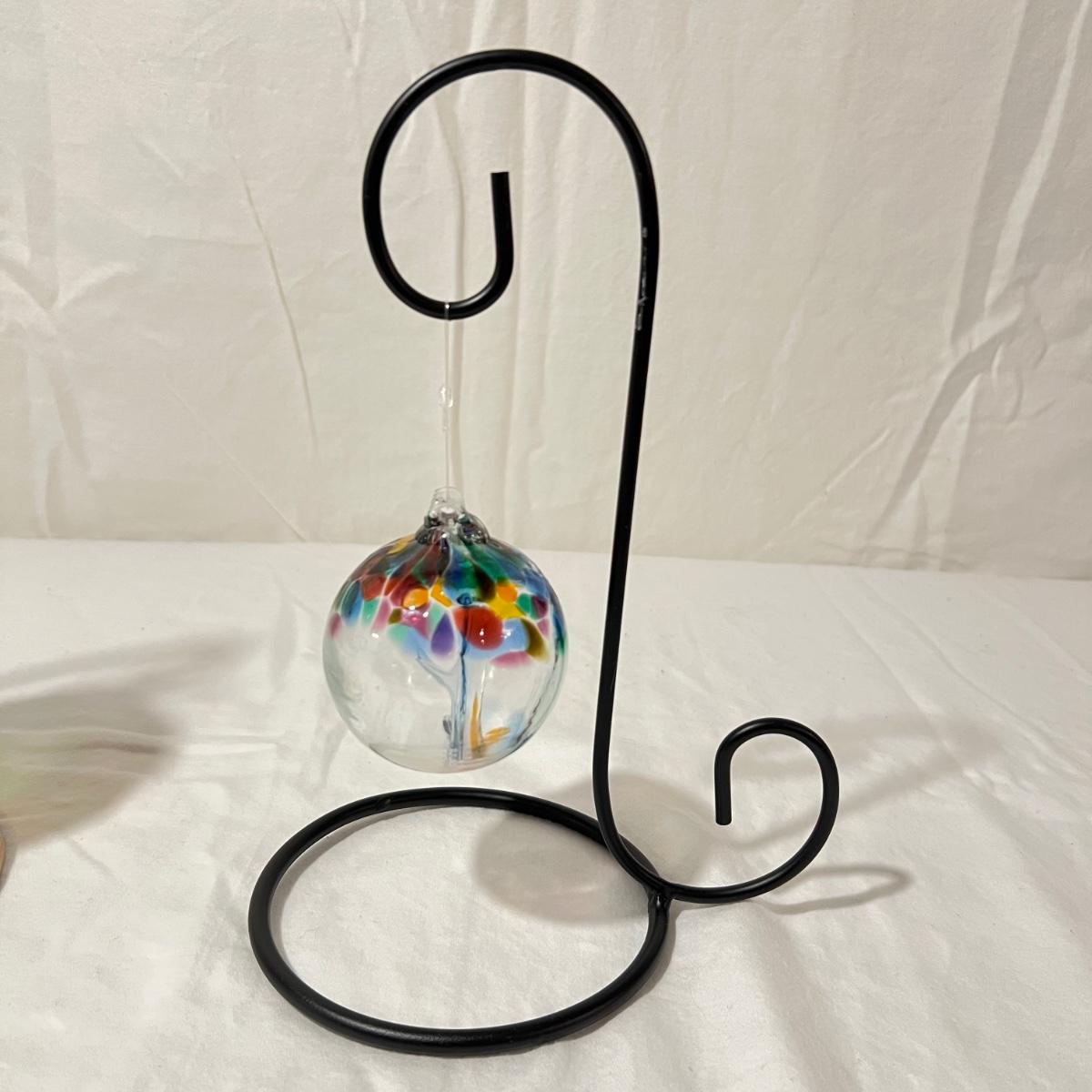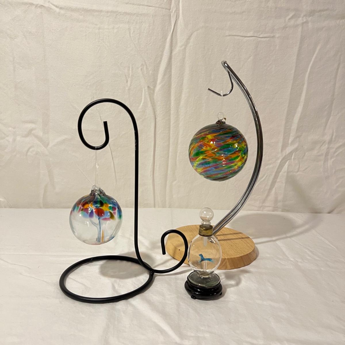 Three hand blown glass ornaments in this lot. The smaller of the two balls appears to be a “˜Tree of Celebration’ as inside of the ball has an incredibly delicate pale blue glass blown tree. The larger glass ball has swirls of color and comes with its box from John Michael Kohl Art Center. The black metal stand comes with this lot, the wooden based stand is not included. The third item appears to be a perfume bottle with a blue blown glass Dachshund. This bottle is partially glued onto a black lacquer wood base; please note that its stopper top does not come out, it might possibly with a good pull. This piece measures 2” D (base) x 4”H.