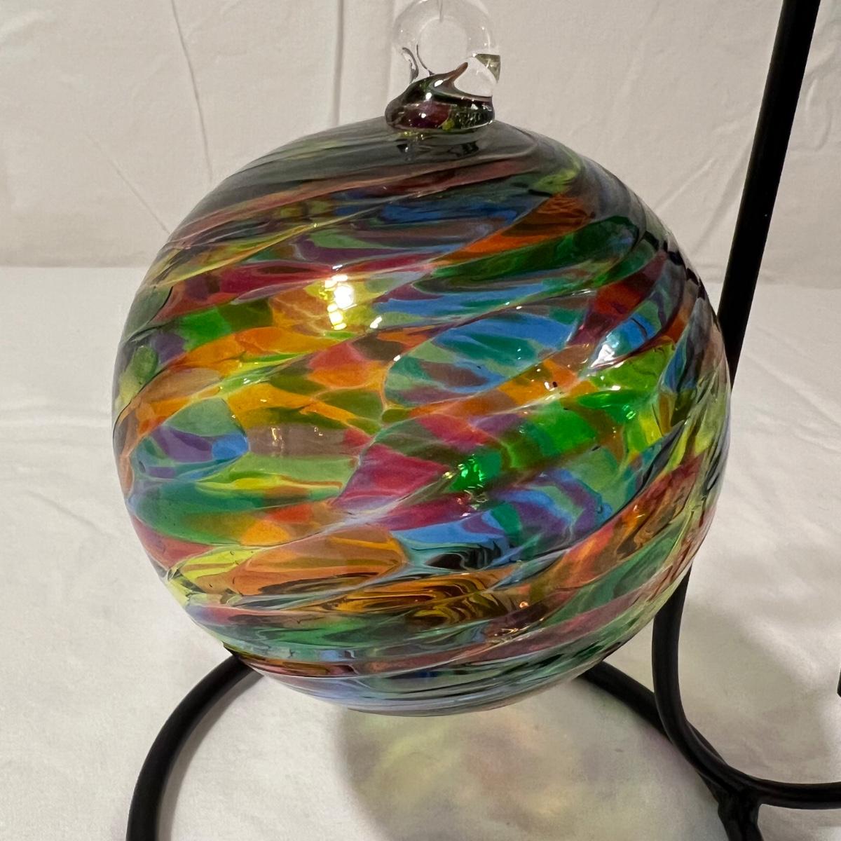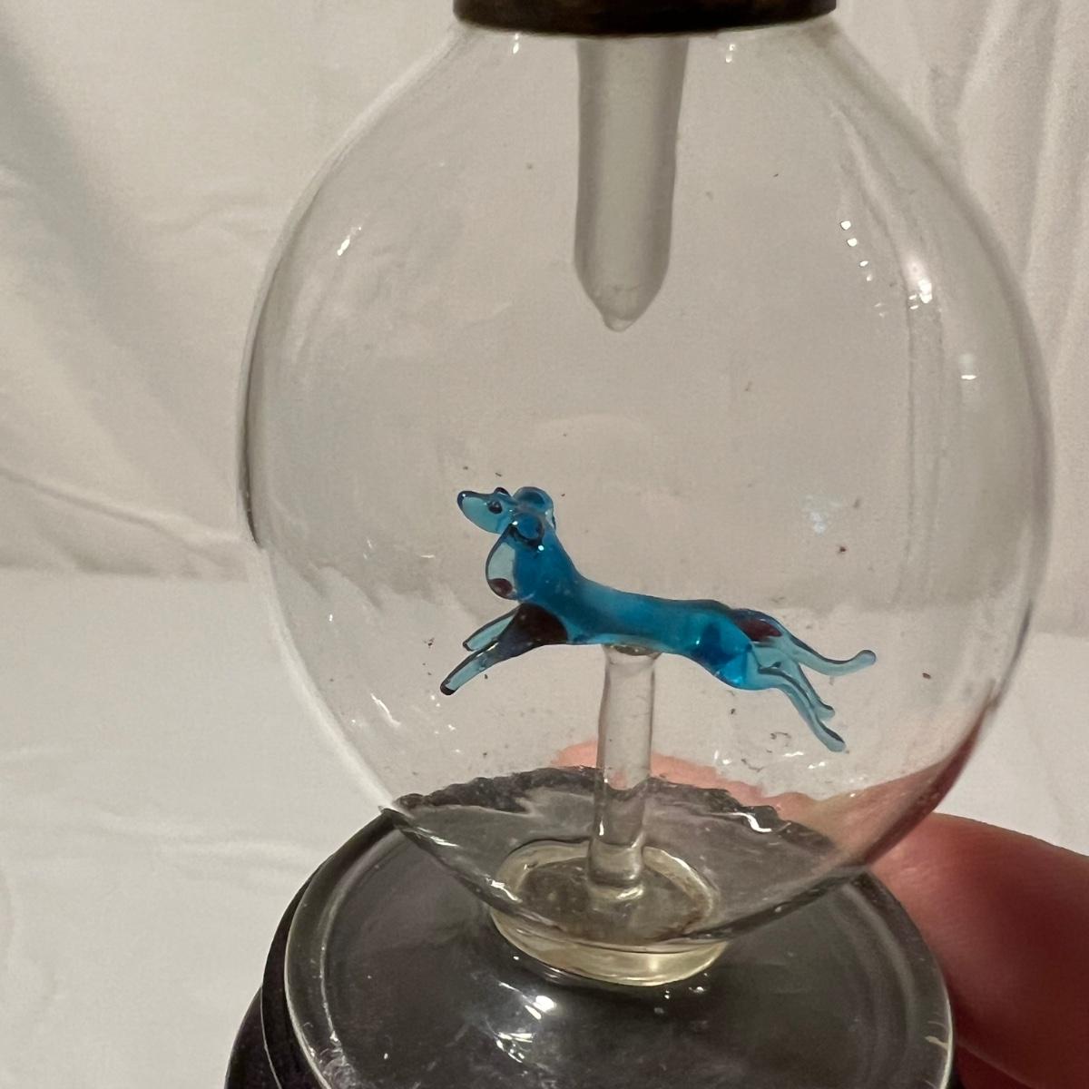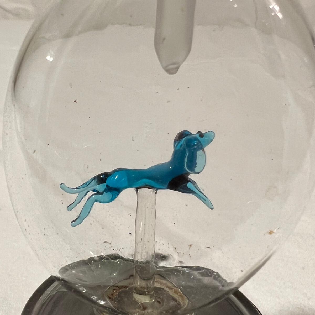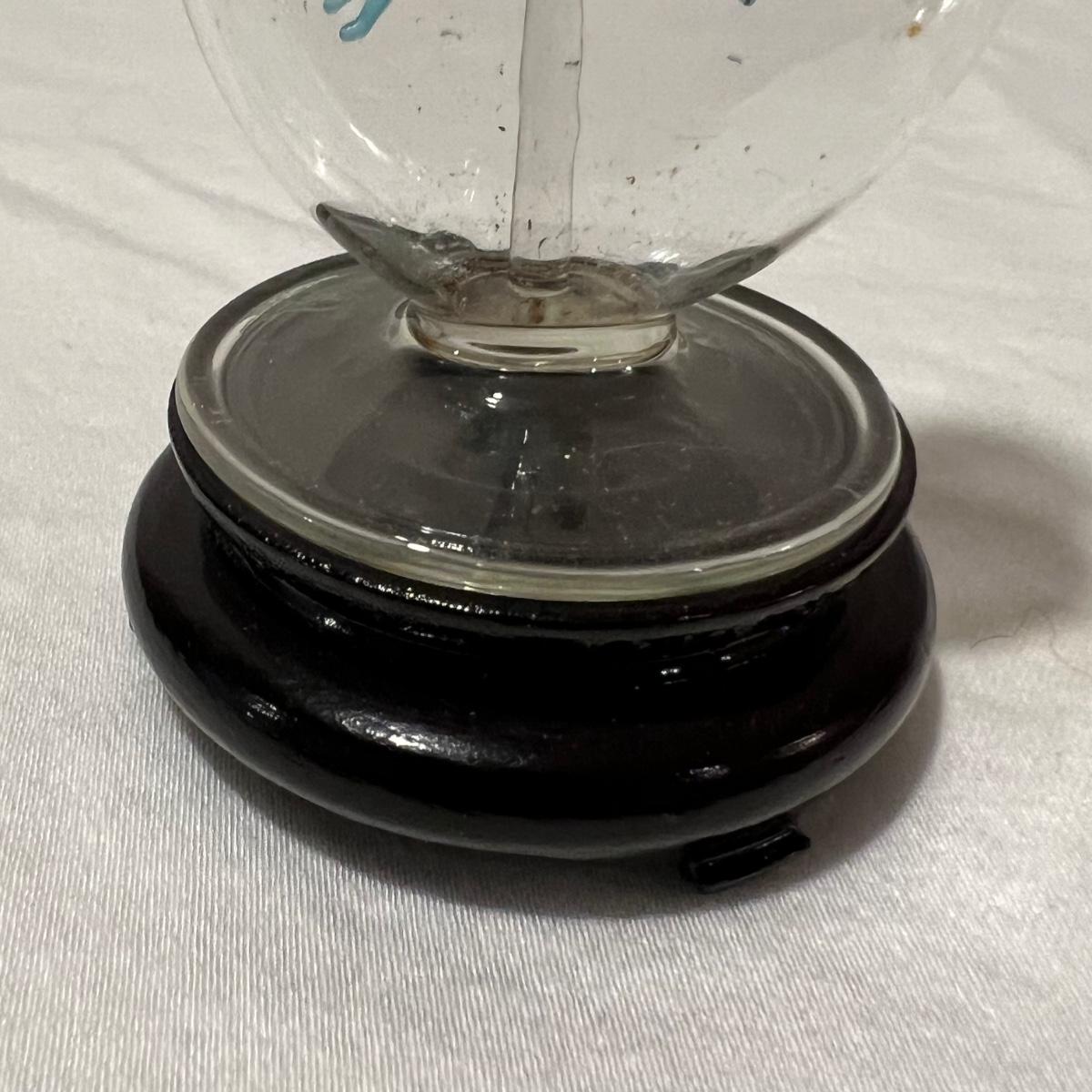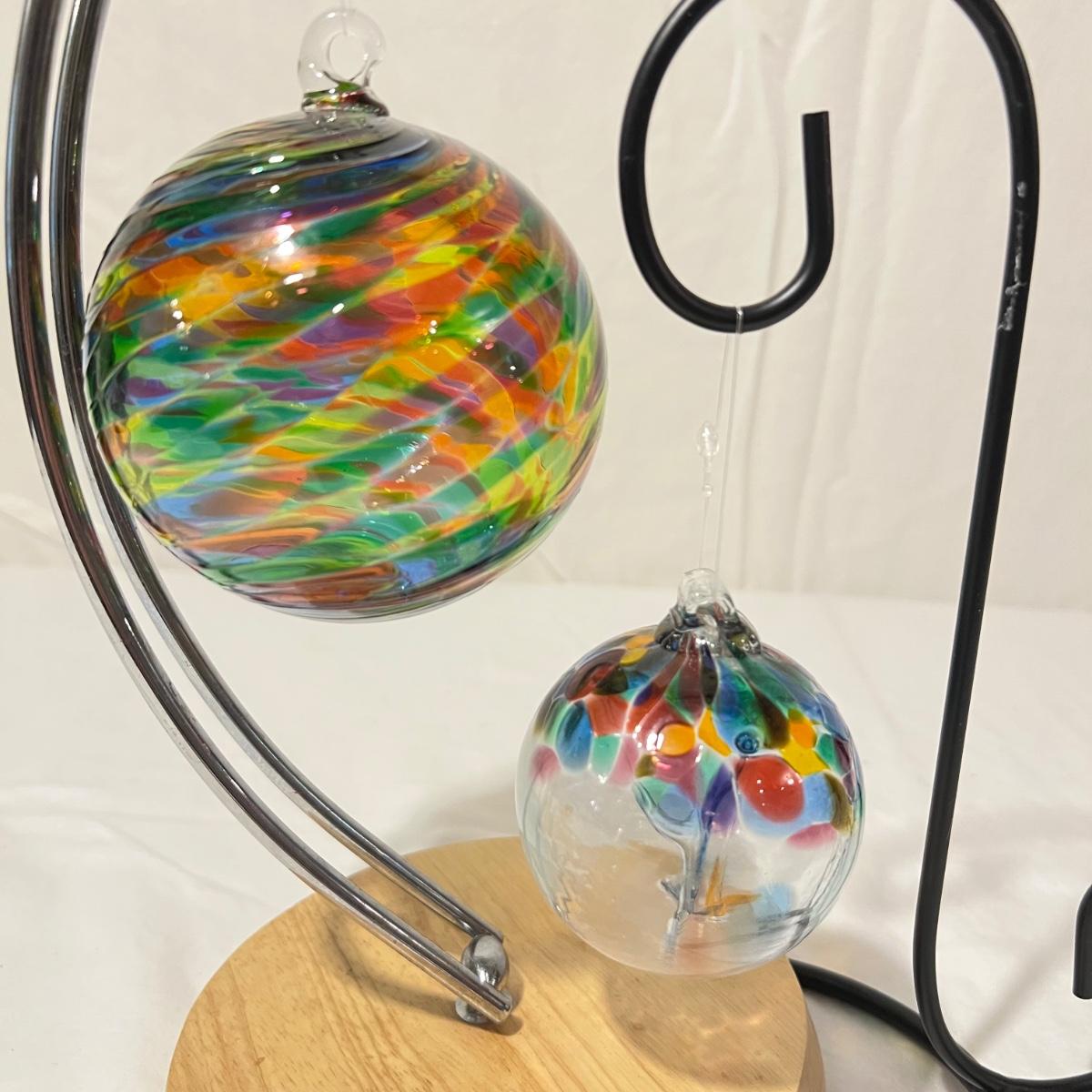 Three hand blown glass ornaments in this lot. The smaller of the two balls appears to be a “˜Tree of Celebration’ as inside of the ball has an incredibly delicate pale blue glass blown tree. The larger glass ball has swirls of color and comes with its box from John Michael Kohl Art Center. The black metal stand comes with this lot, the wooden based stand is not included. The third item appears to be a perfume bottle with a blue blown glass Dachshund. This bottle is partially glued onto a black lacquer wood base; please note that its stopper top does not come out, it might possibly with a good pull. This piece measures 2” D (base) x 4”H.