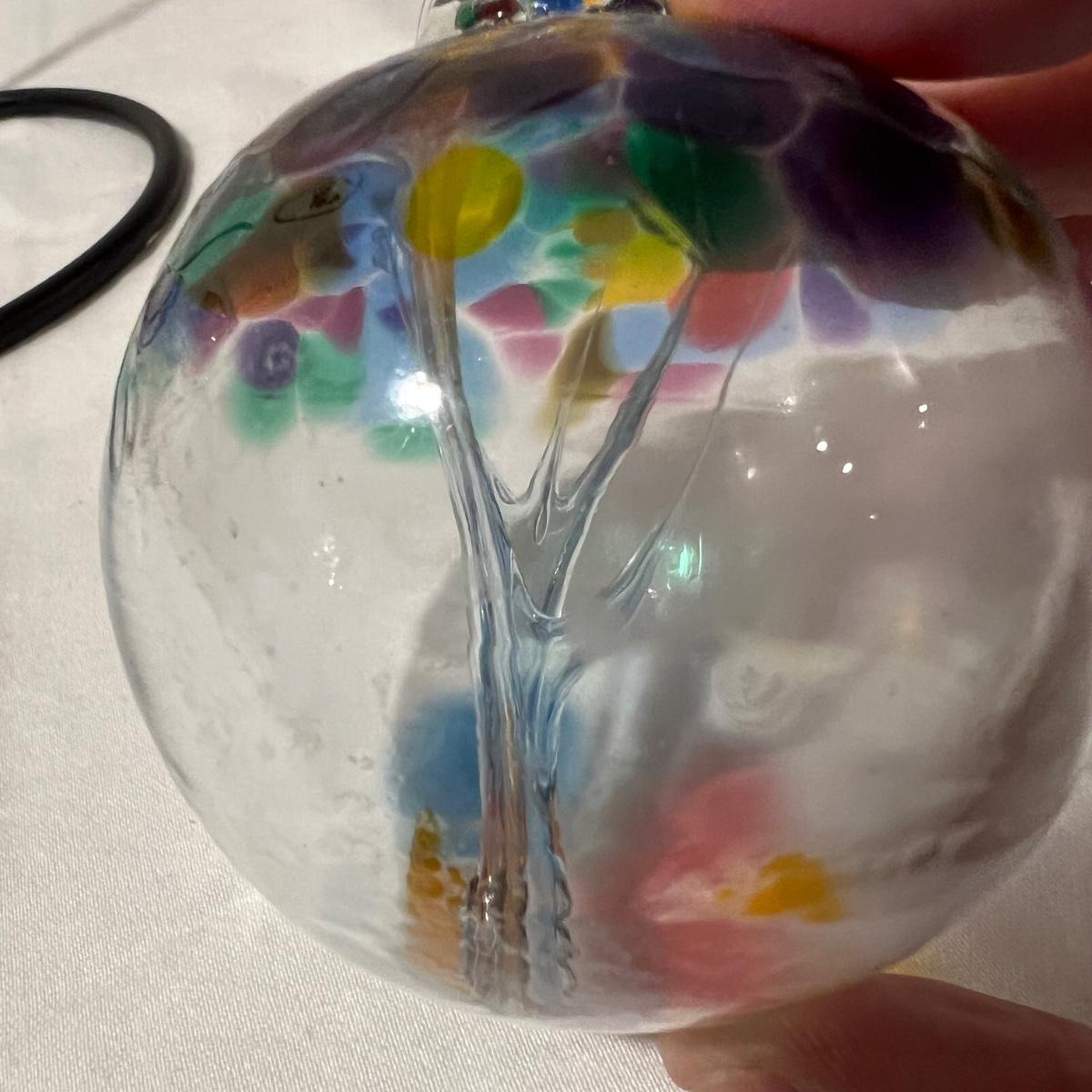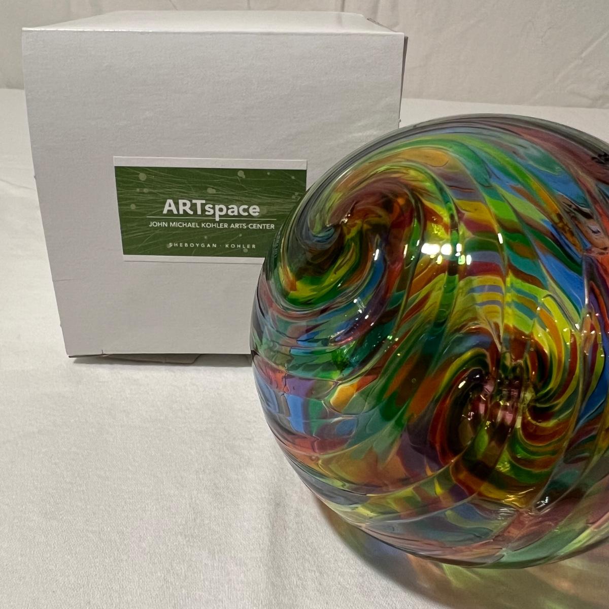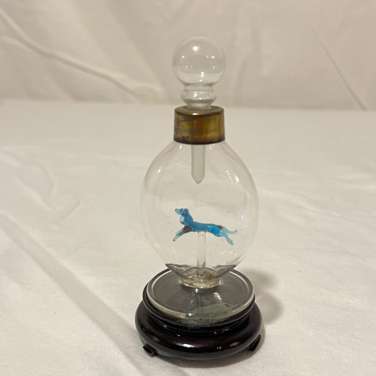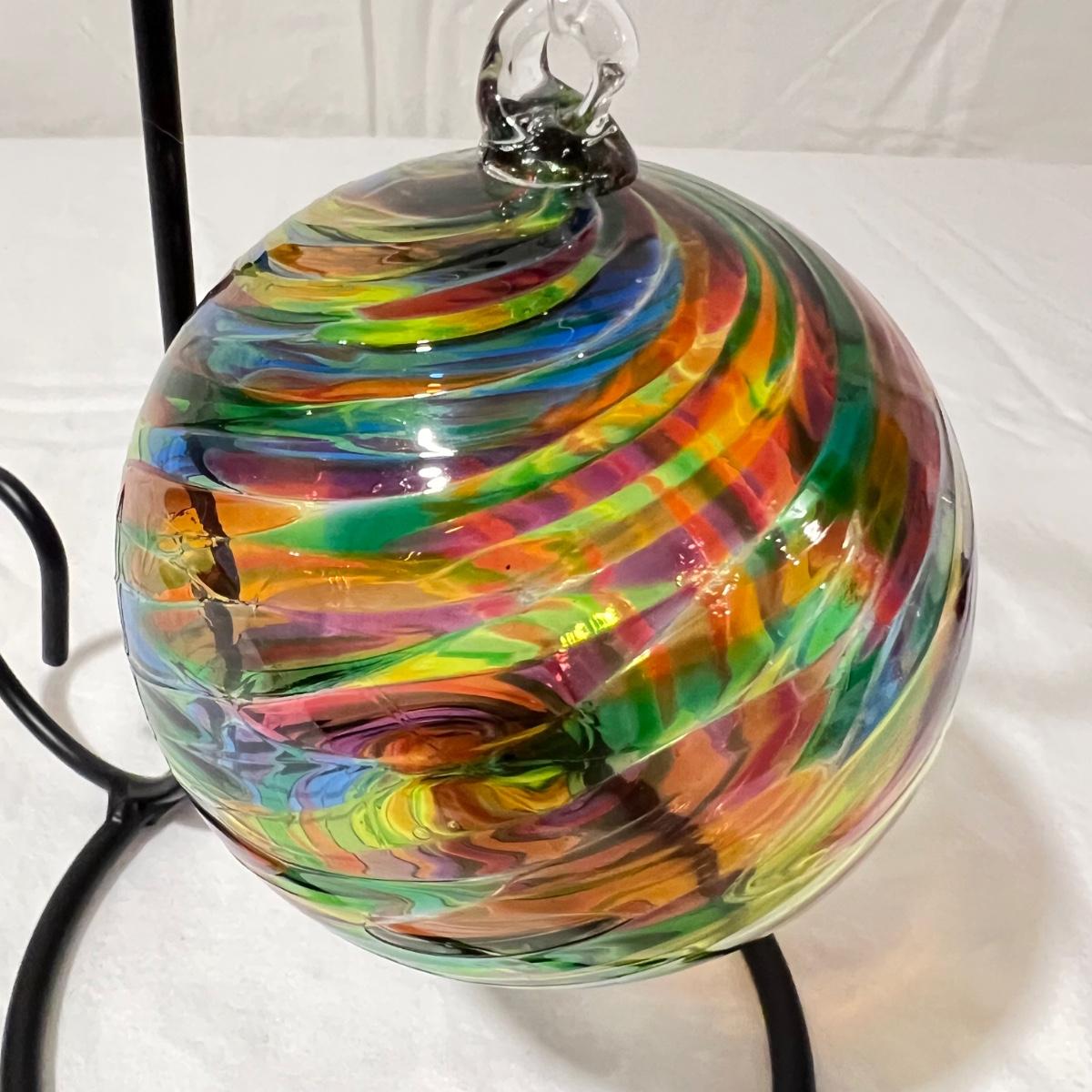 Three hand blown glass ornaments in this lot. The smaller of the two balls appears to be a “˜Tree of Celebration’ as inside of the ball has an incredibly delicate pale blue glass blown tree. The larger glass ball has swirls of color and comes with its box from John Michael Kohl Art Center. The black metal stand comes with this lot, the wooden based stand is not included. The third item appears to be a perfume bottle with a blue blown glass Dachshund. This bottle is partially glued onto a black lacquer wood base; please note that its stopper top does not come out, it might possibly with a good pull. This piece measures 2” D (base) x 4”H.