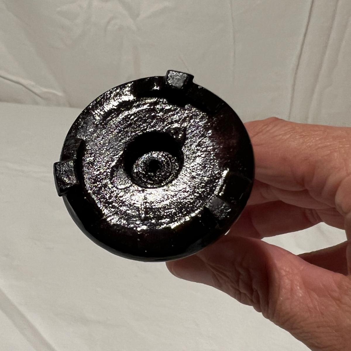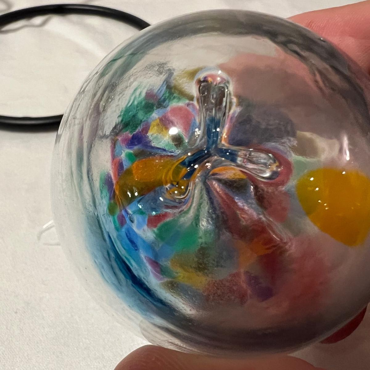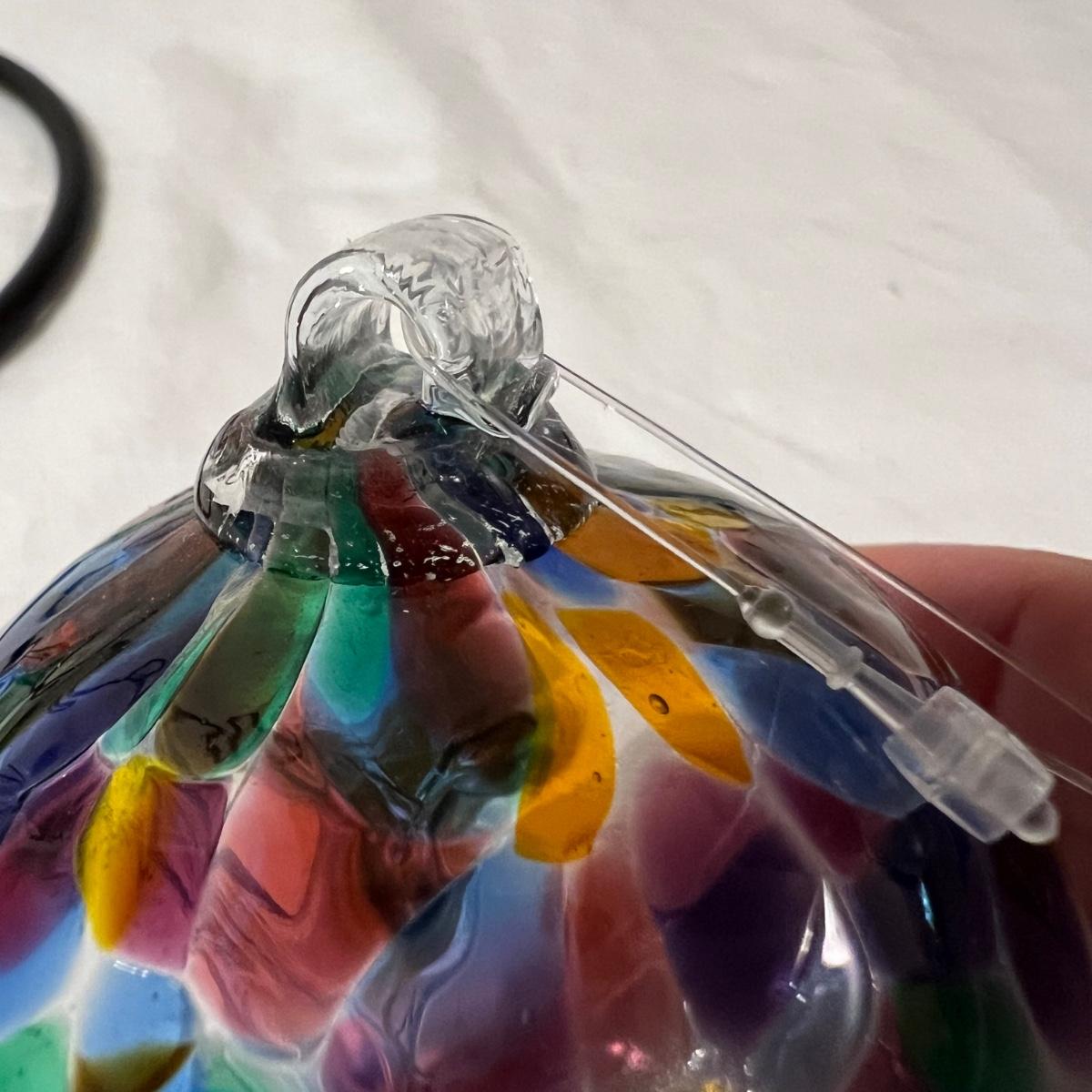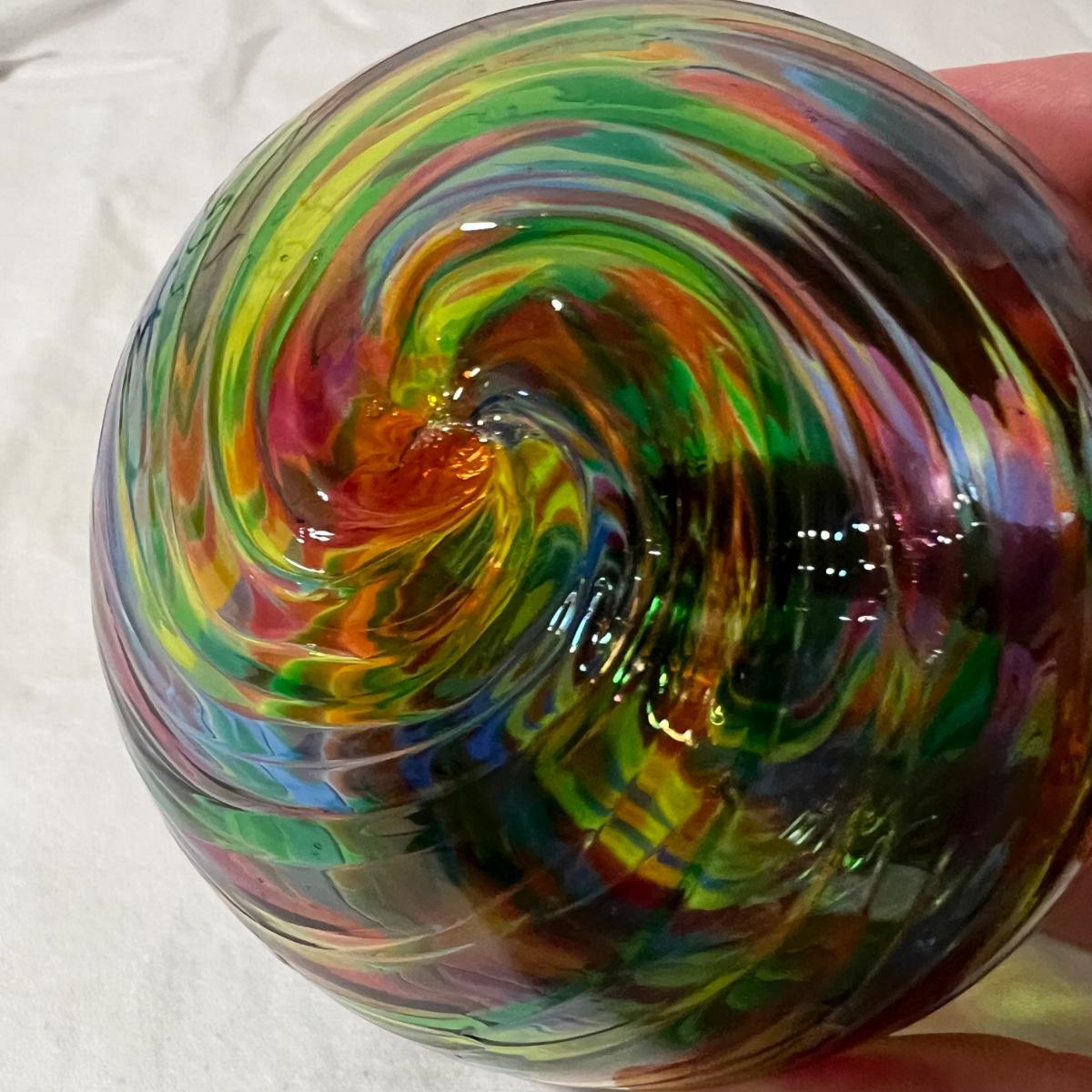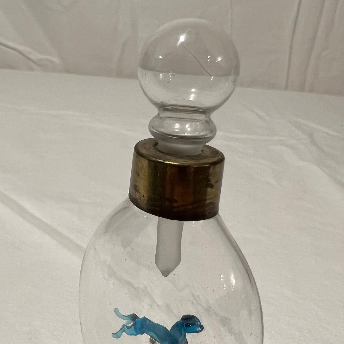 Three hand blown glass ornaments in this lot. The smaller of the two balls appears to be a “˜Tree of Celebration’ as inside of the ball has an incredibly delicate pale blue glass blown tree. The larger glass ball has swirls of color and comes with its box from John Michael Kohl Art Center. The black metal stand comes with this lot, the wooden based stand is not included. The third item appears to be a perfume bottle with a blue blown glass Dachshund. This bottle is partially glued onto a black lacquer wood base; please note that its stopper top does not come out, it might possibly with a good pull. This piece measures 2” D (base) x 4”H.