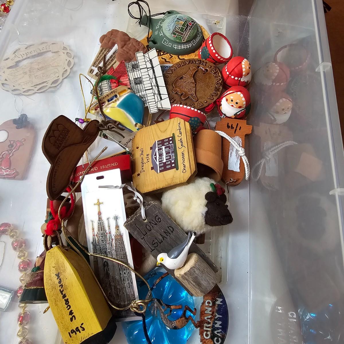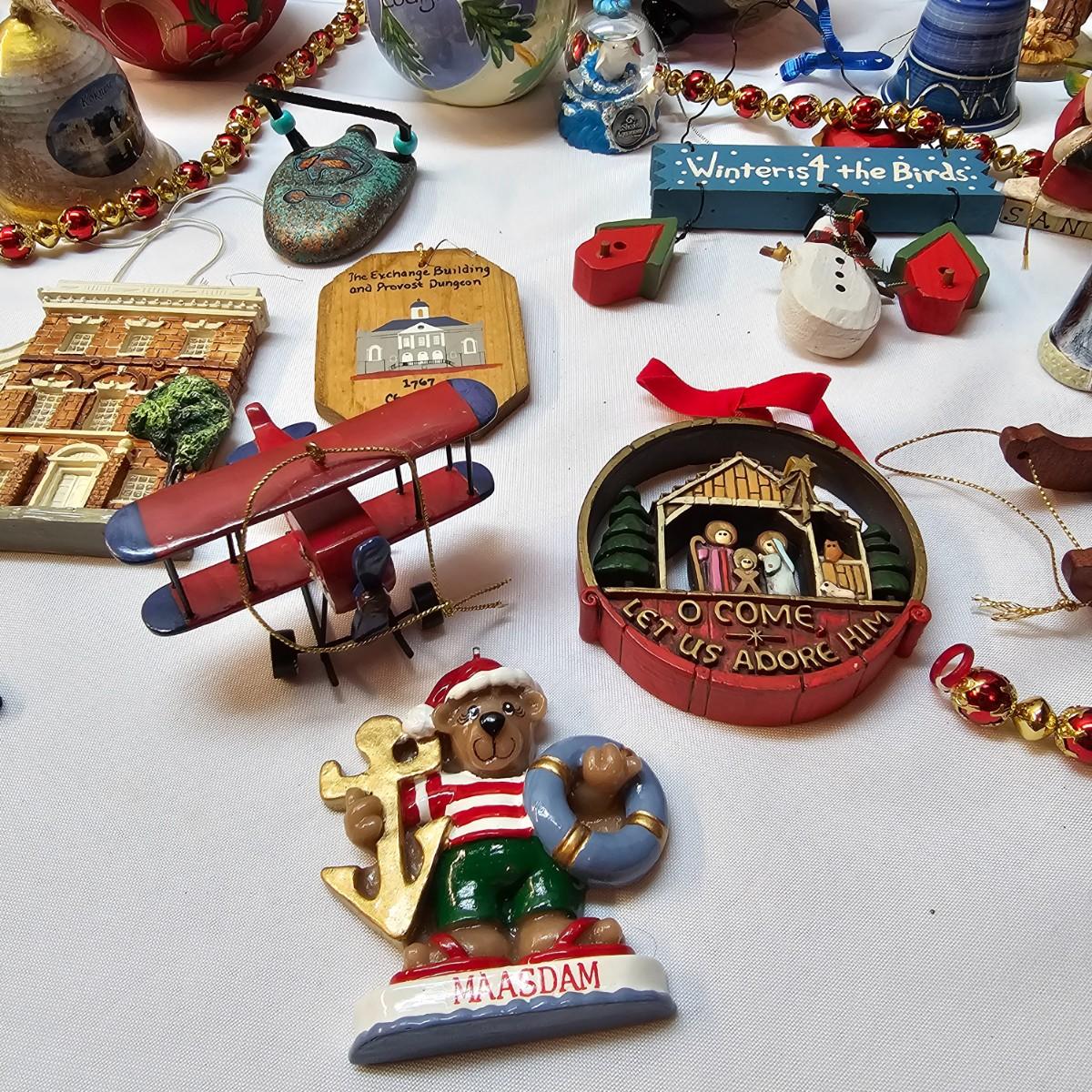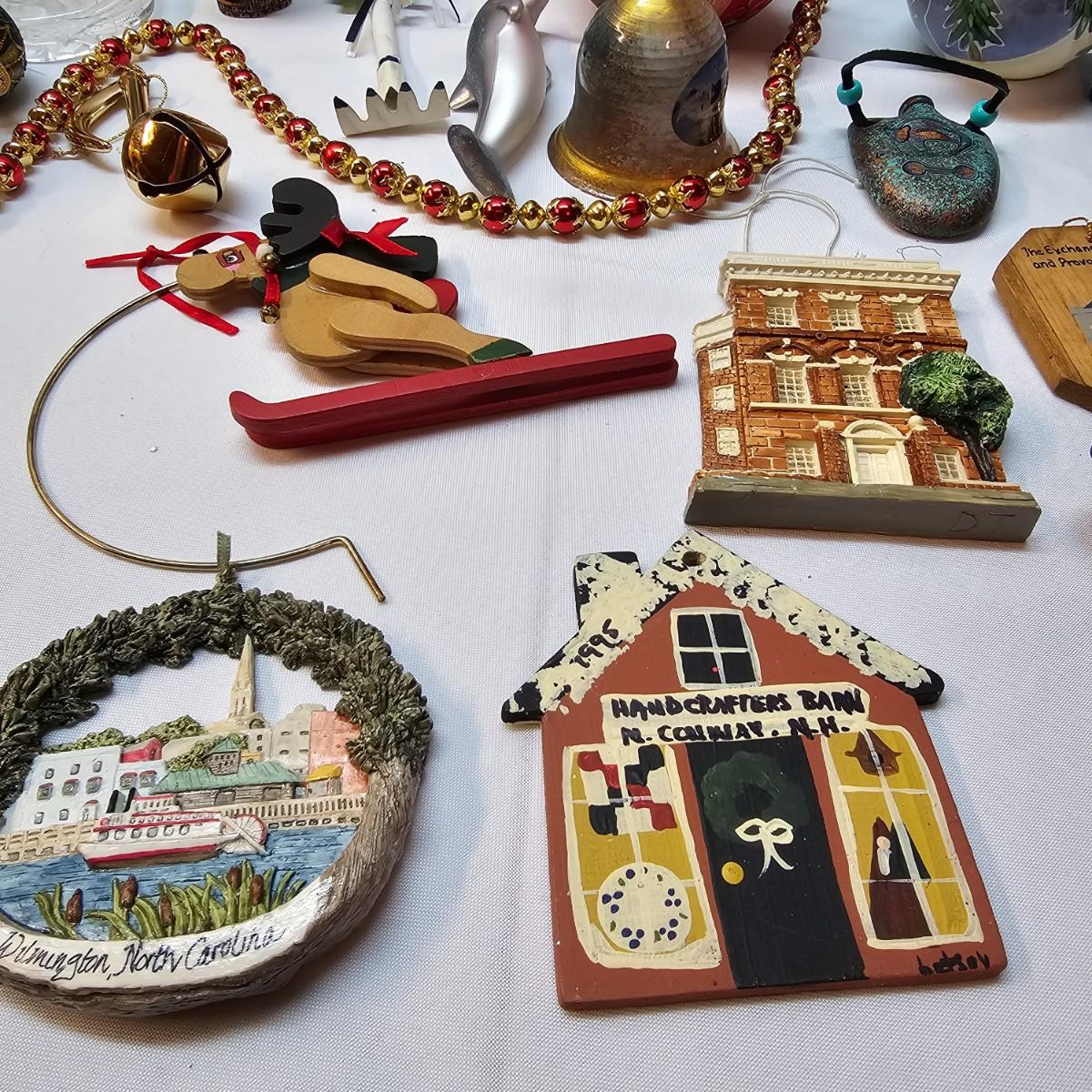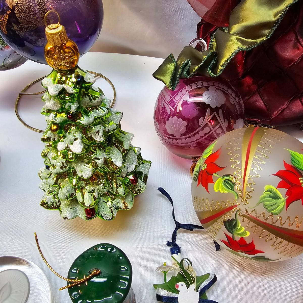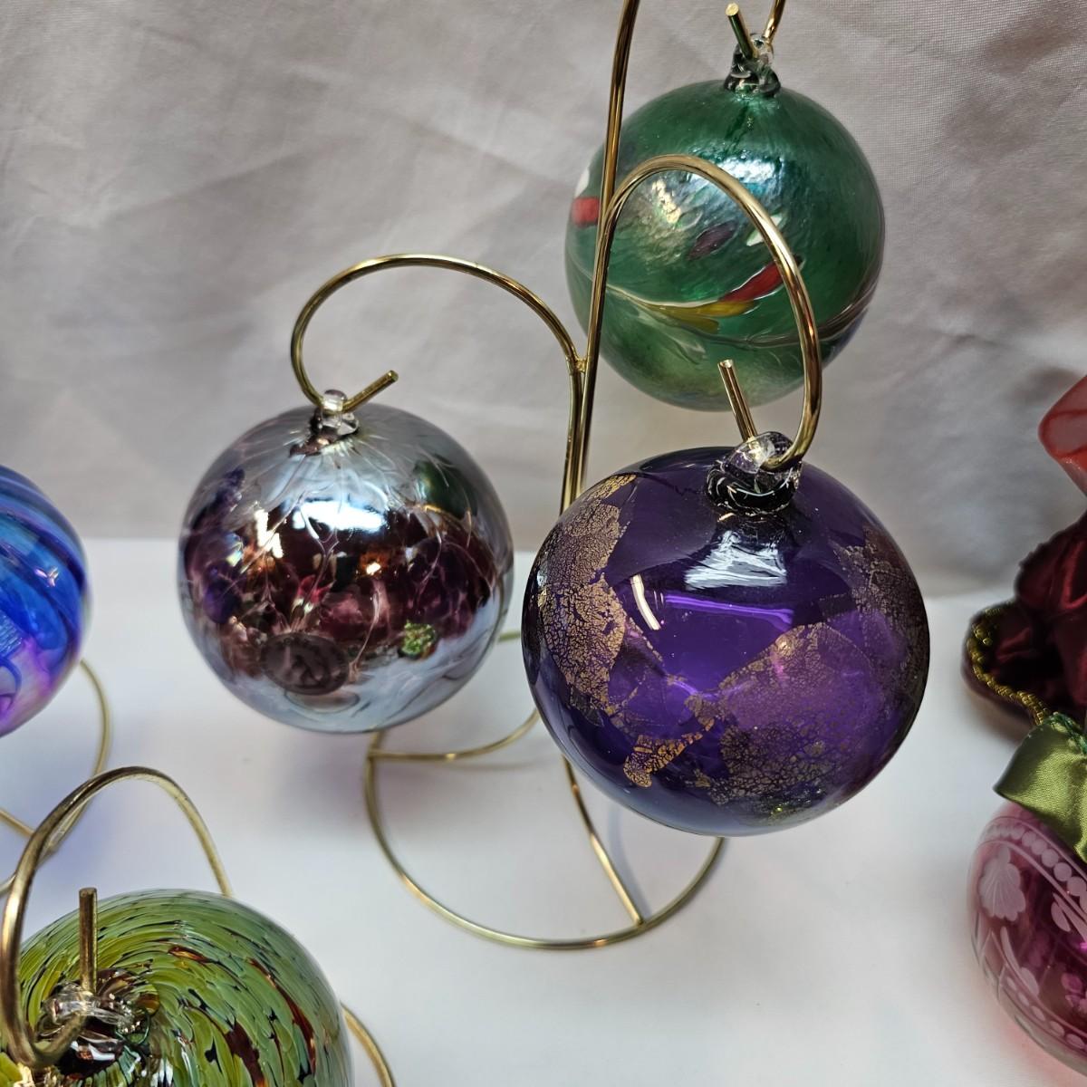 Beautiful selection of hand blown glass ornaments and more. Glass items are from 2" to 4.5" D, stands shown are included. Other ornaments are from differentvplaces in the world, collected on travels. Large angel is a tree topper, measures 9" x 7" x 12"H. See photos for details. Storage containers included. Shipping available.