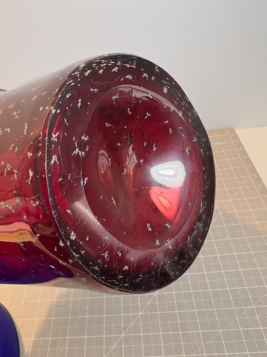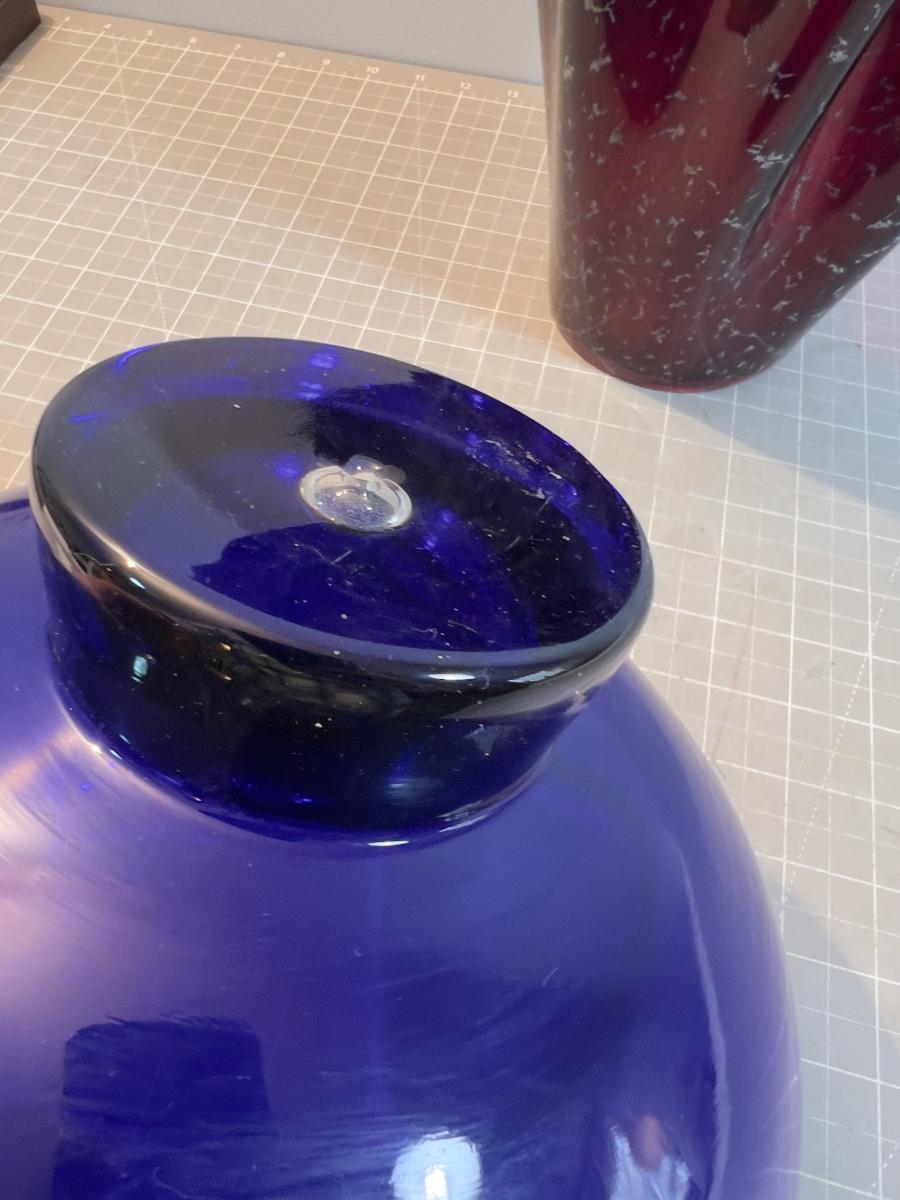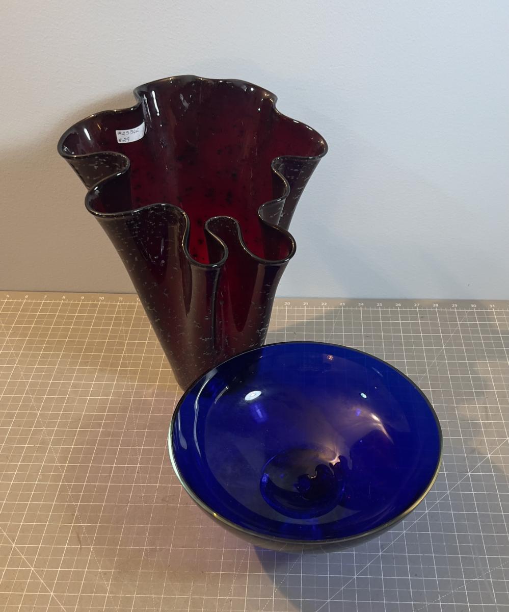 Hand Blown Glass, Dark Red Vase & Dark Blue Bowl
