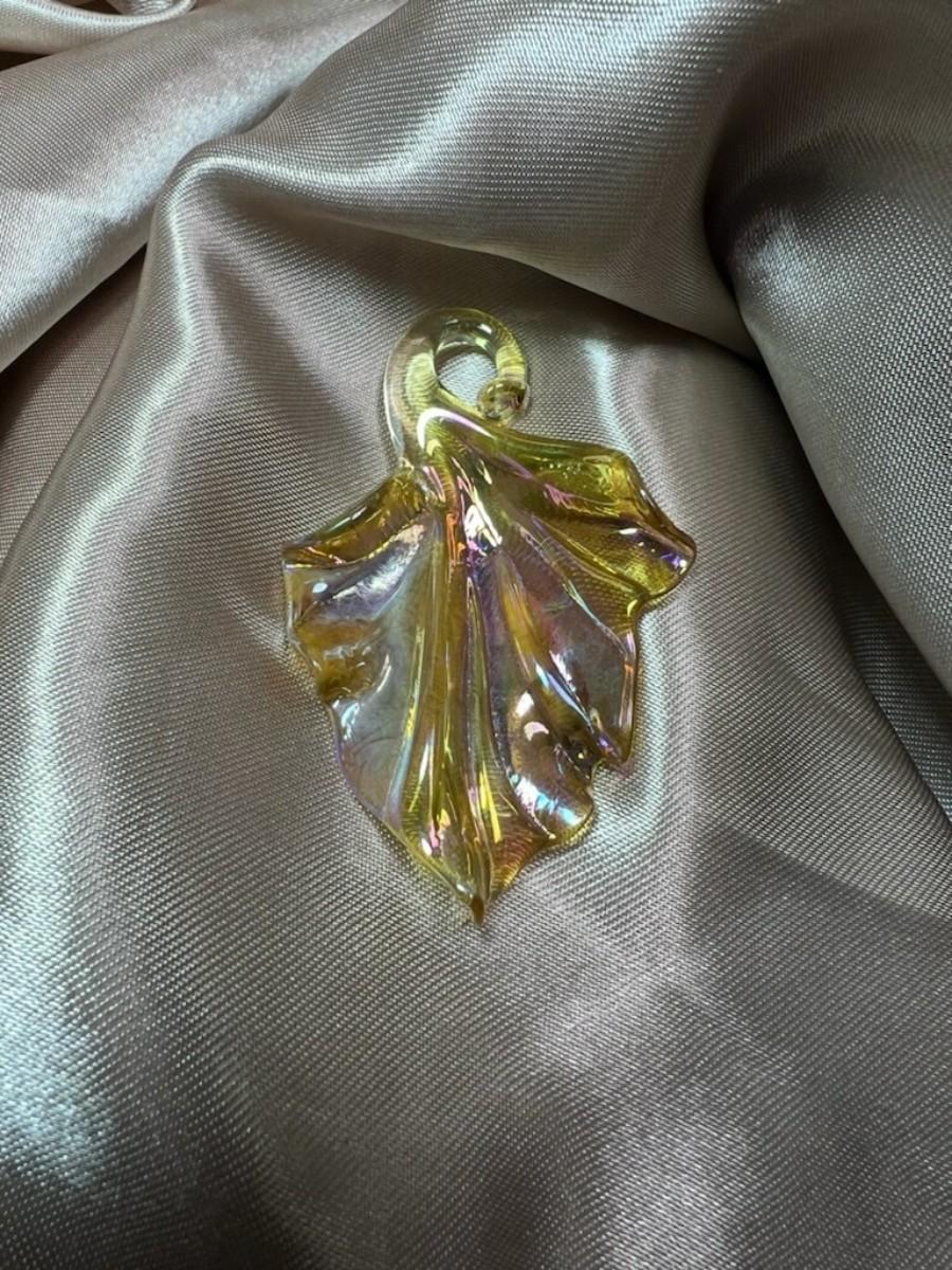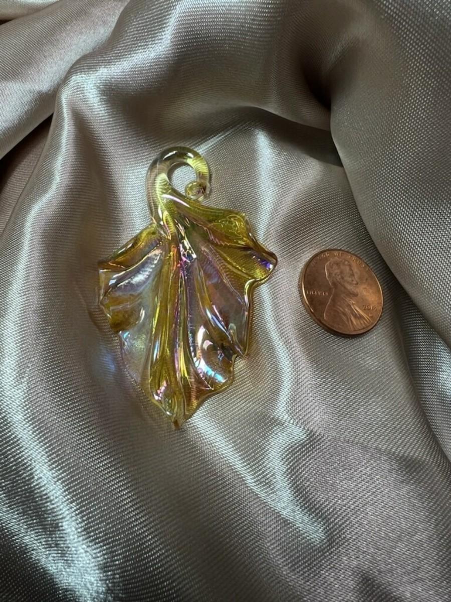 Exquisite opalescent glass leaf pendant, sold with 16 inch chain, not pictured.