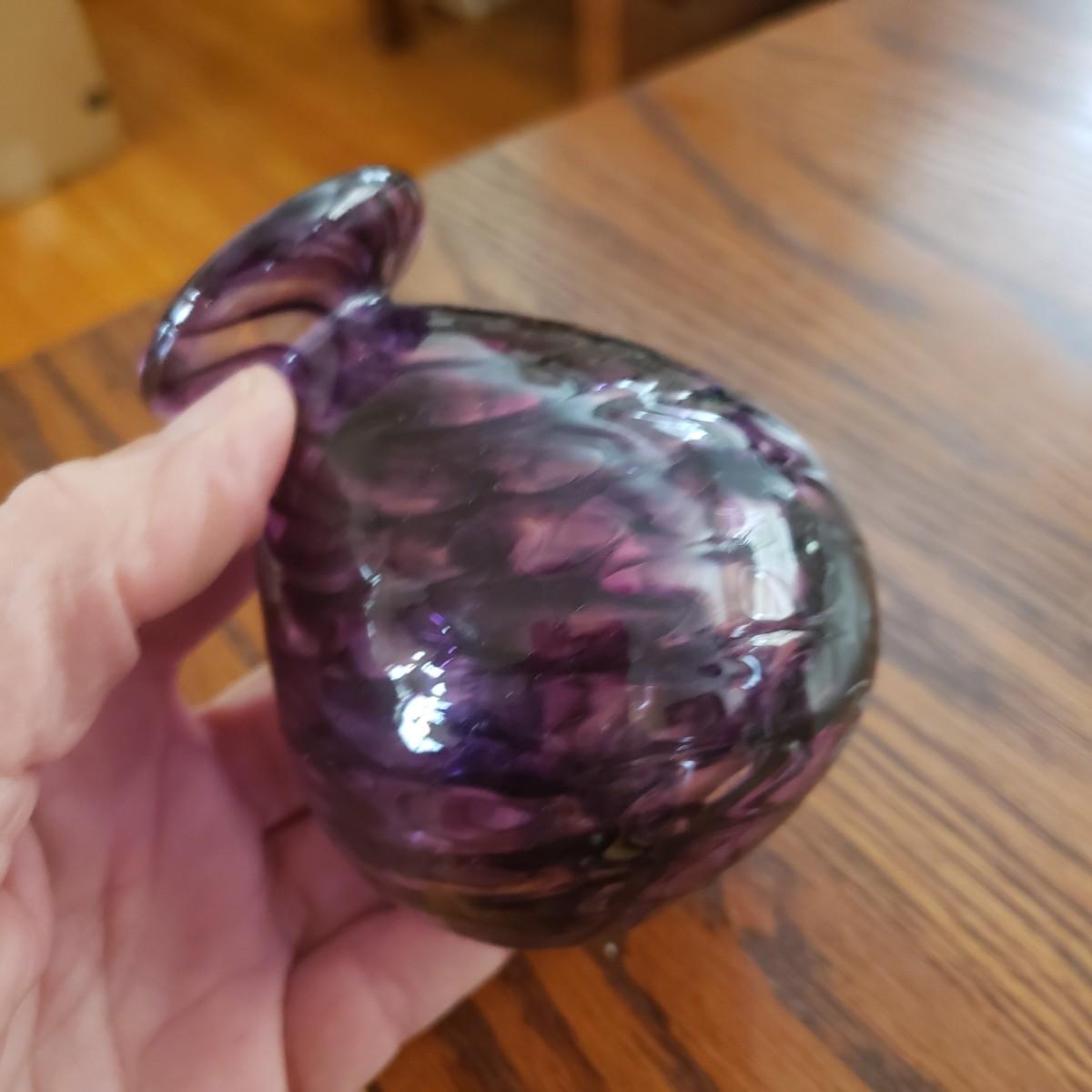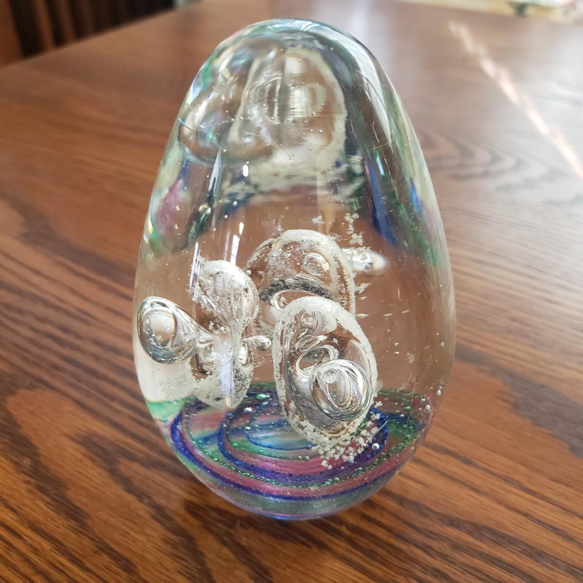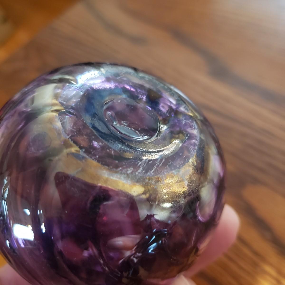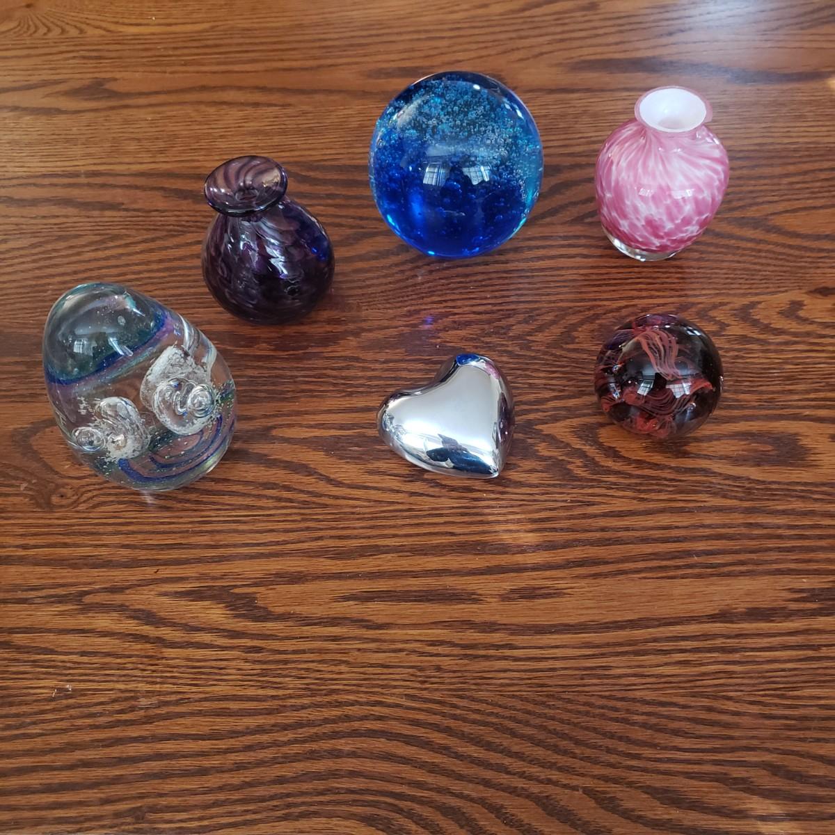 This beautiful lot features three hand blown paper weights, two small vases and a silver metal heart that jingles! The smallest paper weight has dark purple and reddish swirls and bubbles laced into the swirls. The blue, teal and clear glass ball is heavy to the touch. The bubbles are mesmerizing! The egg-shaped paperweight has an RGCF marking on its side. The other small vase has purple and clear hues in a swirled pattern. The small pink vase measures approximately 3" x 4"H and has a chip on the rim, see picture. Finally, there is a metal heart that jingles when you shake it.