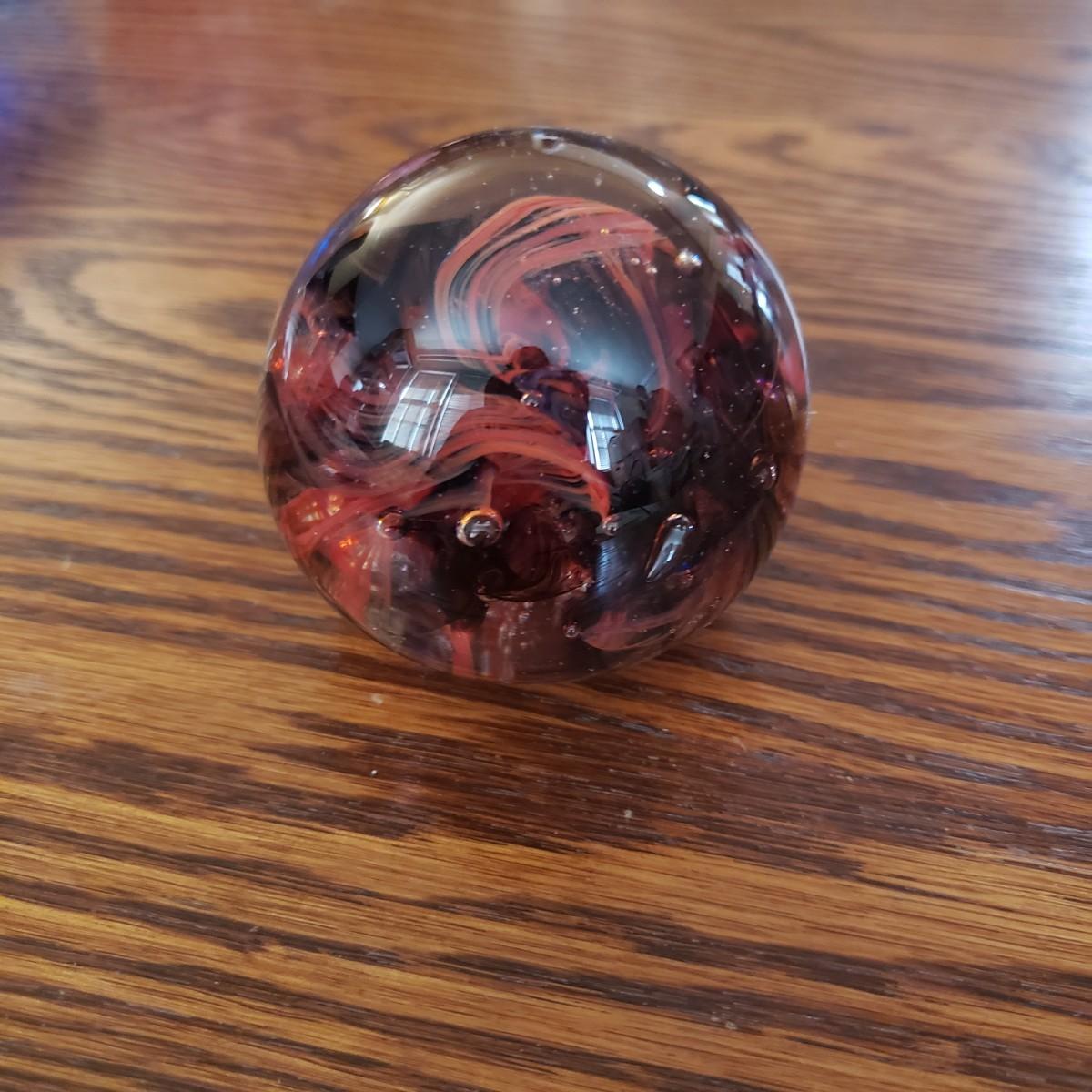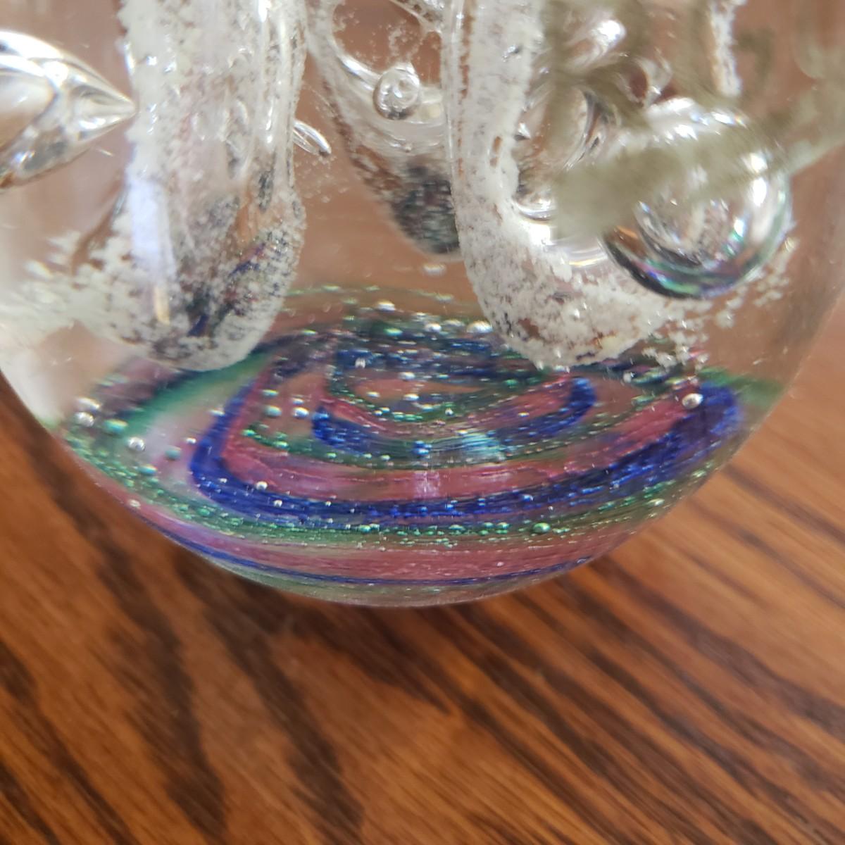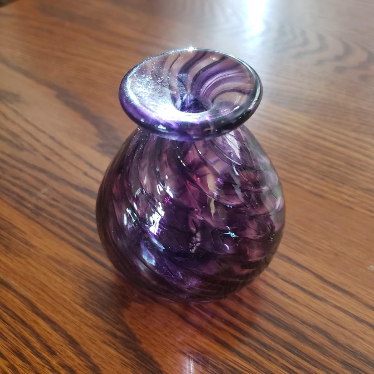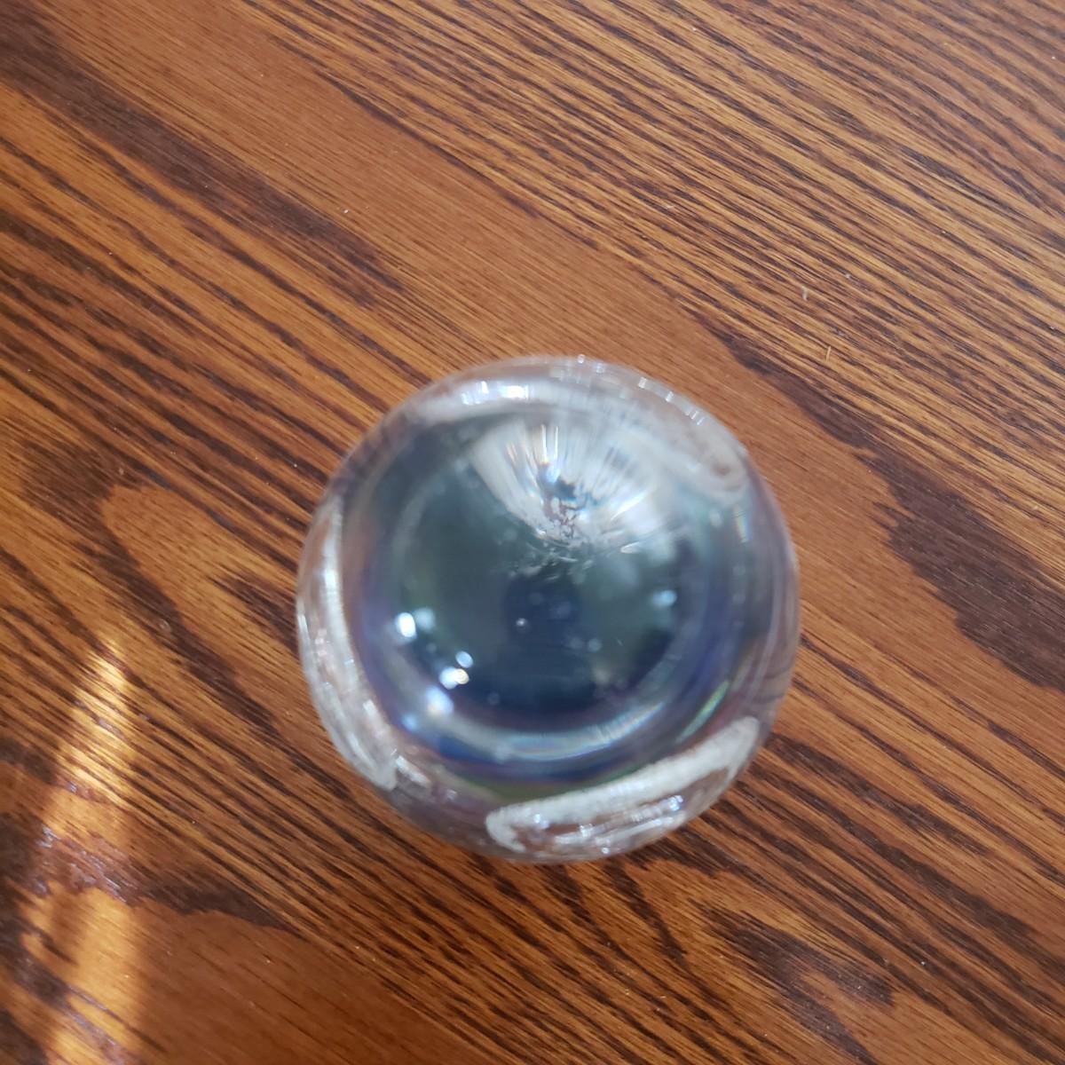This beautiful lot features three hand blown paper weights, two small vases and a silver metal heart that jingles! The smallest paper weight has dark purple and reddish swirls and bubbles laced into the swirls. The blue, teal and clear glass ball is heavy to the touch. The bubbles are mesmerizing! The egg-shaped paperweight has an RGCF marking on its side. The other small vase has purple and clear hues in a swirled pattern. The small pink vase measures approximately 3" x 4"H and has a chip on the rim, see picture. Finally, there is a metal heart that jingles when you shake it.