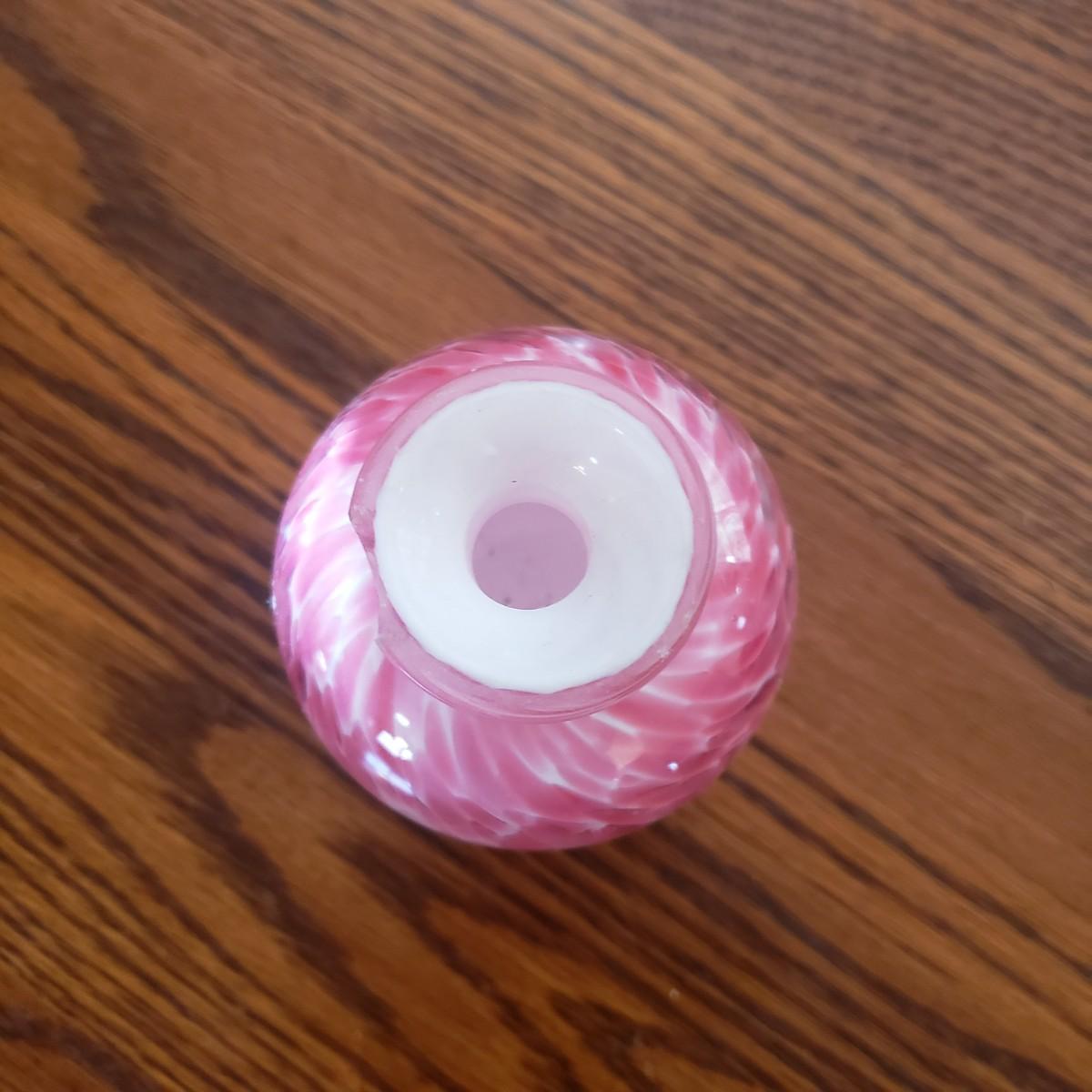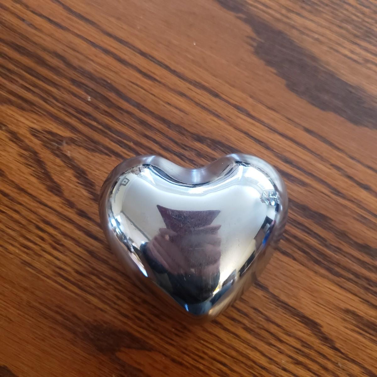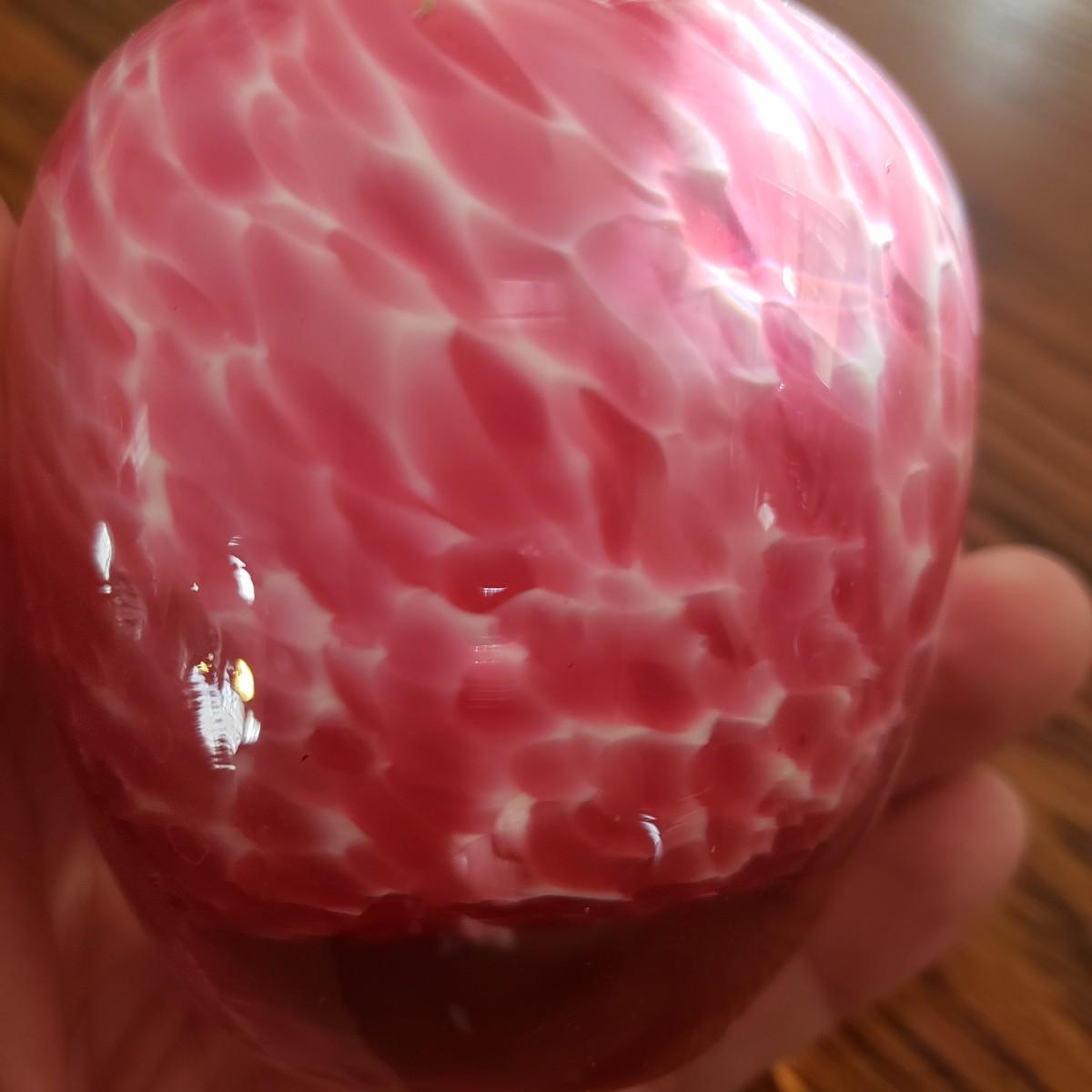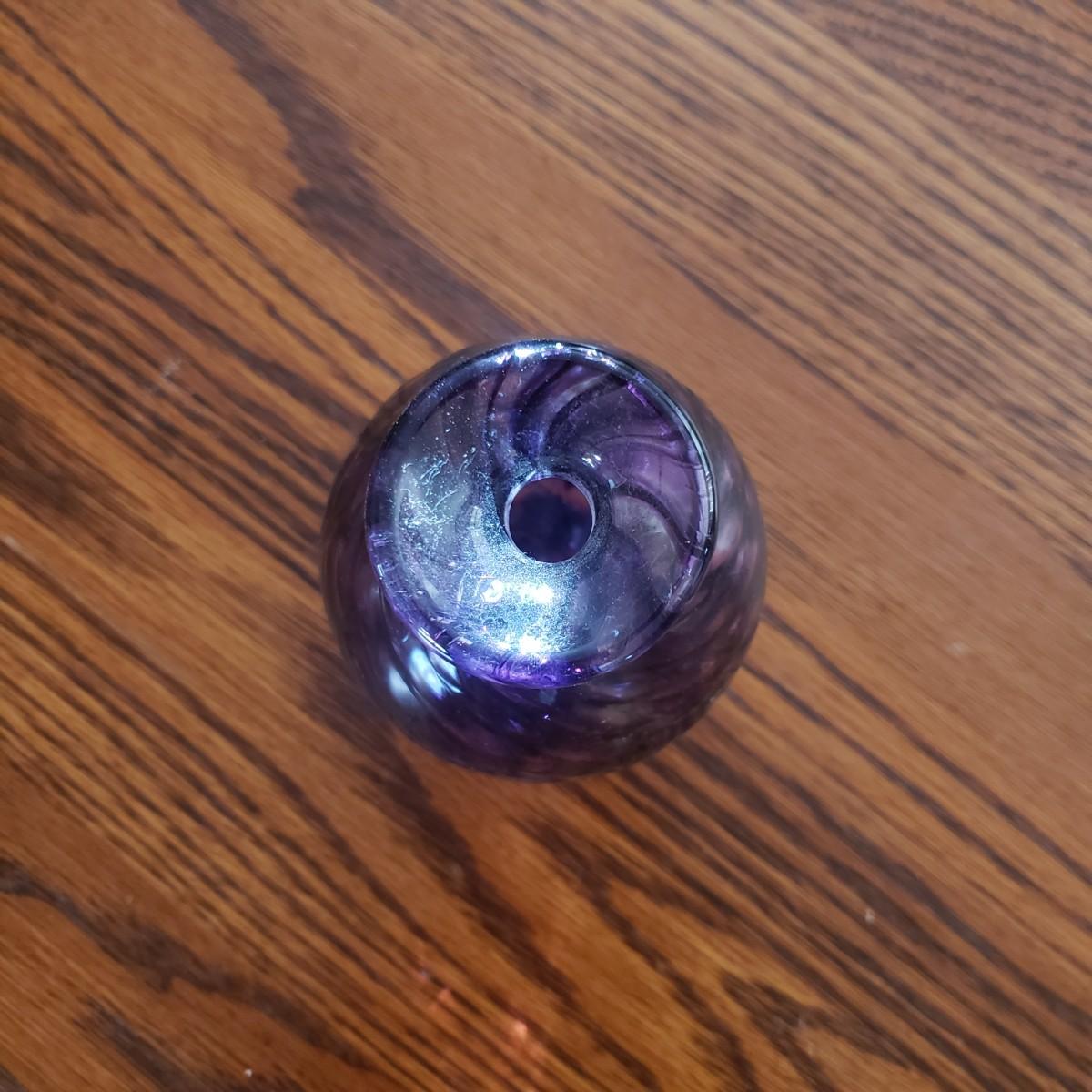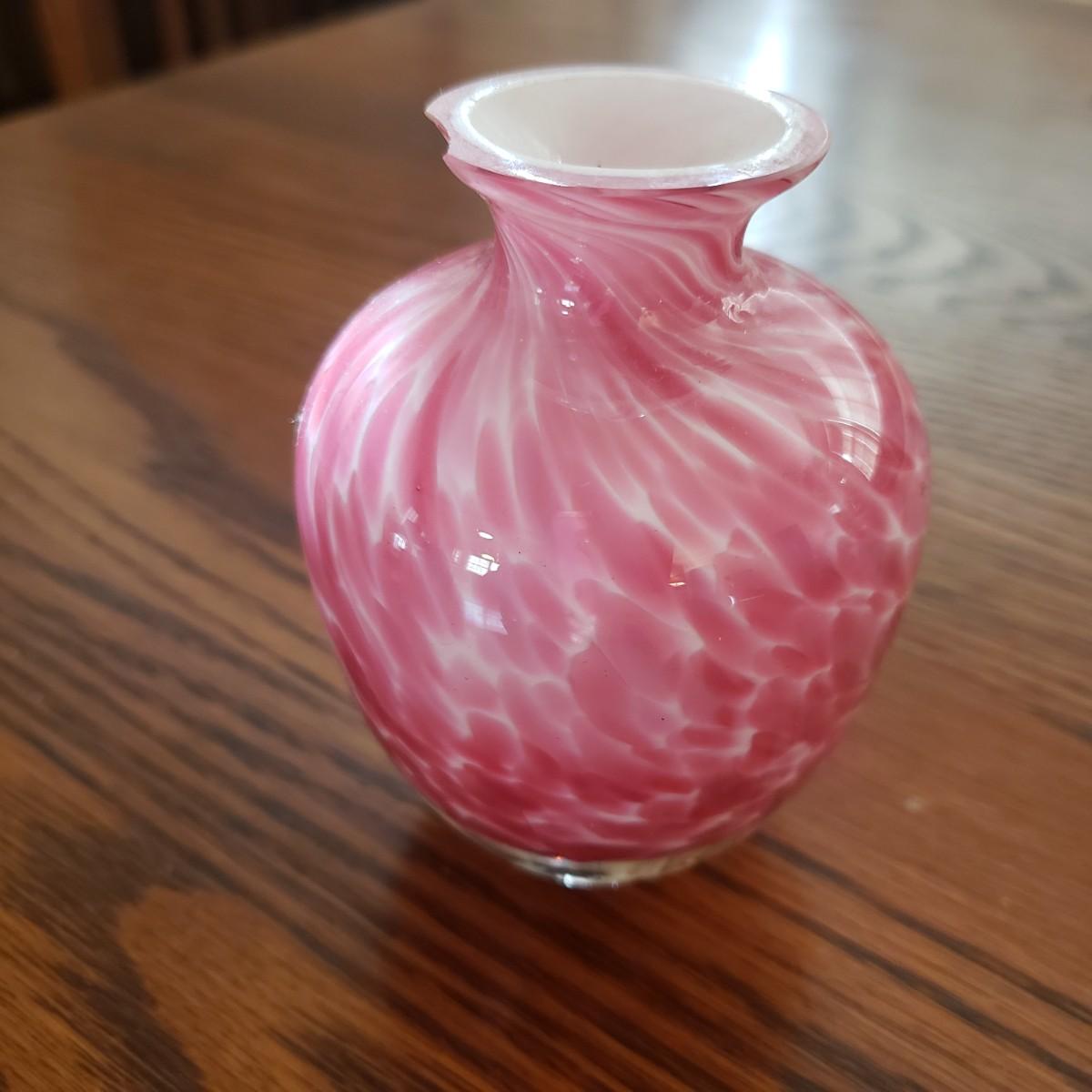 This beautiful lot features three hand blown paper weights, two small vases and a silver metal heart that jingles! The smallest paper weight has dark purple and reddish swirls and bubbles laced into the swirls. The blue, teal and clear glass ball is heavy to the touch. The bubbles are mesmerizing! The egg-shaped paperweight has an RGCF marking on its side. The other small vase has purple and clear hues in a swirled pattern. The small pink vase measures approximately 3" x 4"H and has a chip on the rim, see picture. Finally, there is a metal heart that jingles when you shake it.
