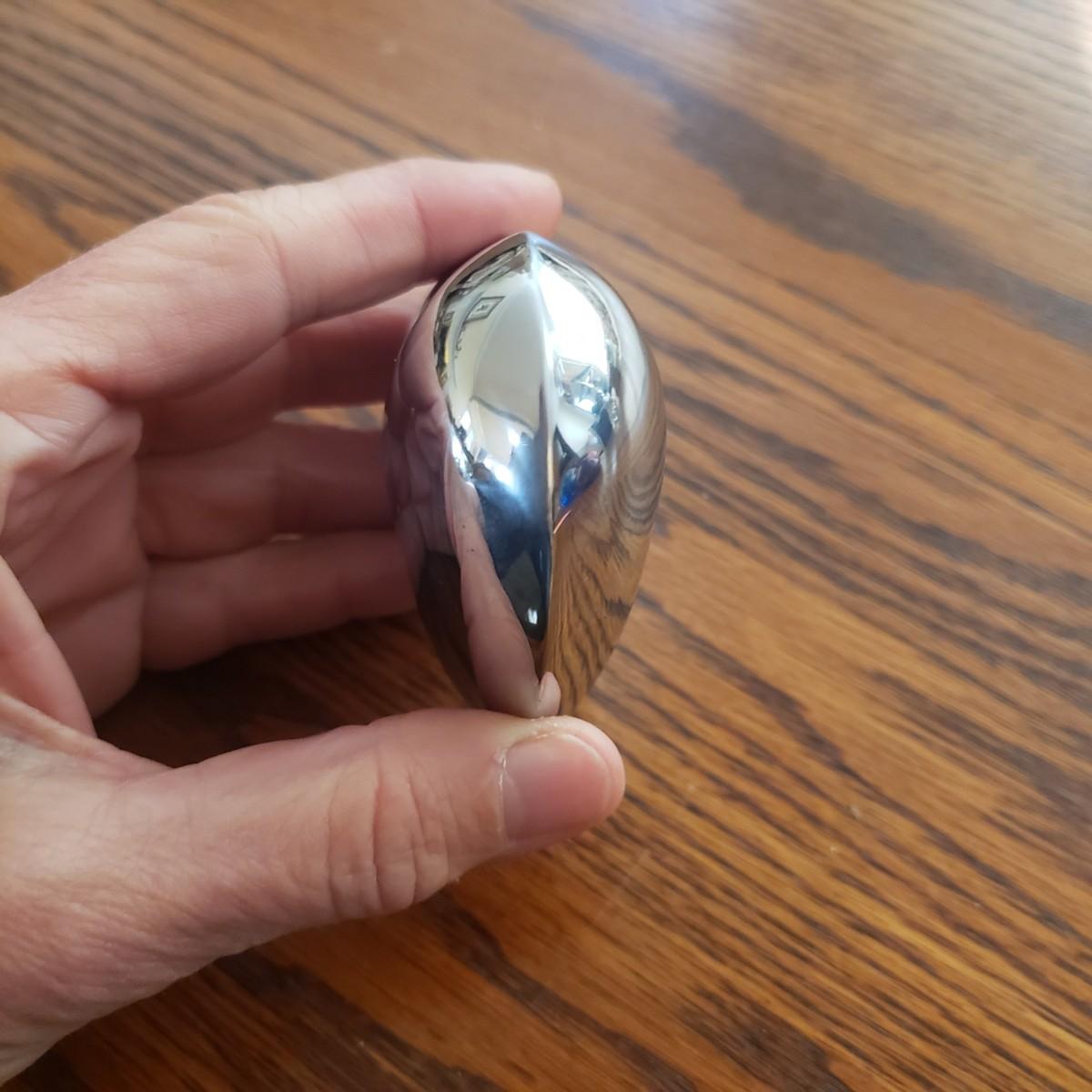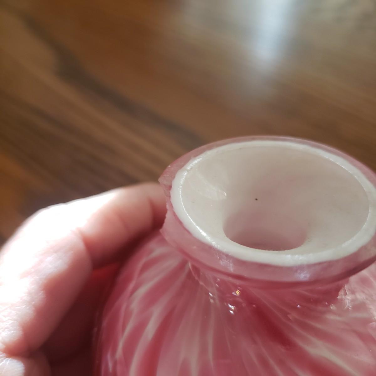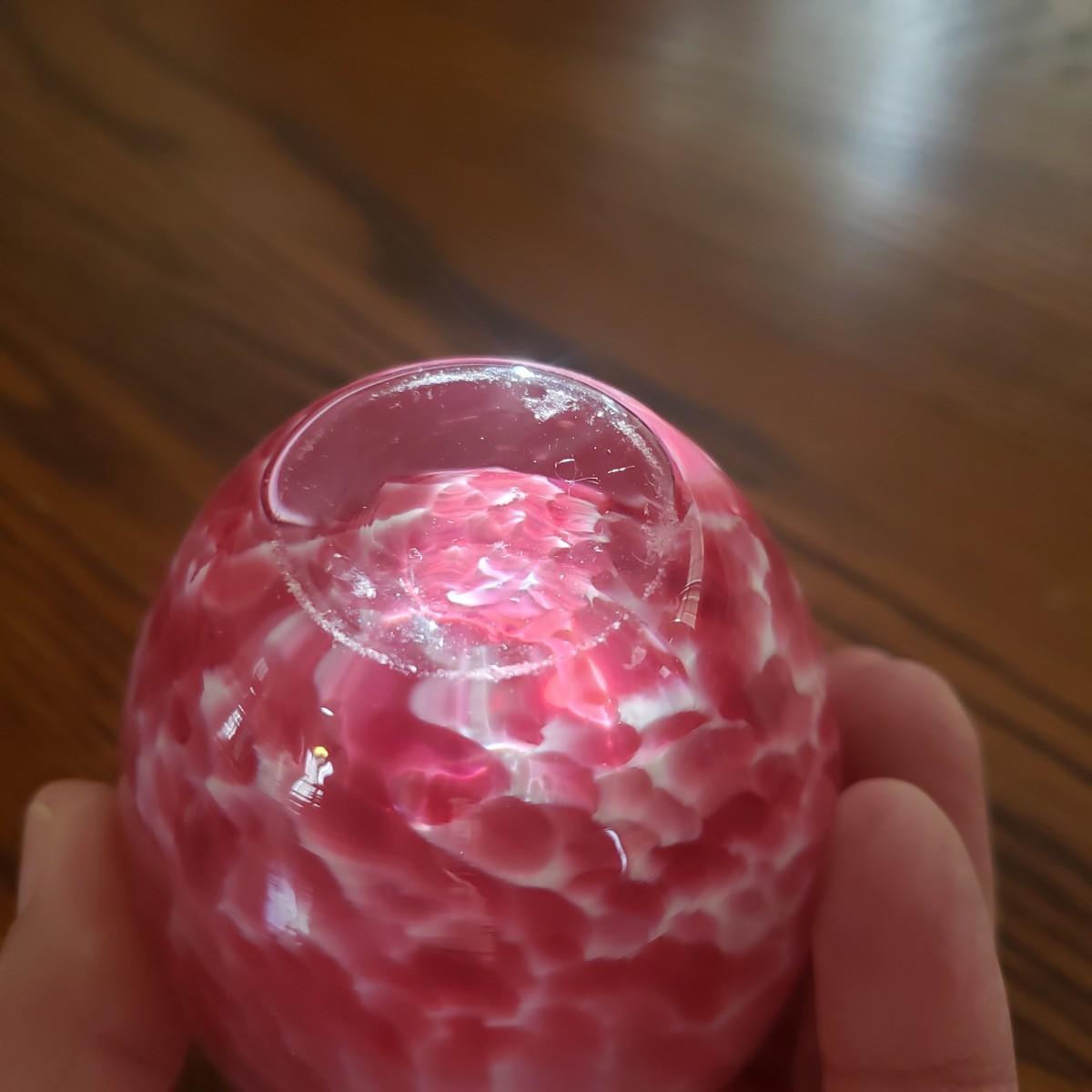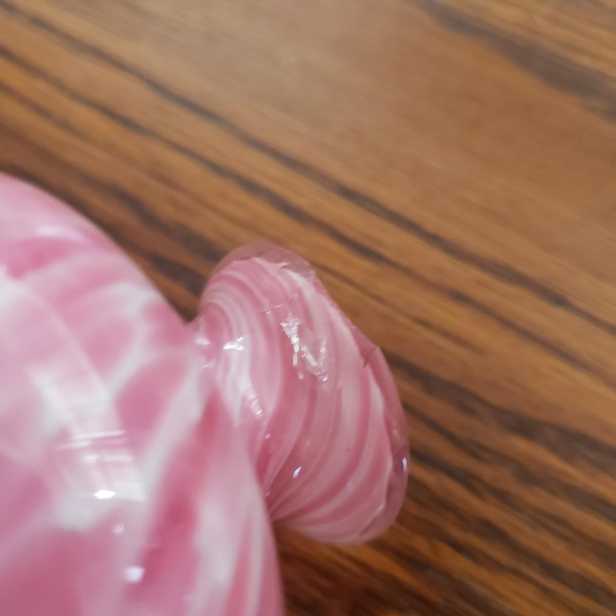 This beautiful lot features three hand blown paper weights, two small vases and a silver metal heart that jingles! The smallest paper weight has dark purple and reddish swirls and bubbles laced into the swirls. The blue, teal and clear glass ball is heavy to the touch. The bubbles are mesmerizing! The egg-shaped paperweight has an RGCF marking on its side. The other small vase has purple and clear hues in a swirled pattern. The small pink vase measures approximately 3" x 4"H and has a chip on the rim, see picture. Finally, there is a metal heart that jingles when you shake it.