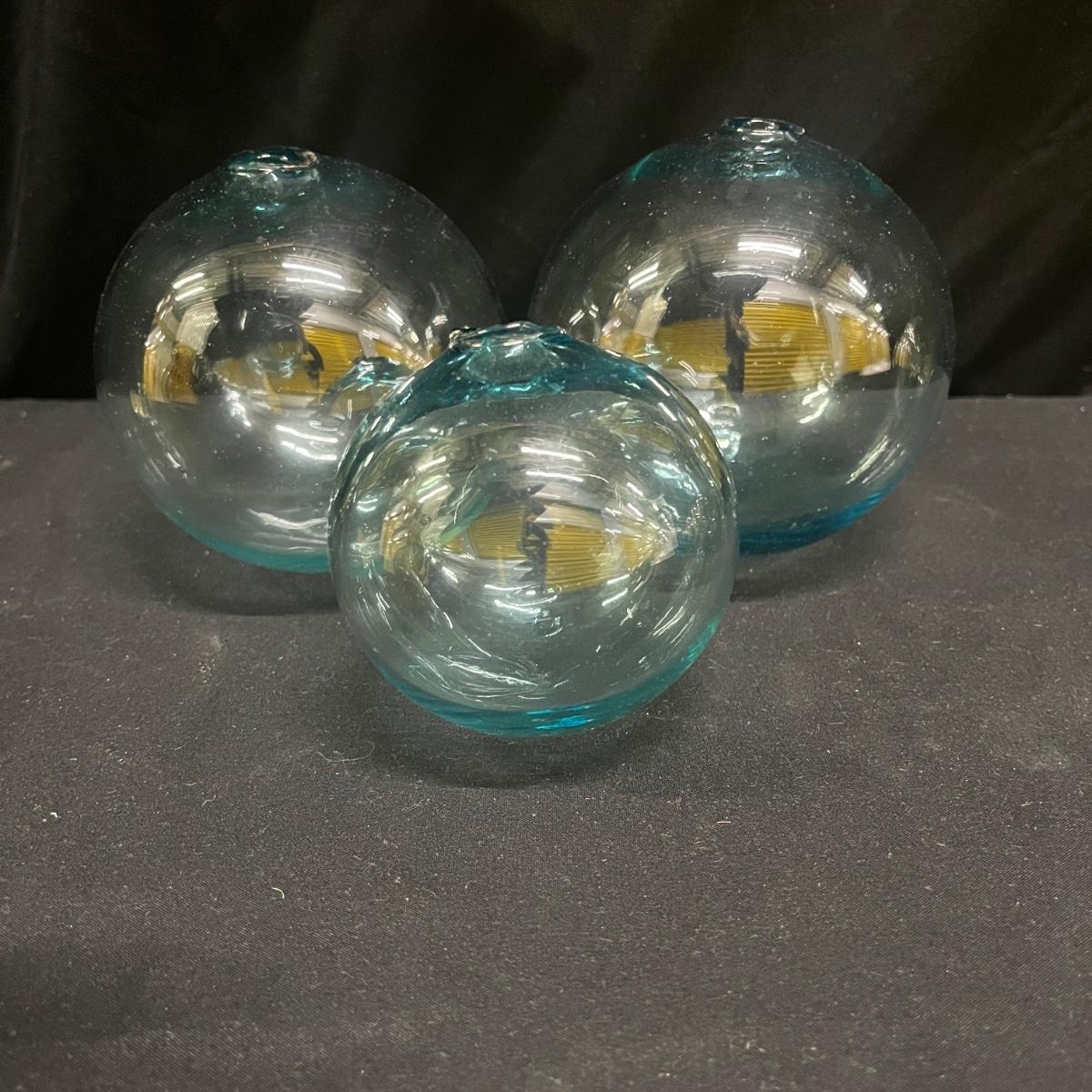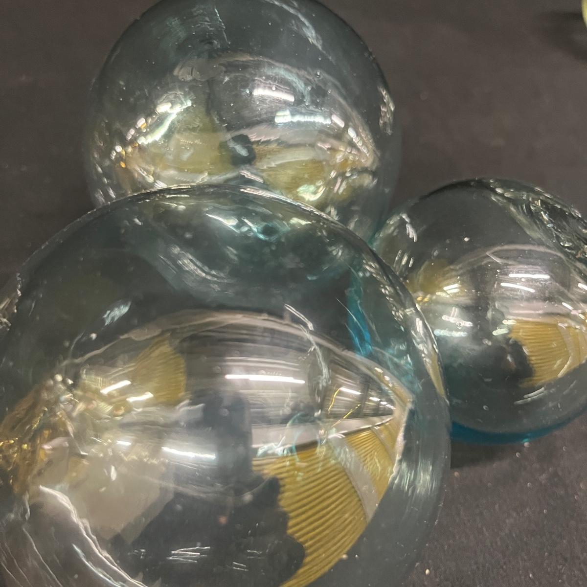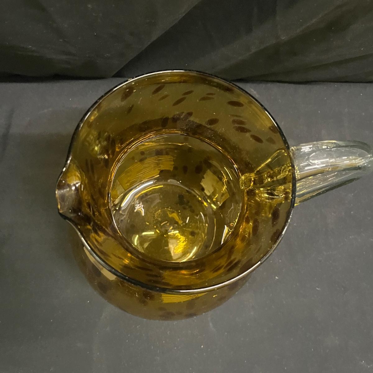 Lot includes a spotted hand blown glass pitcher, two solid glass orbs and six hollow glass balls. Pitcher measures 8.5” x 7” x 8”H.