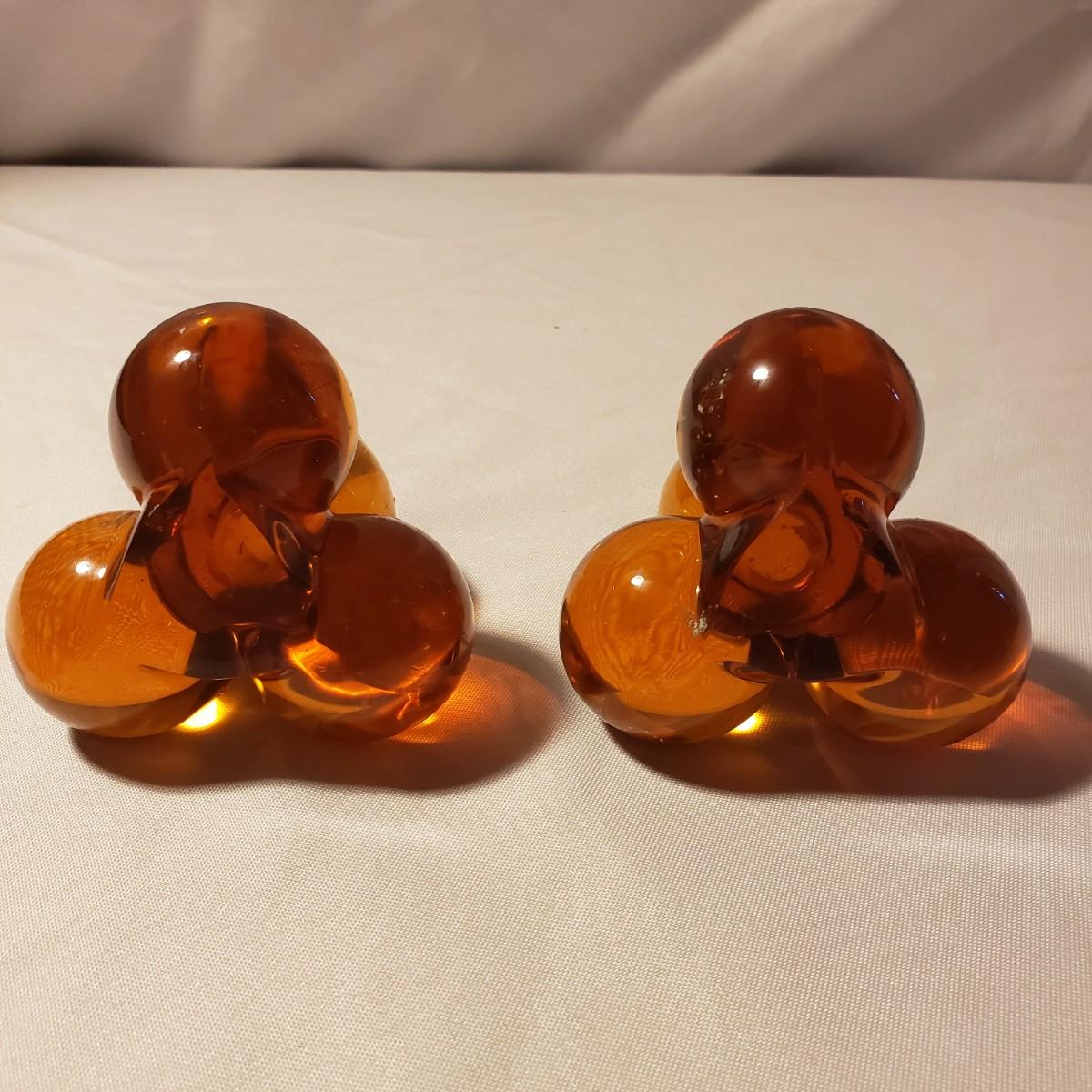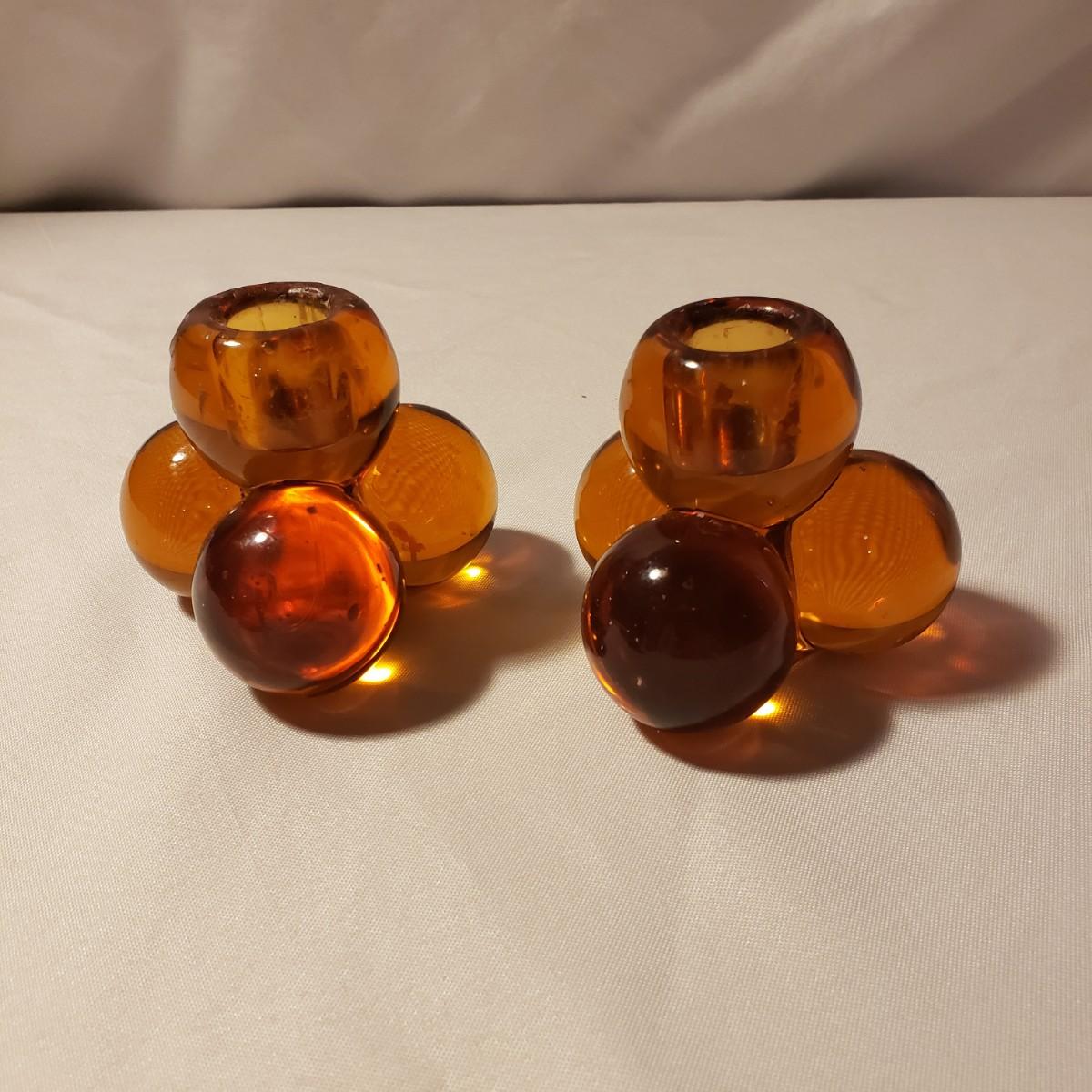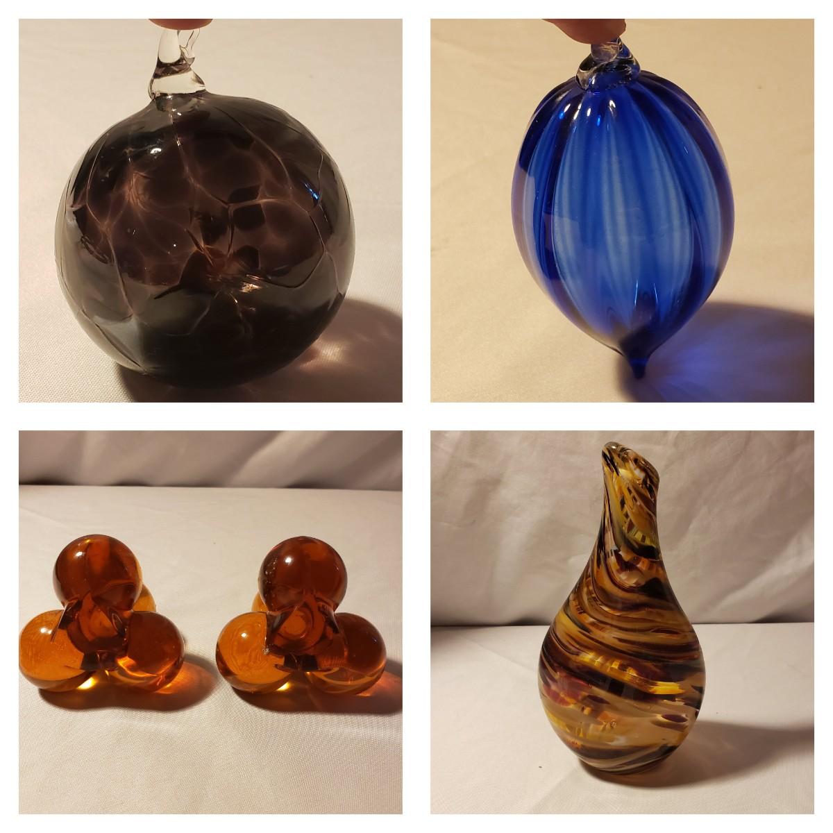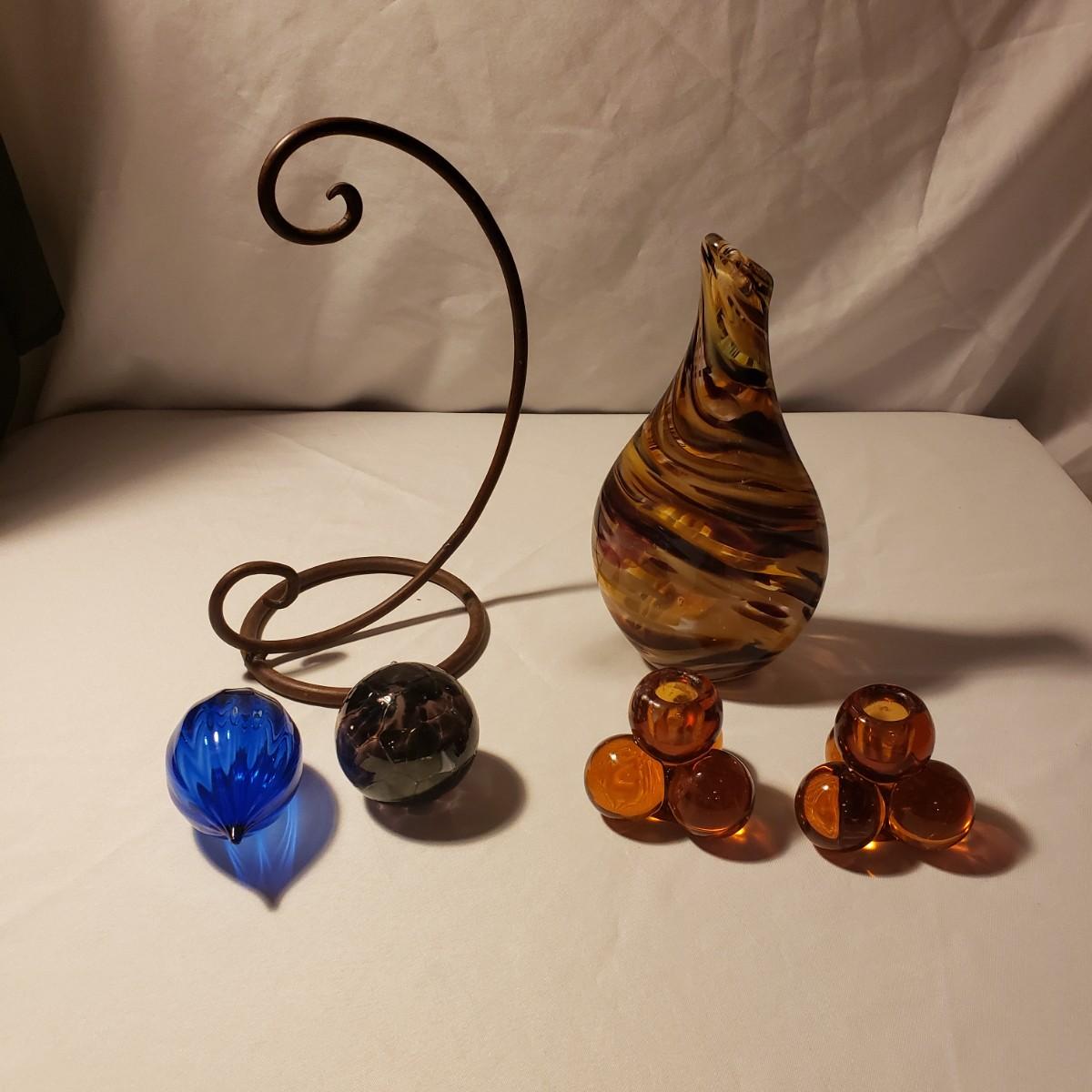 This glass lot features a beautiful hand-blown vase, two ornaments with stand and a pair of glass candlesticks. The vase is blown in browns, tans and soft yellows. It measures 5" x 10"H. The two ornaments have a loop hole so that it can hang on the metal stand (6" x 12"H). The blue ornament feels ribbed and the dark purple one has a crackle effect. The pair of candlesticks are in an amber color and are heavy to the touch. The pair measure 3" x 3"H. There is some wax residue on them.