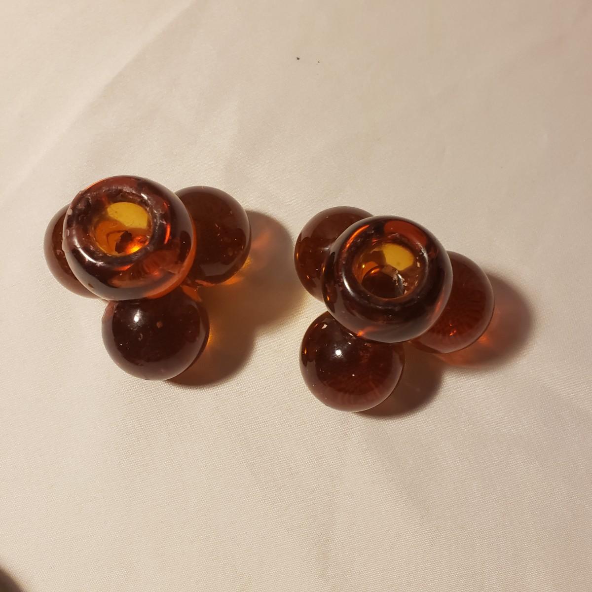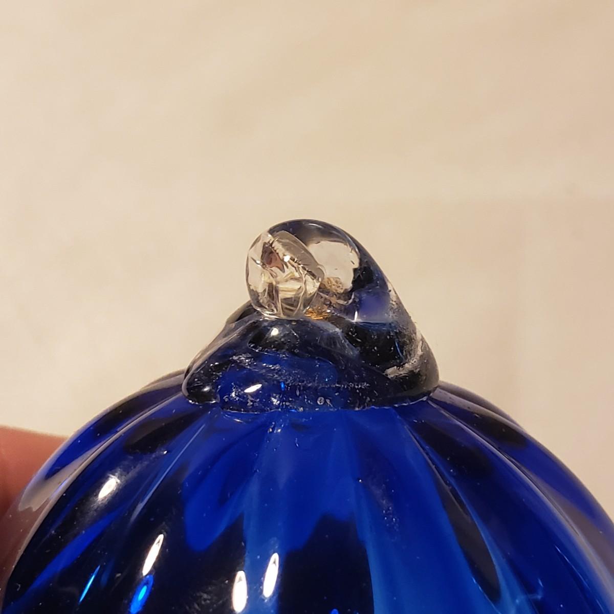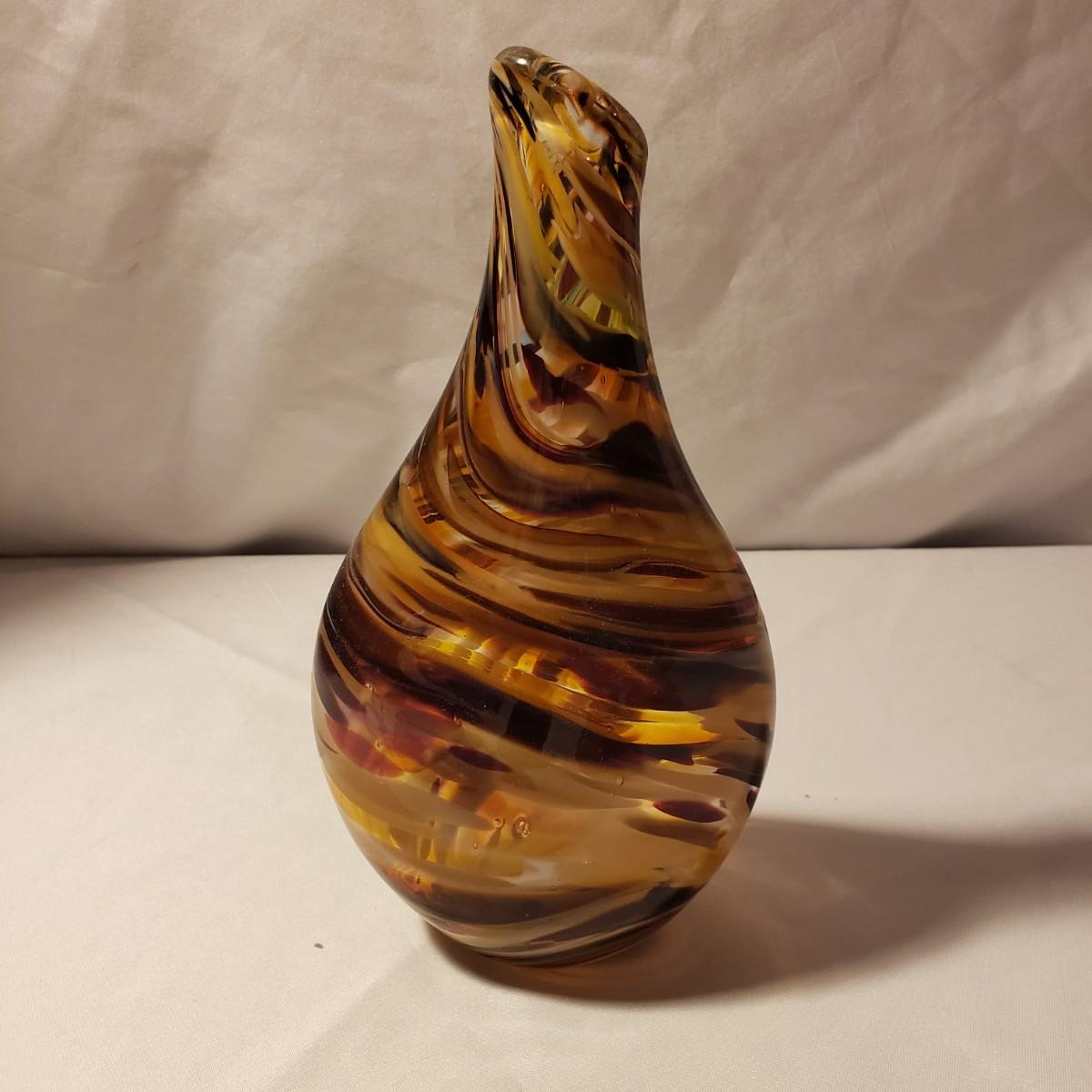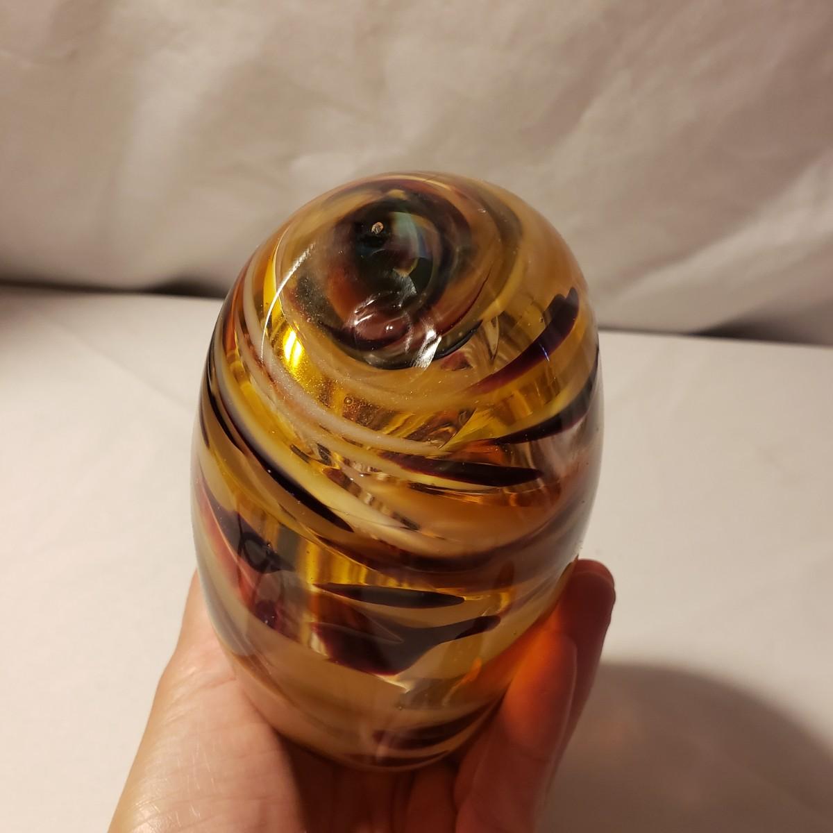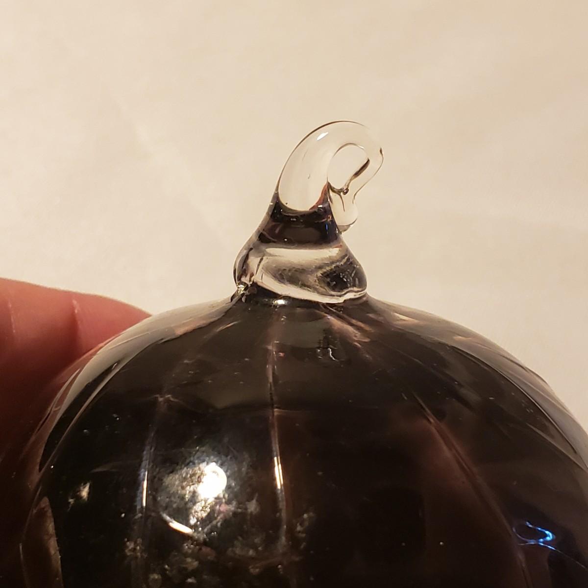 This glass lot features a beautiful hand-blown vase, two ornaments with stand and a pair of glass candlesticks. The vase is blown in browns, tans and soft yellows. It measures 5" x 10"H. The two ornaments have a loop hole so that it can hang on the metal stand (6" x 12"H). The blue ornament feels ribbed and the dark purple one has a crackle effect. The pair of candlesticks are in an amber color and are heavy to the touch. The pair measure 3" x 3"H. There is some wax residue on them.