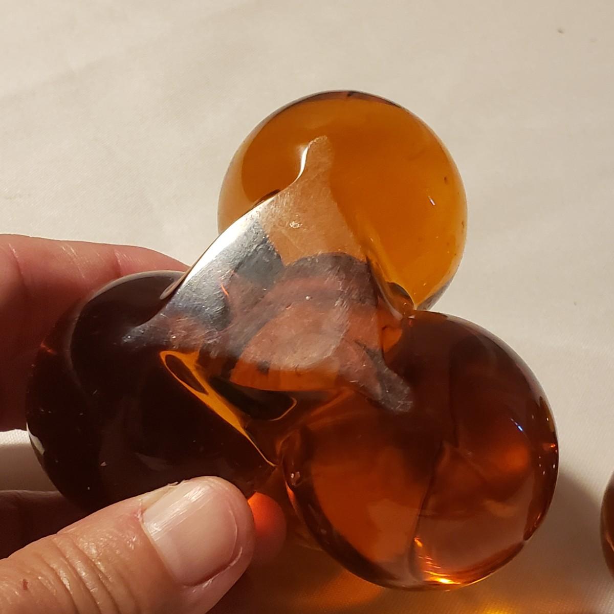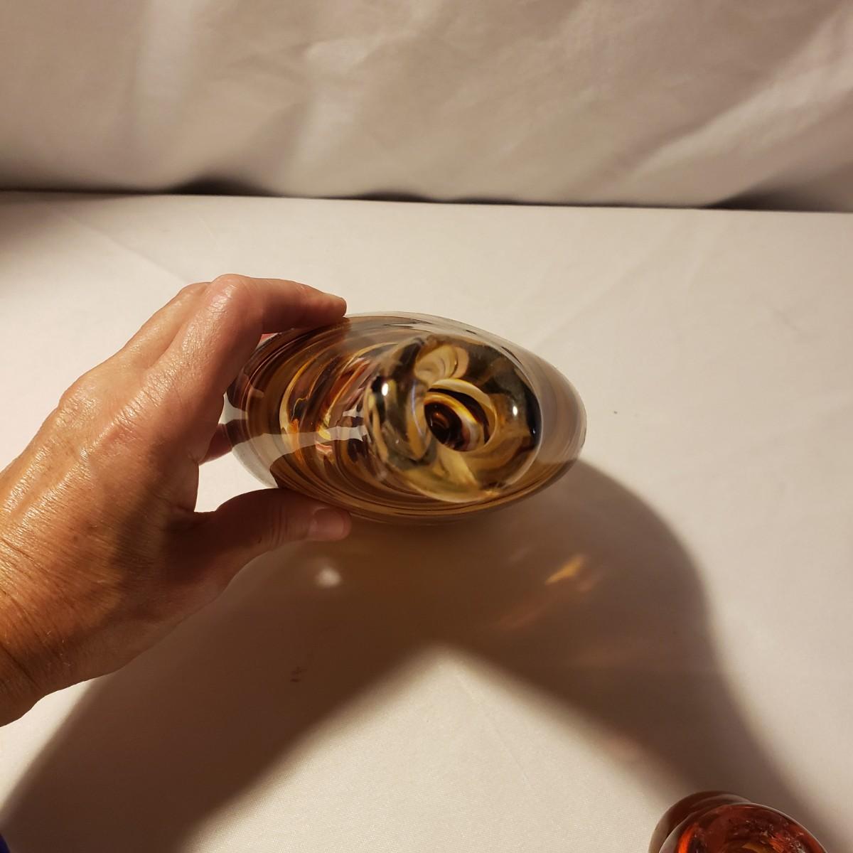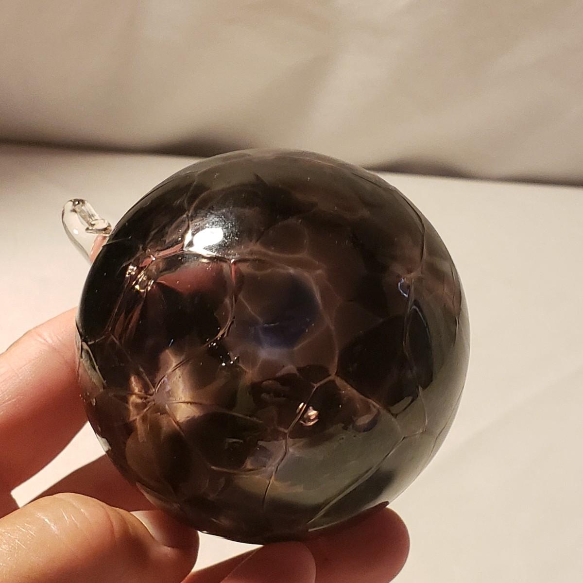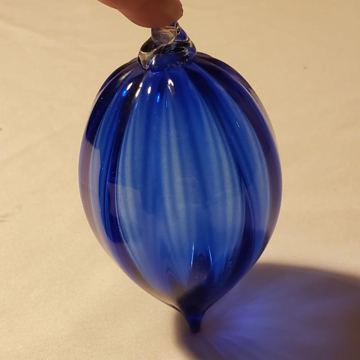This glass lot features a beautiful hand-blown vase, two ornaments with stand and a pair of glass candlesticks. The vase is blown in browns, tans and soft yellows. It measures 5" x 10"H. The two ornaments have a loop hole so that it can hang on the metal stand (6" x 12"H). The blue ornament feels ribbed and the dark purple one has a crackle effect. The pair of candlesticks are in an amber color and are heavy to the touch. The pair measure 3" x 3"H. There is some wax residue on them.