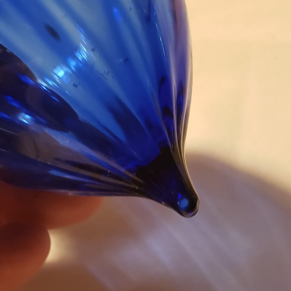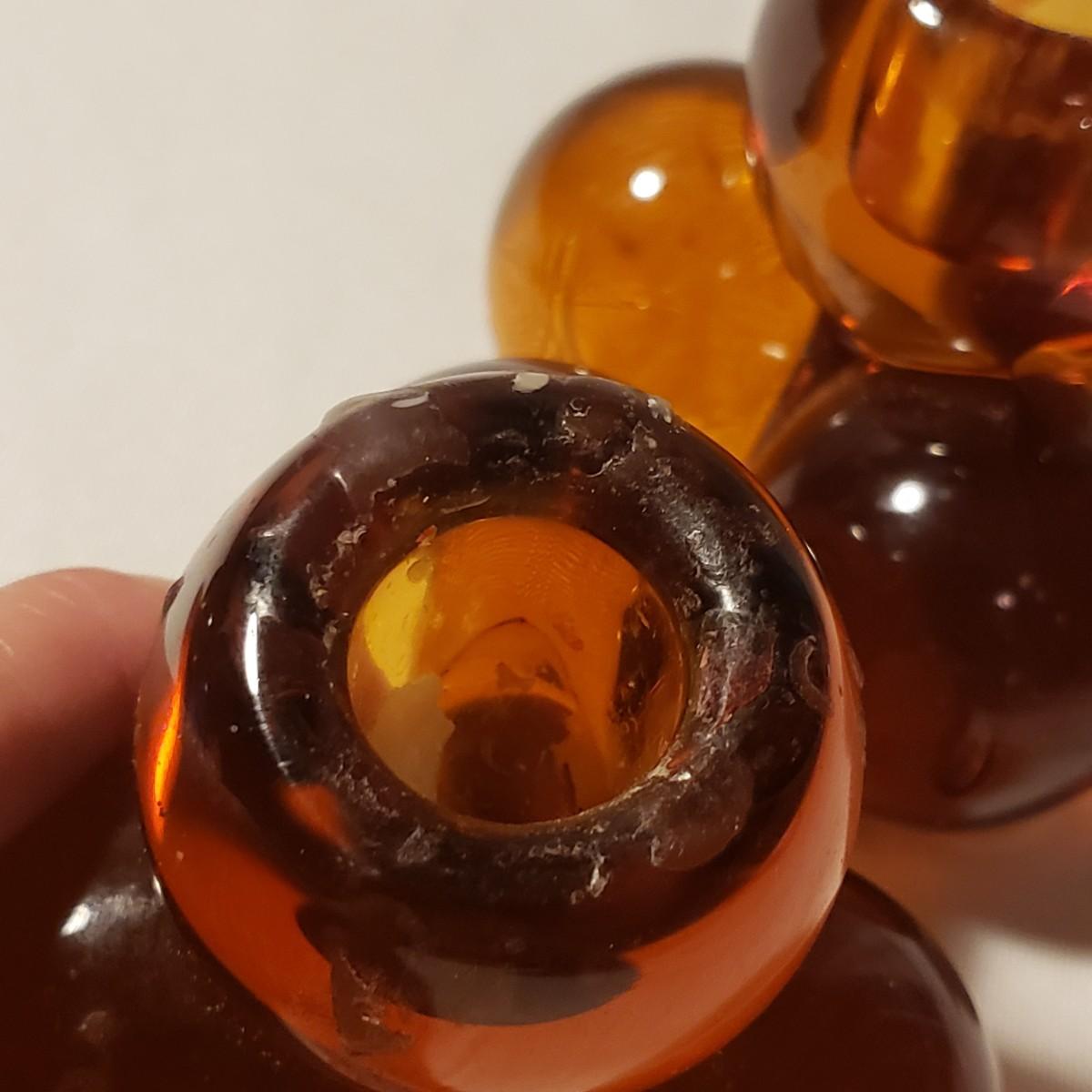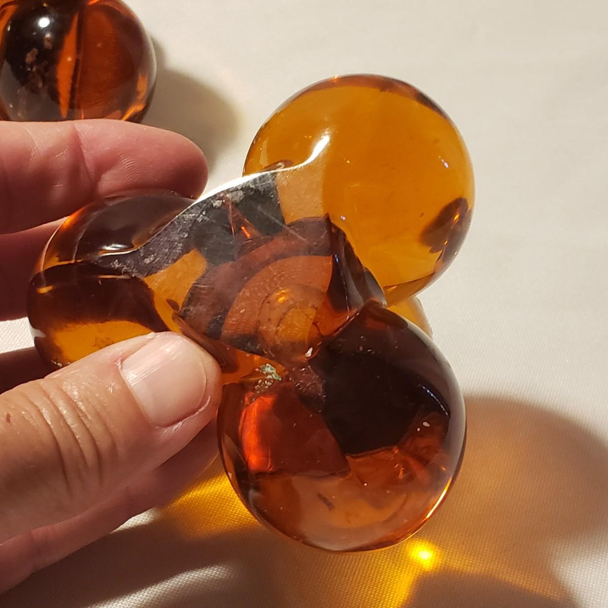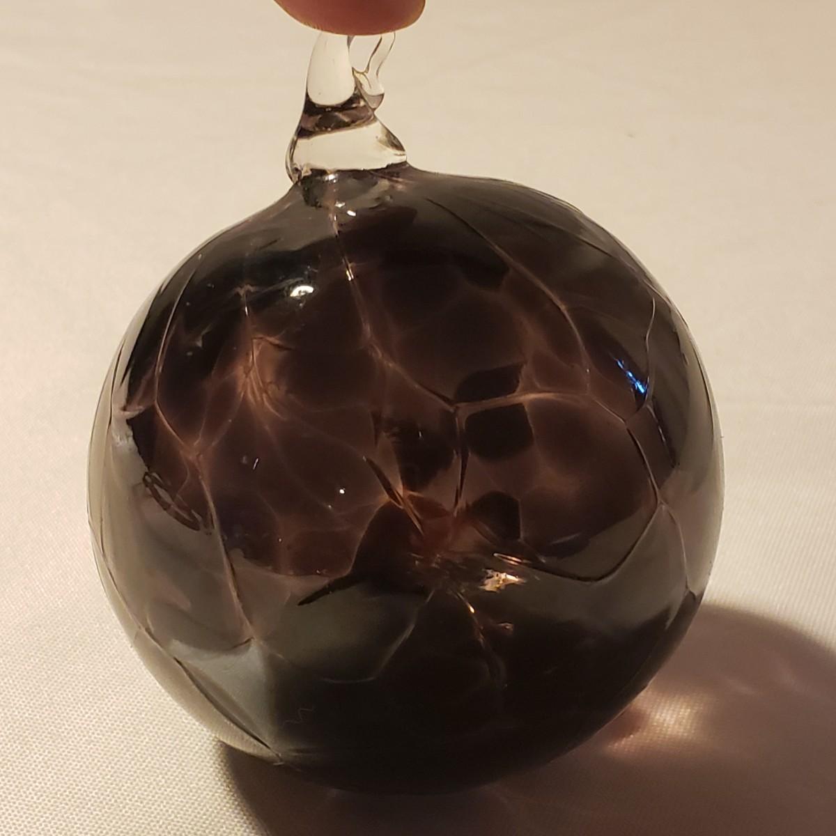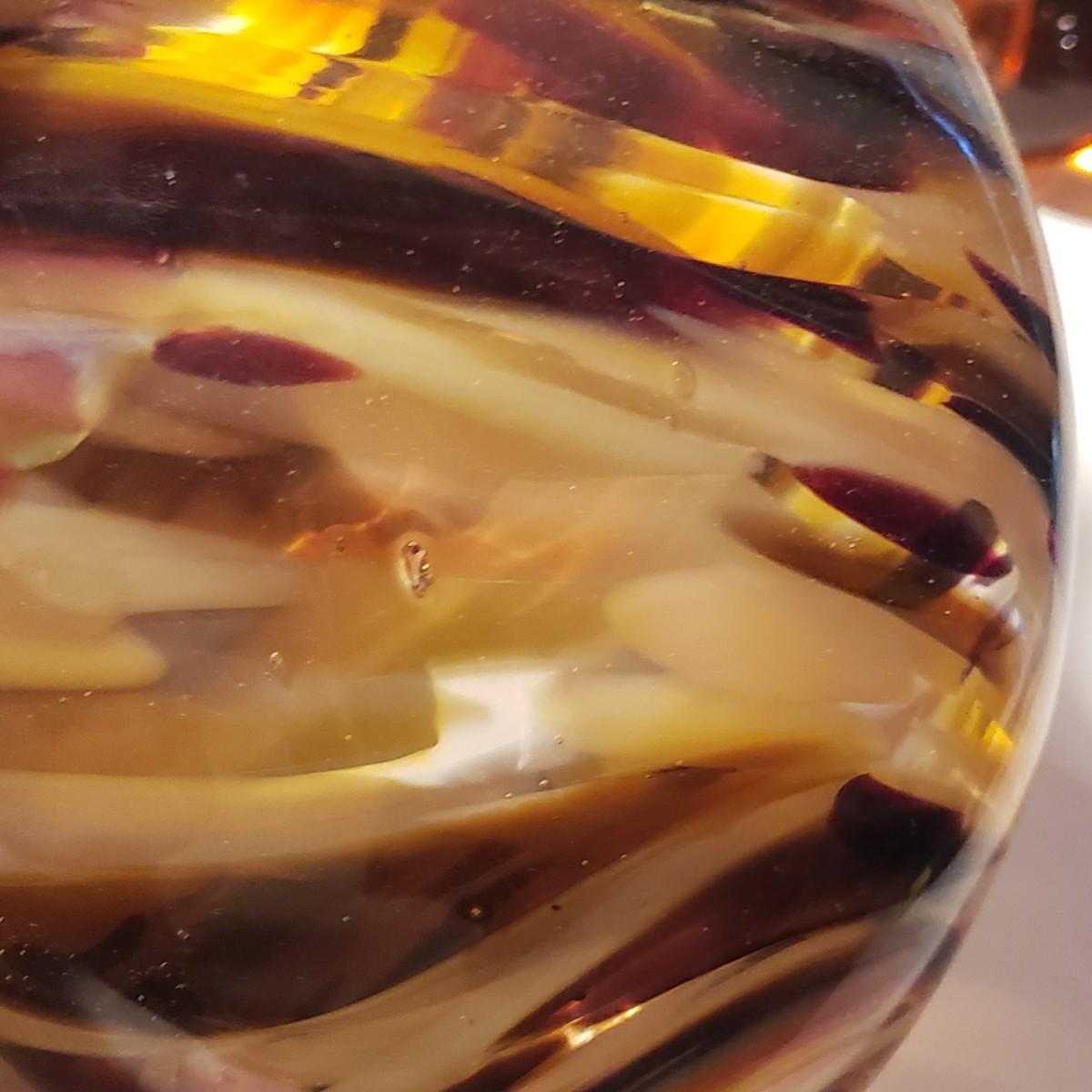 This glass lot features a beautiful hand-blown vase, two ornaments with stand and a pair of glass candlesticks. The vase is blown in browns, tans and soft yellows. It measures 5" x 10"H. The two ornaments have a loop hole so that it can hang on the metal stand (6" x 12"H). The blue ornament feels ribbed and the dark purple one has a crackle effect. The pair of candlesticks are in an amber color and are heavy to the touch. The pair measure 3" x 3"H. There is some wax residue on them.