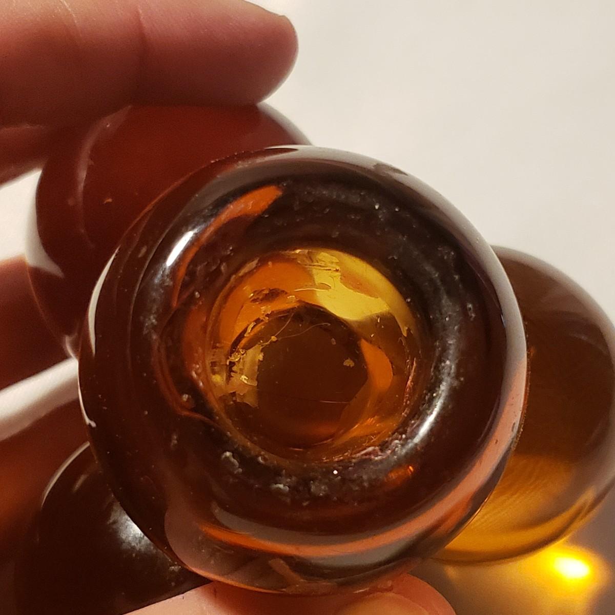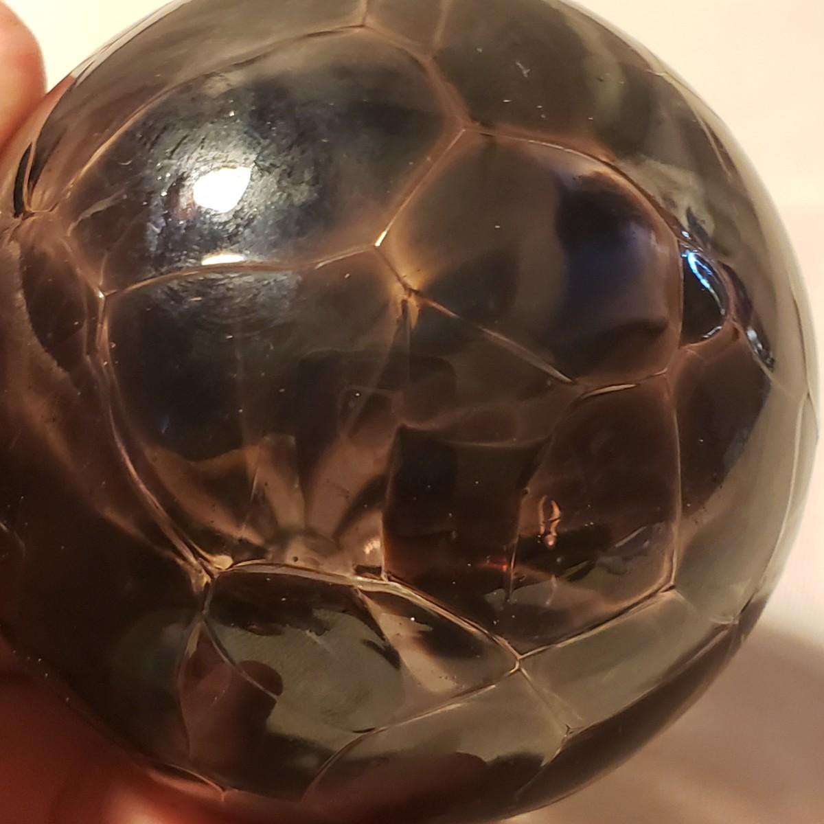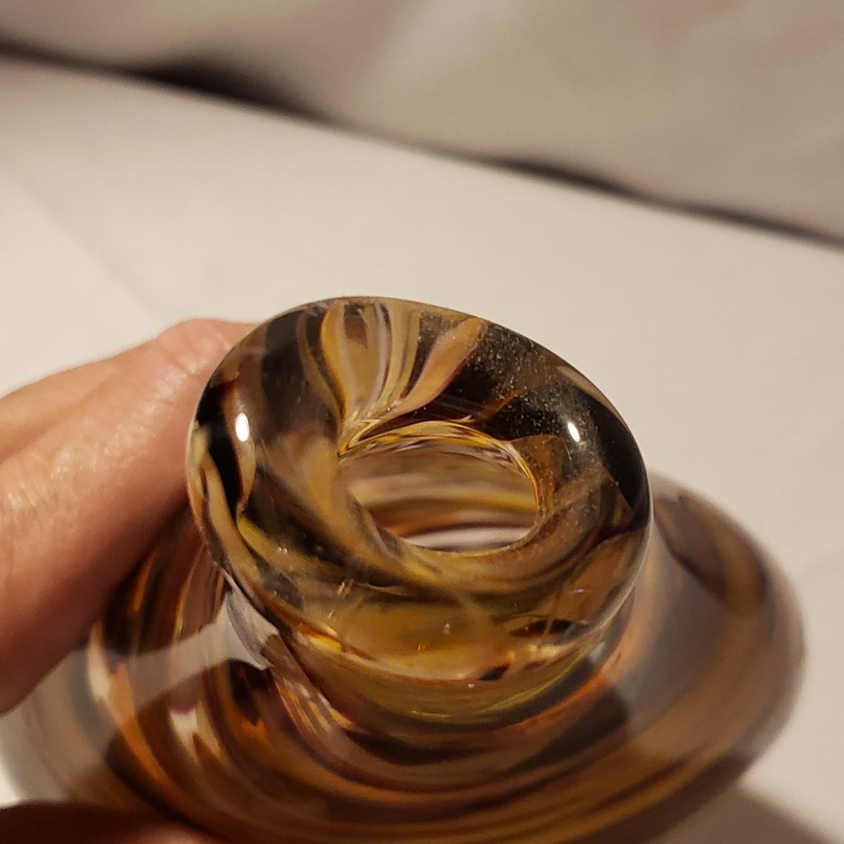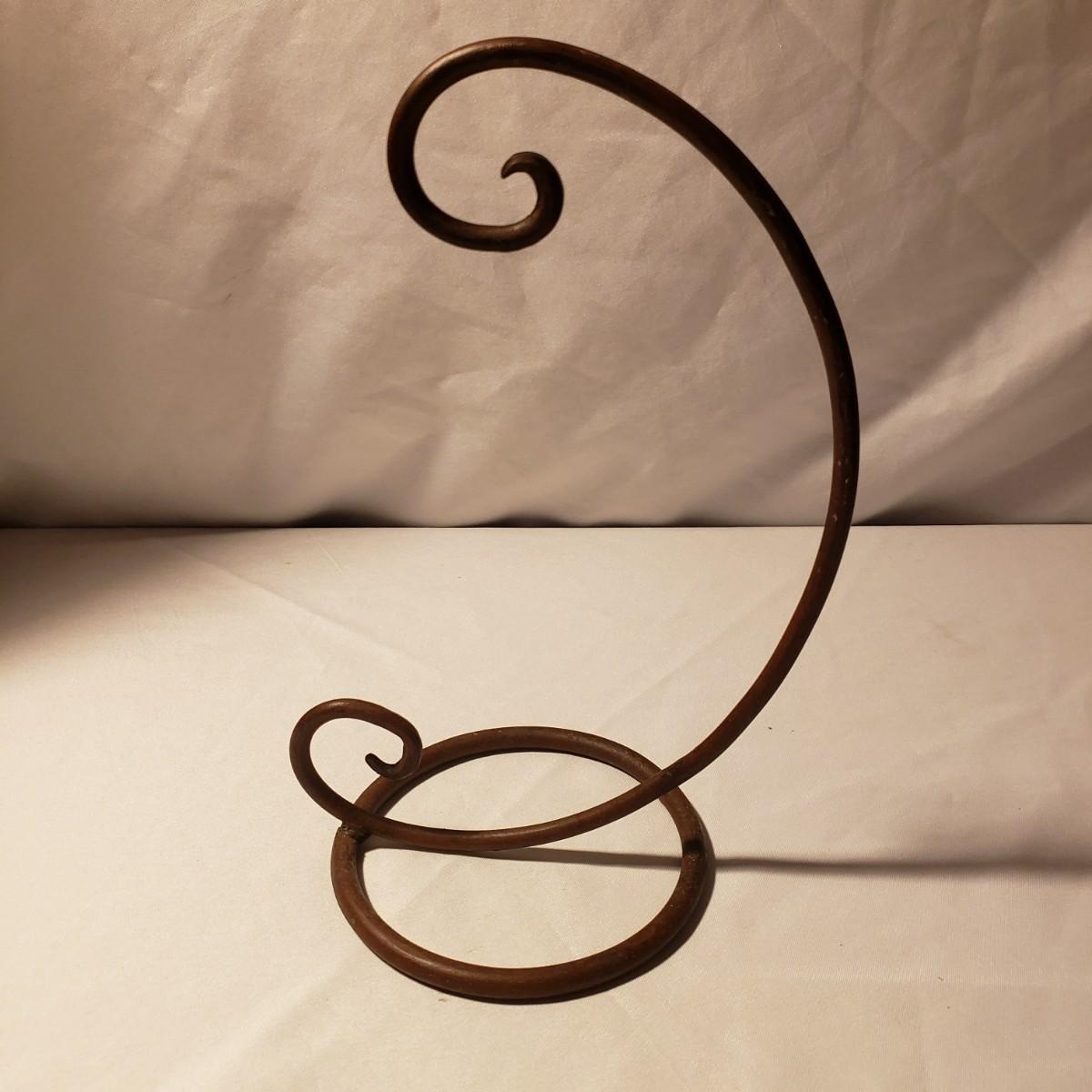 This glass lot features a beautiful hand-blown vase, two ornaments with stand and a pair of glass candlesticks. The vase is blown in browns, tans and soft yellows. It measures 5" x 10"H. The two ornaments have a loop hole so that it can hang on the metal stand (6" x 12"H). The blue ornament feels ribbed and the dark purple one has a crackle effect. The pair of candlesticks are in an amber color and are heavy to the touch. The pair measure 3" x 3"H. There is some wax residue on them.