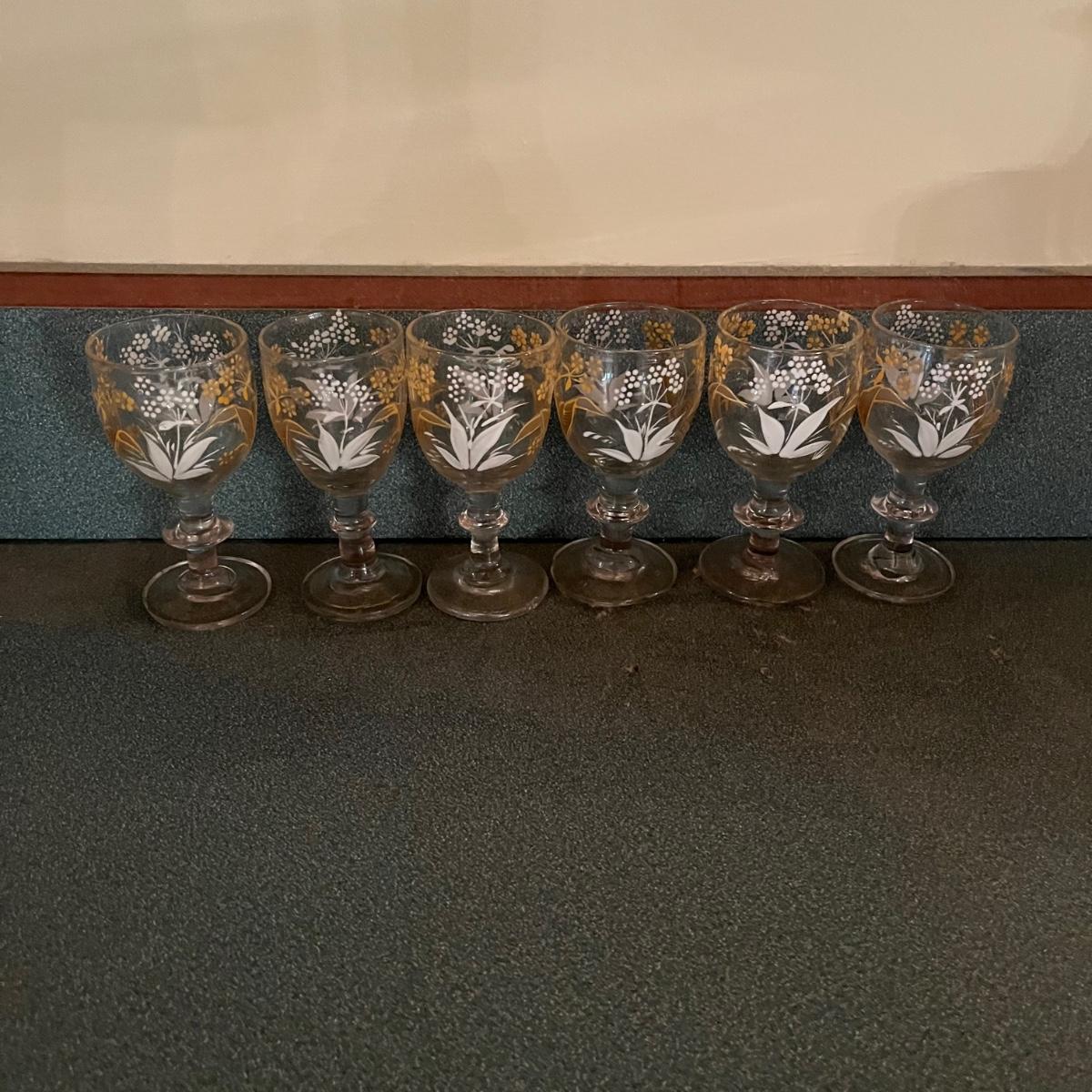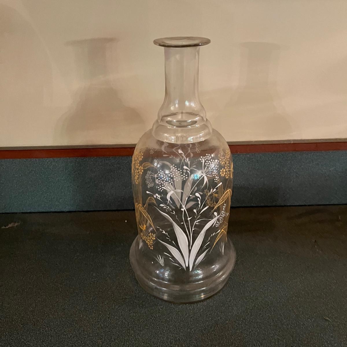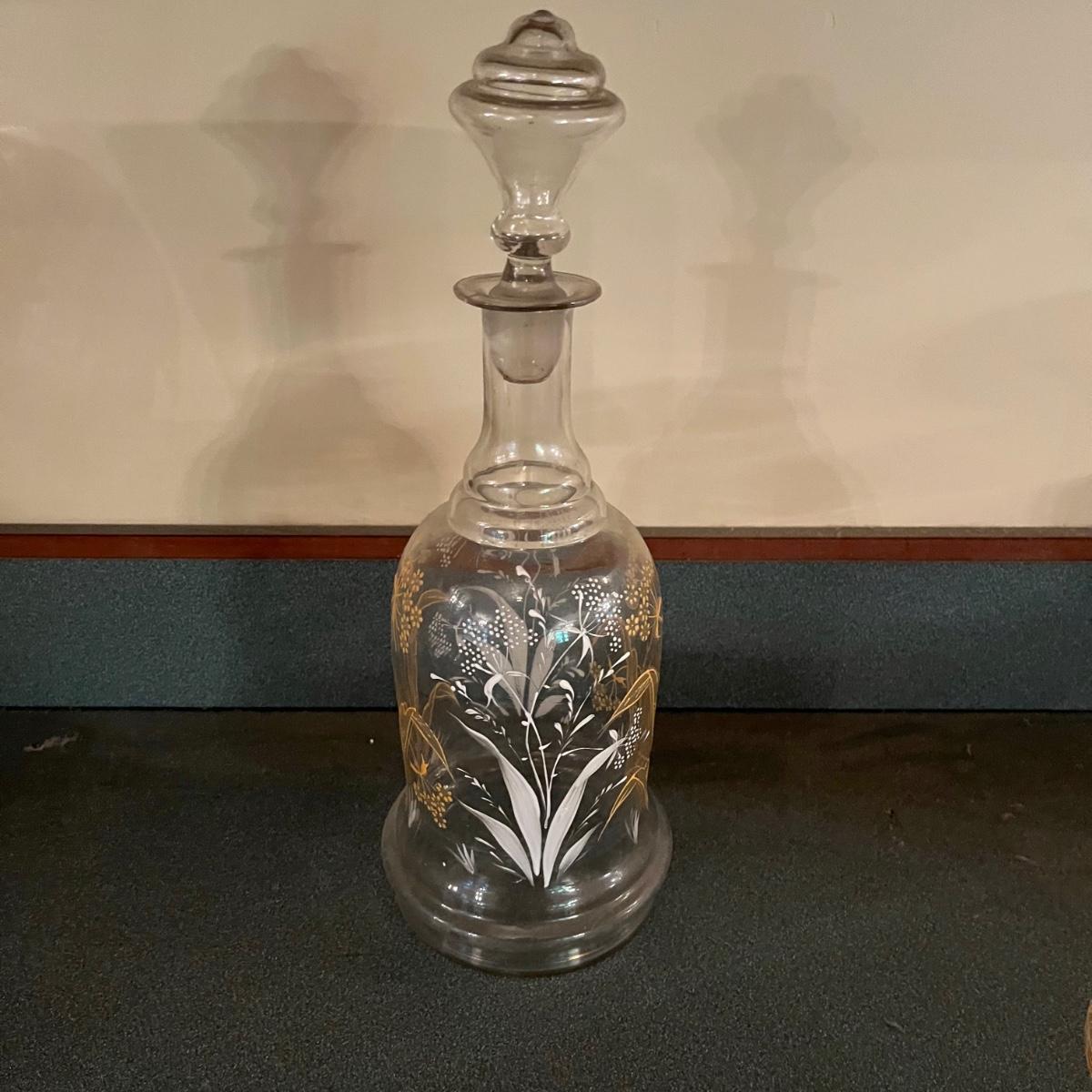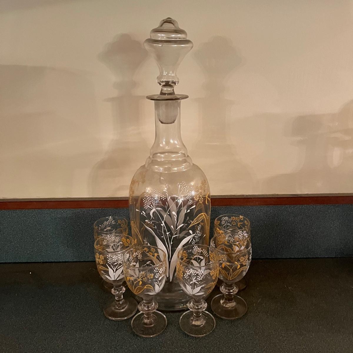Lot includes a hand painted and blown glass decanter with six glasses. Decanter measures 4.5”D x 13” tall.