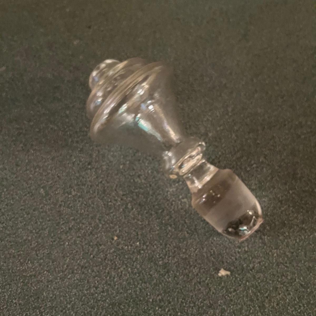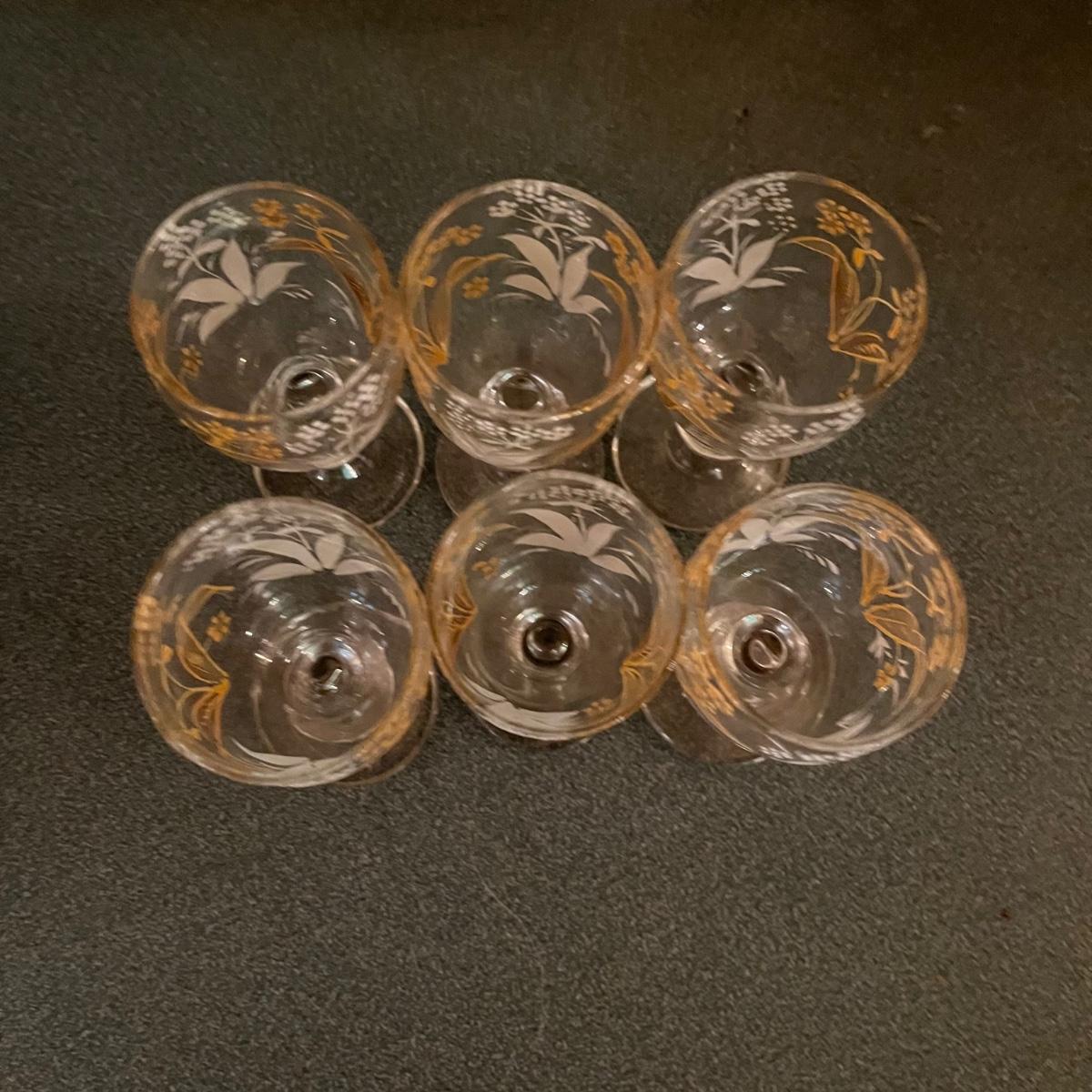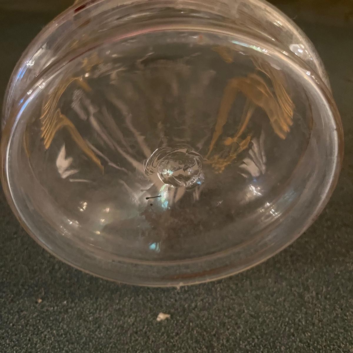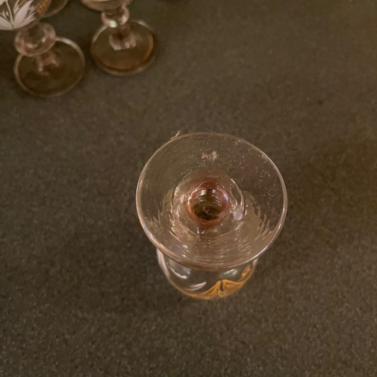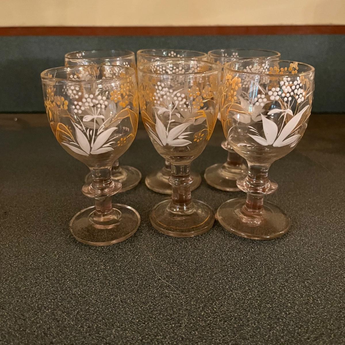 Lot includes a hand painted and blown glass decanter with six glasses. Decanter measures 4.5”D x 13” tall.