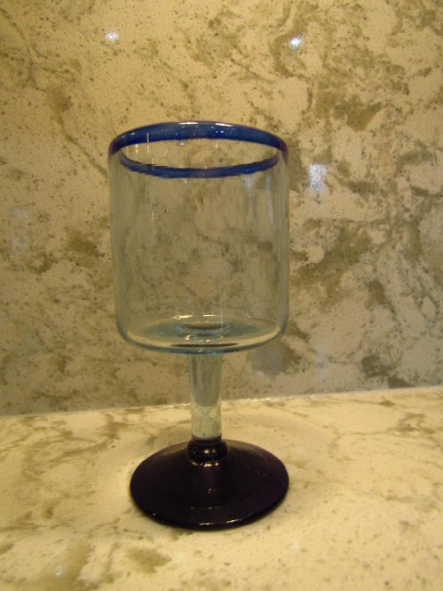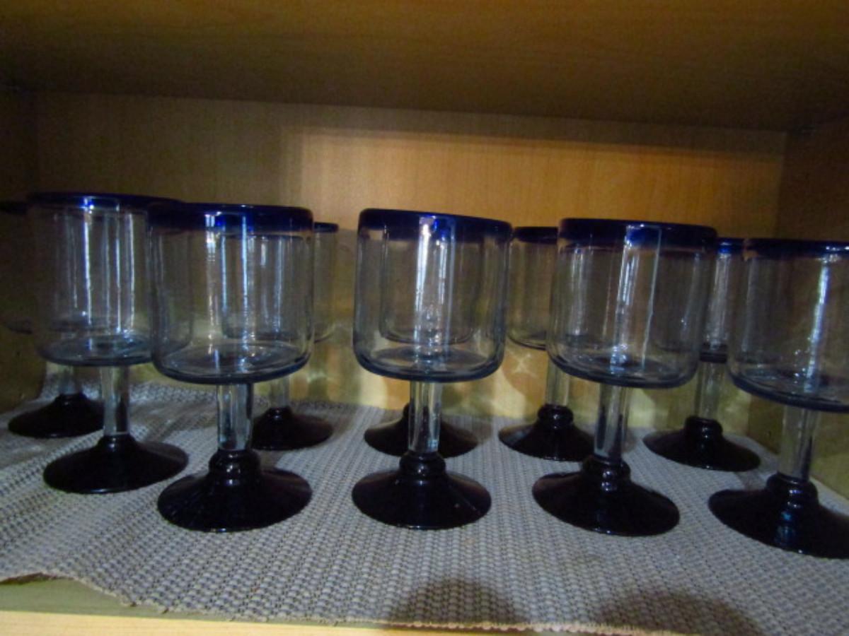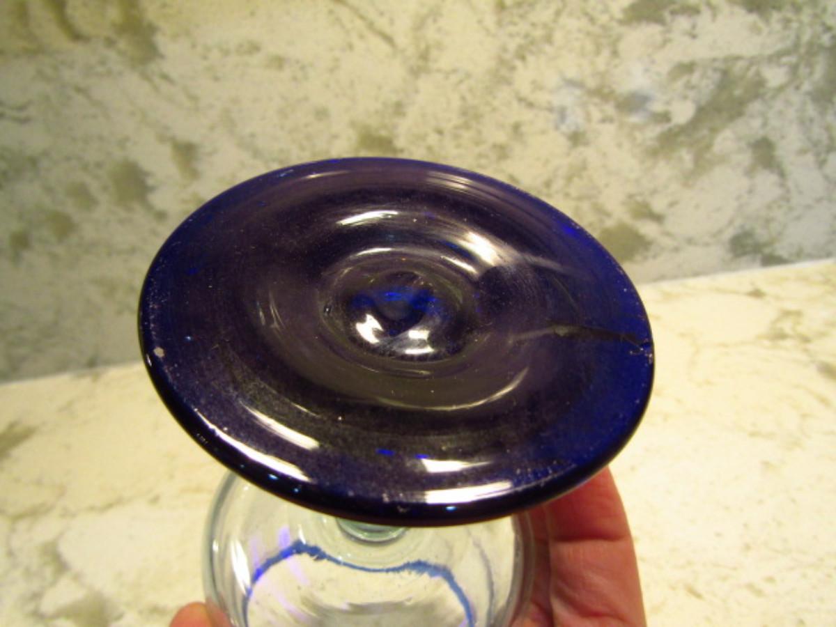 Hand Blown Stemmed Wine/Parfait Glasses- 11 Pieces (Kitchen). Clear and cobalt blue with air inclusions.