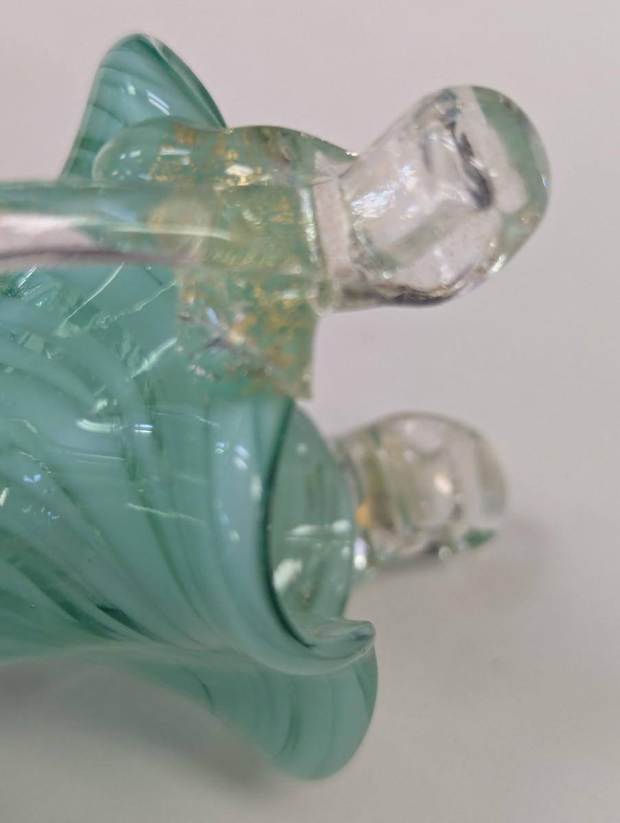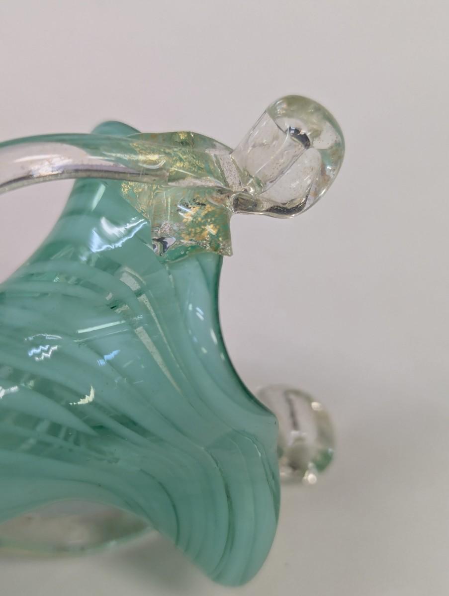 The green vase has a shape edge on the top of the handle. It is not chipped appears to be made that way