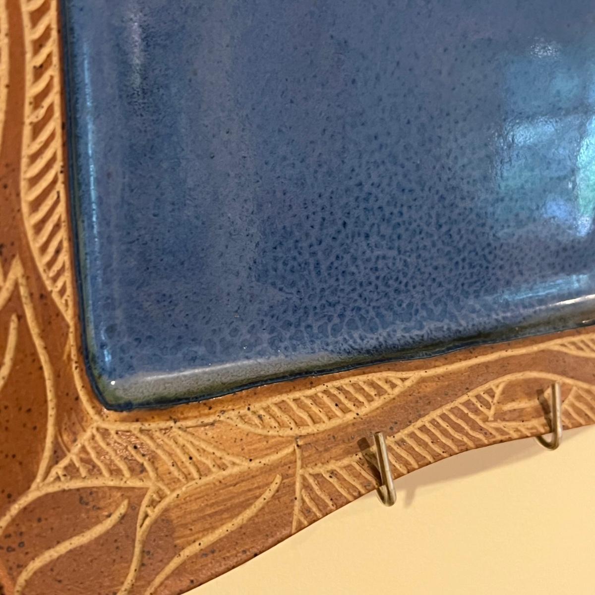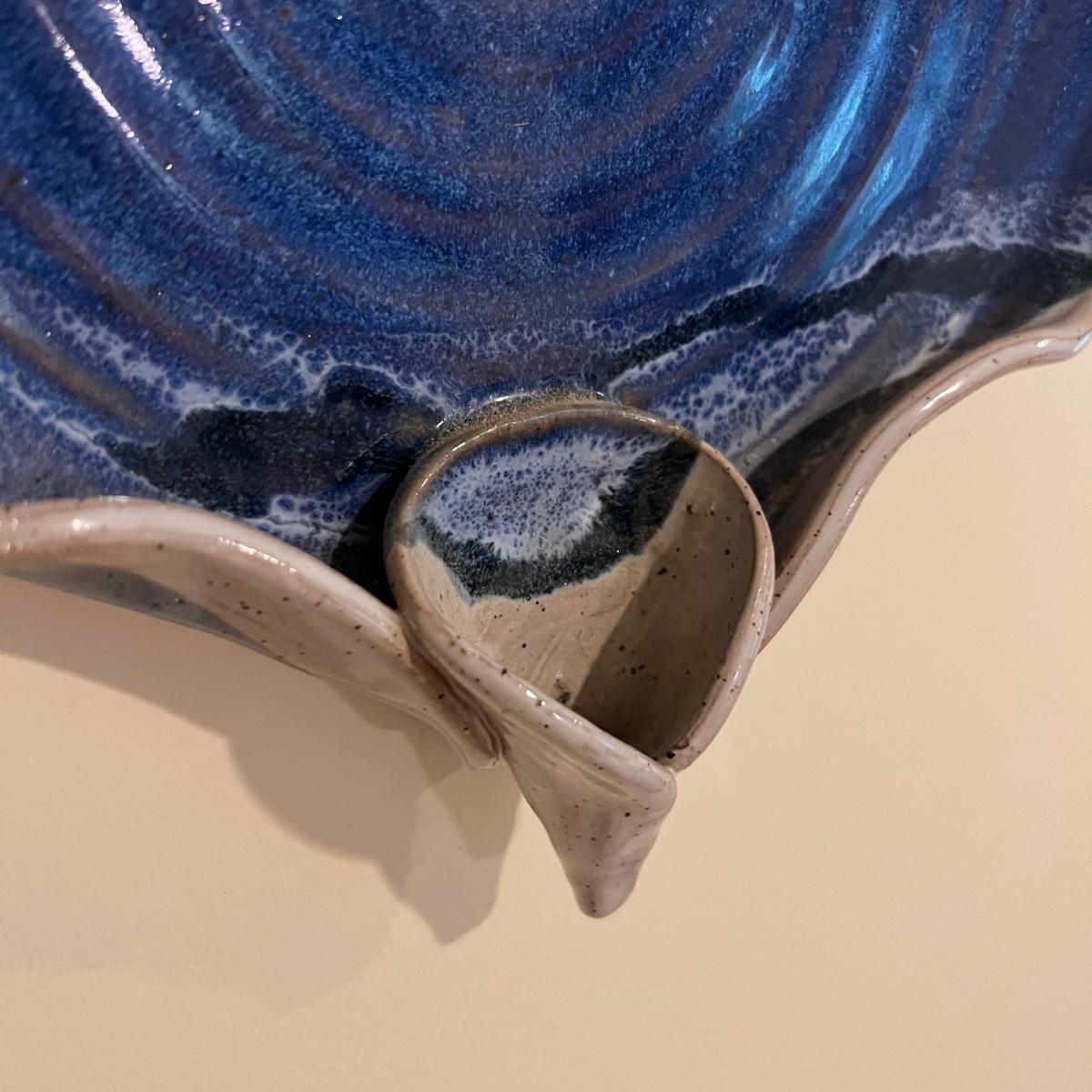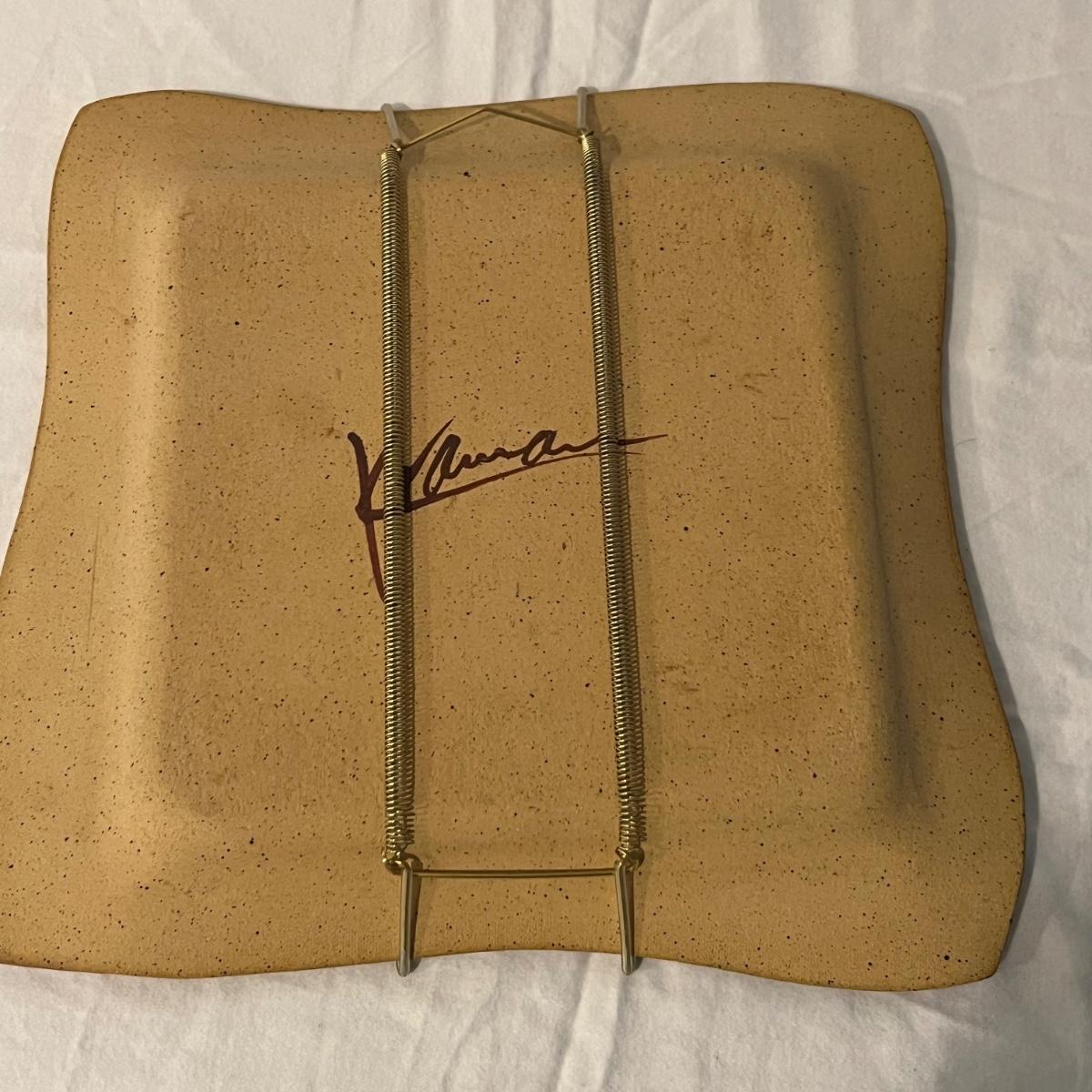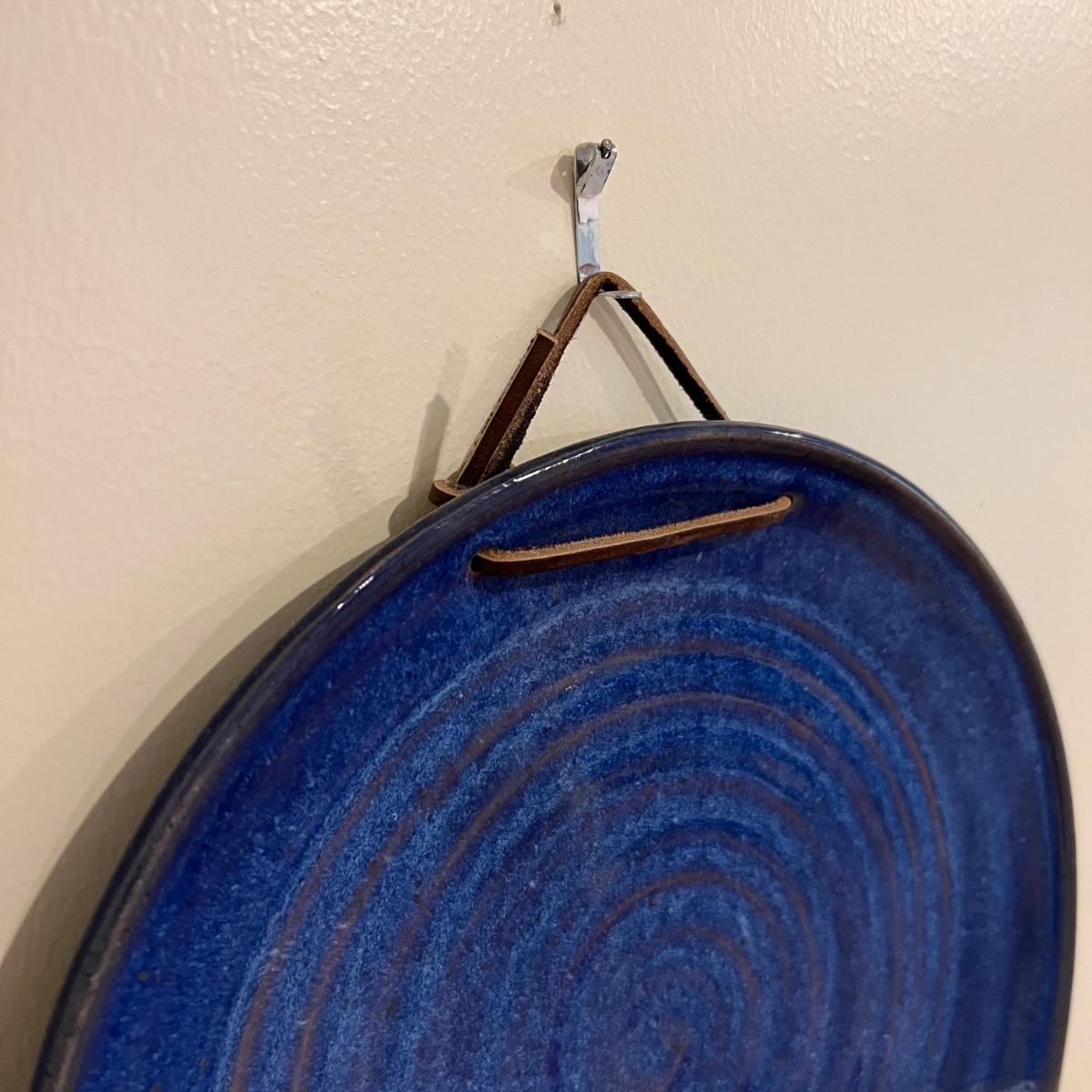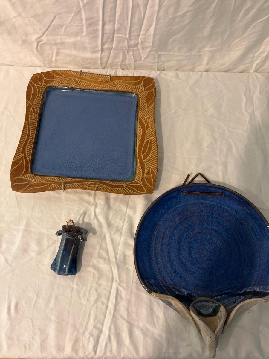 Of these two hand built plates, the blue and grey one features a leather hanging strap and has a built in small vase at its base perfect for a sprig of small flowers. The other plate comes with a gold colored removable hanging hook. Both the plates are signed, see images, the small hanging bud vase does not have a signature.
