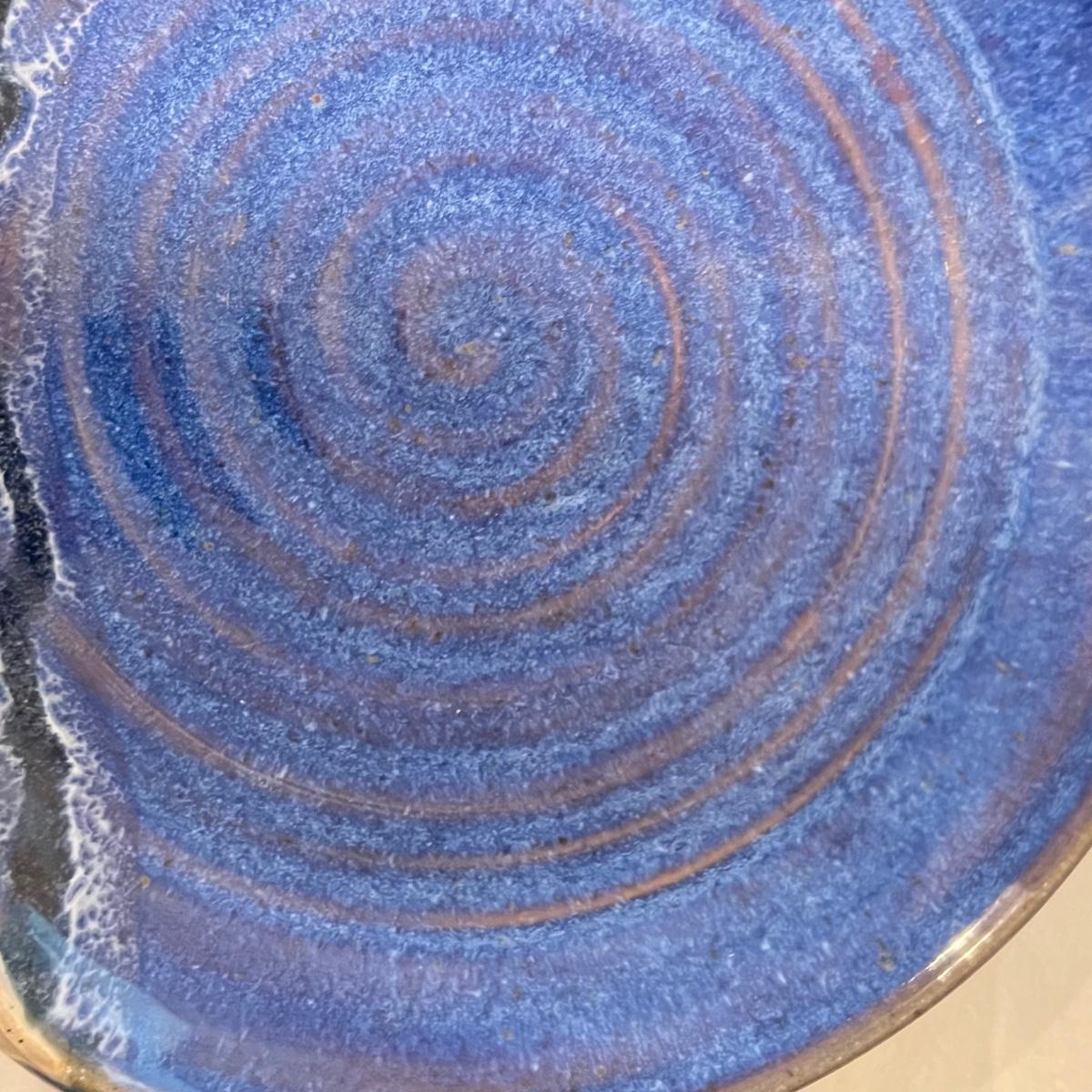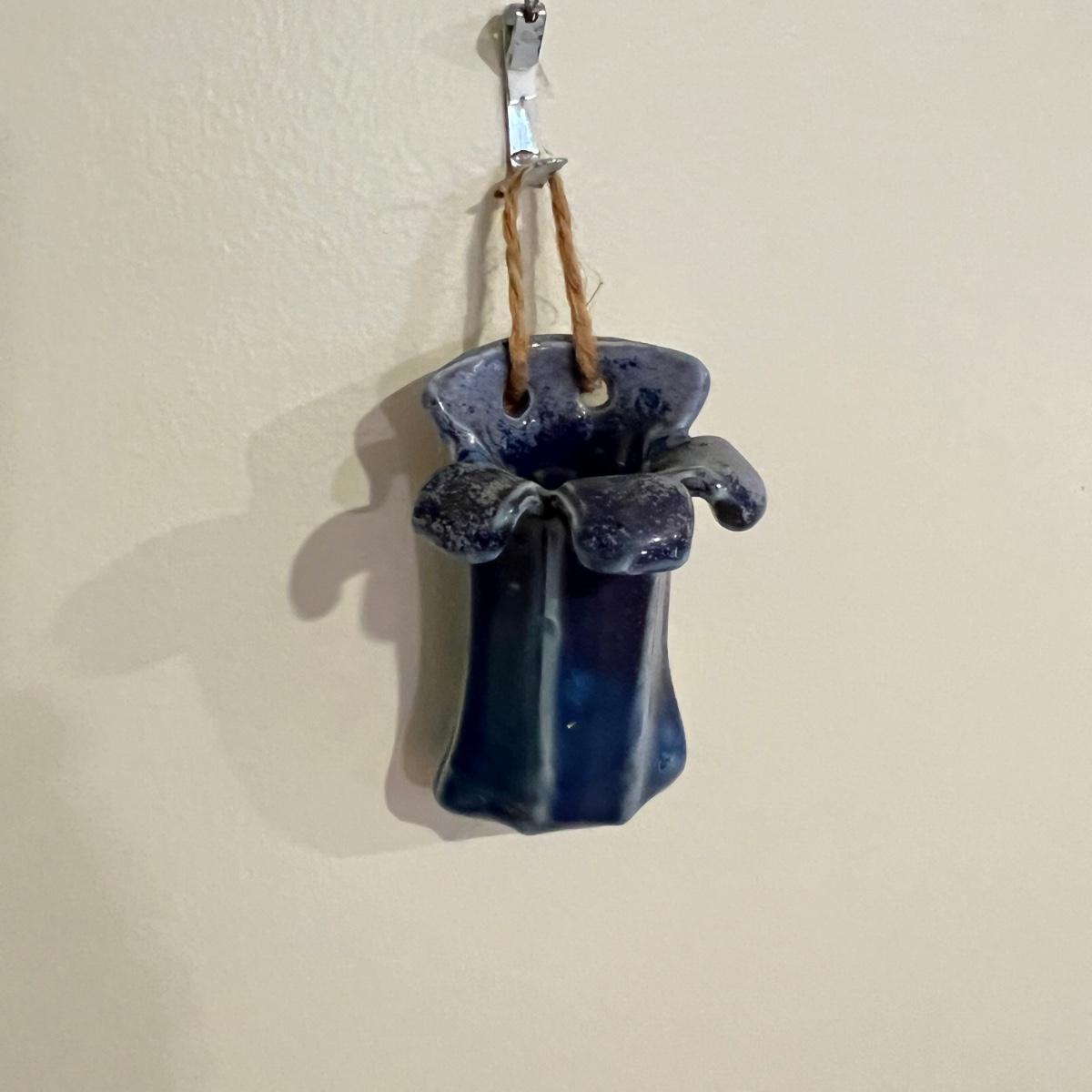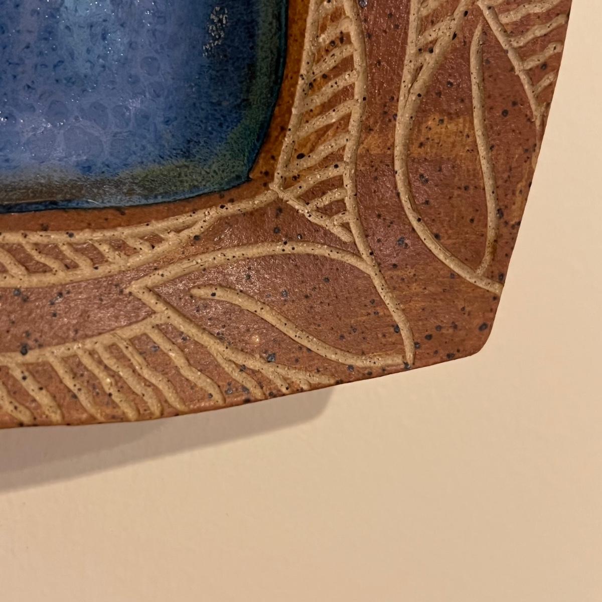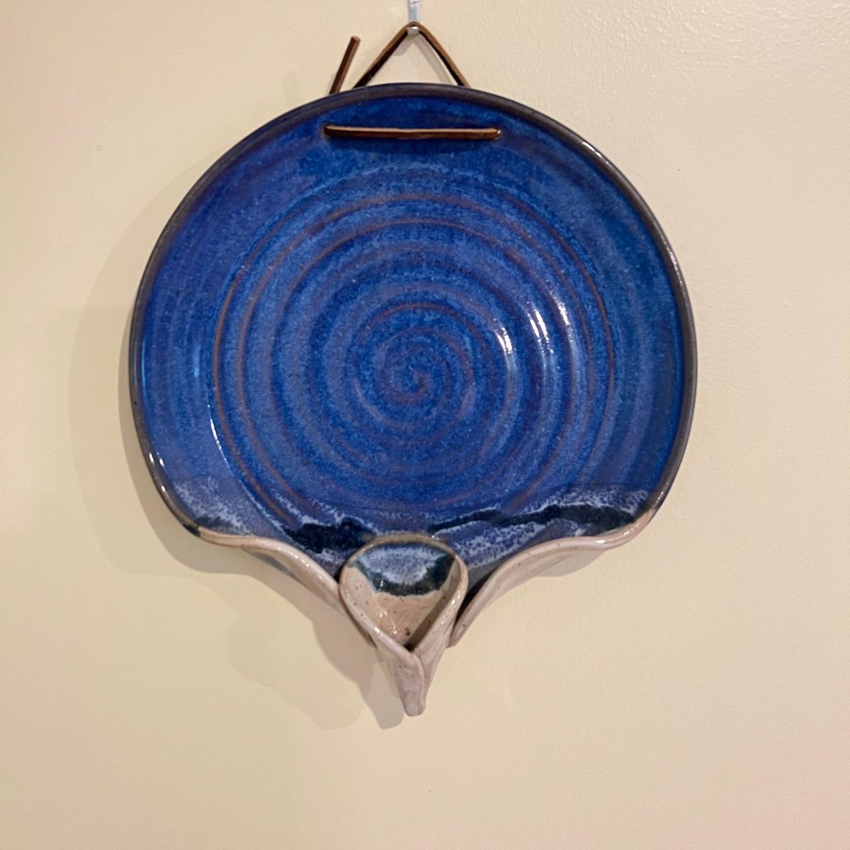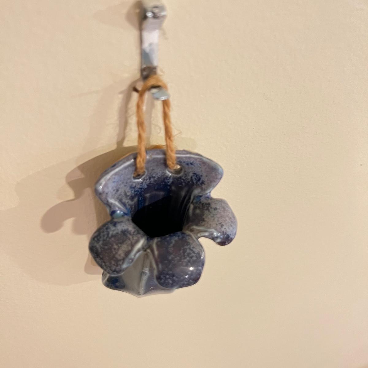 Of these two hand built plates, the blue and grey one features a leather hanging strap and has a built in small vase at its base perfect for a sprig of small flowers. The other plate comes with a gold colored removable hanging hook. Both the plates are signed, see images, the small hanging bud vase does not have a signature.