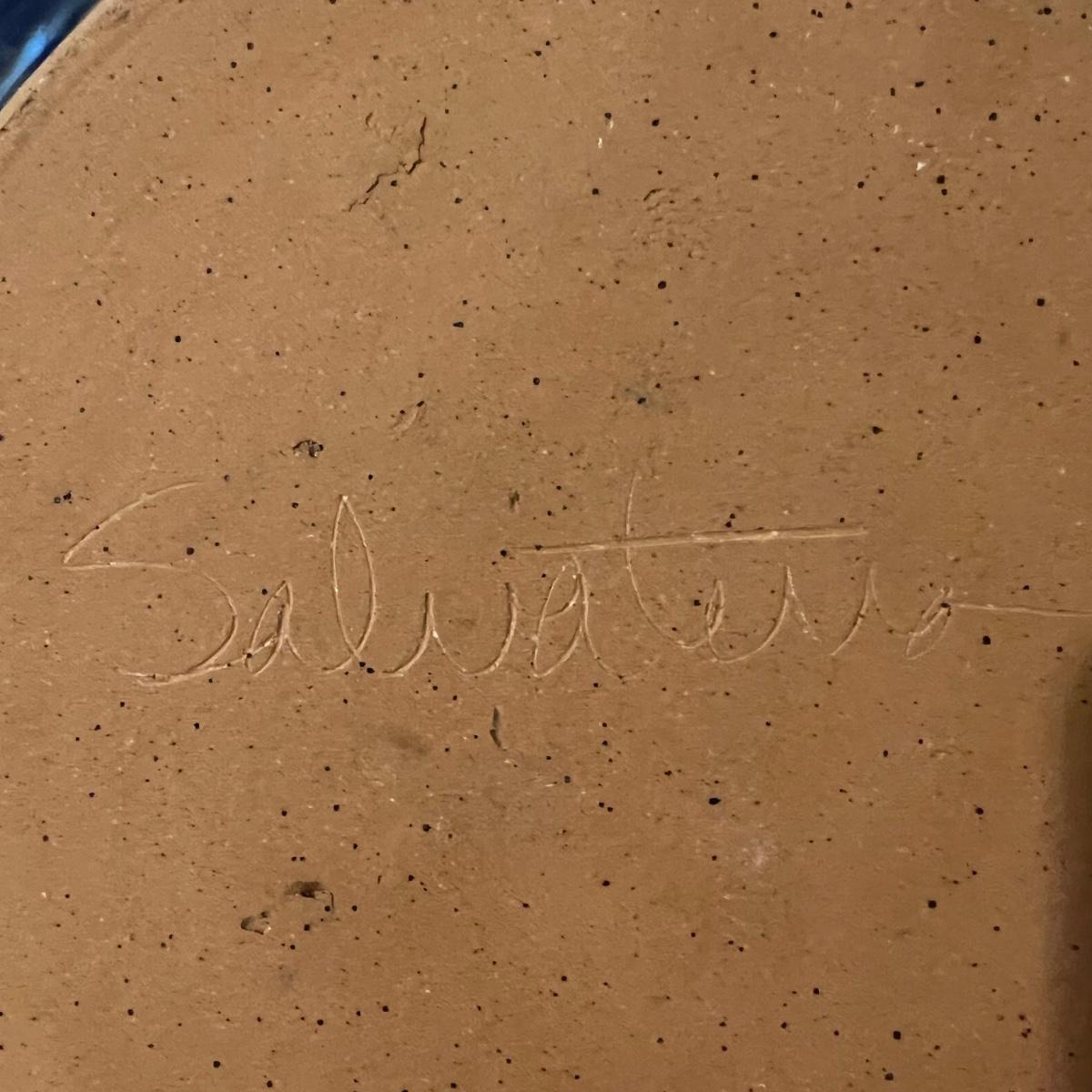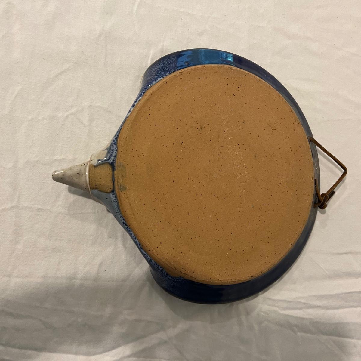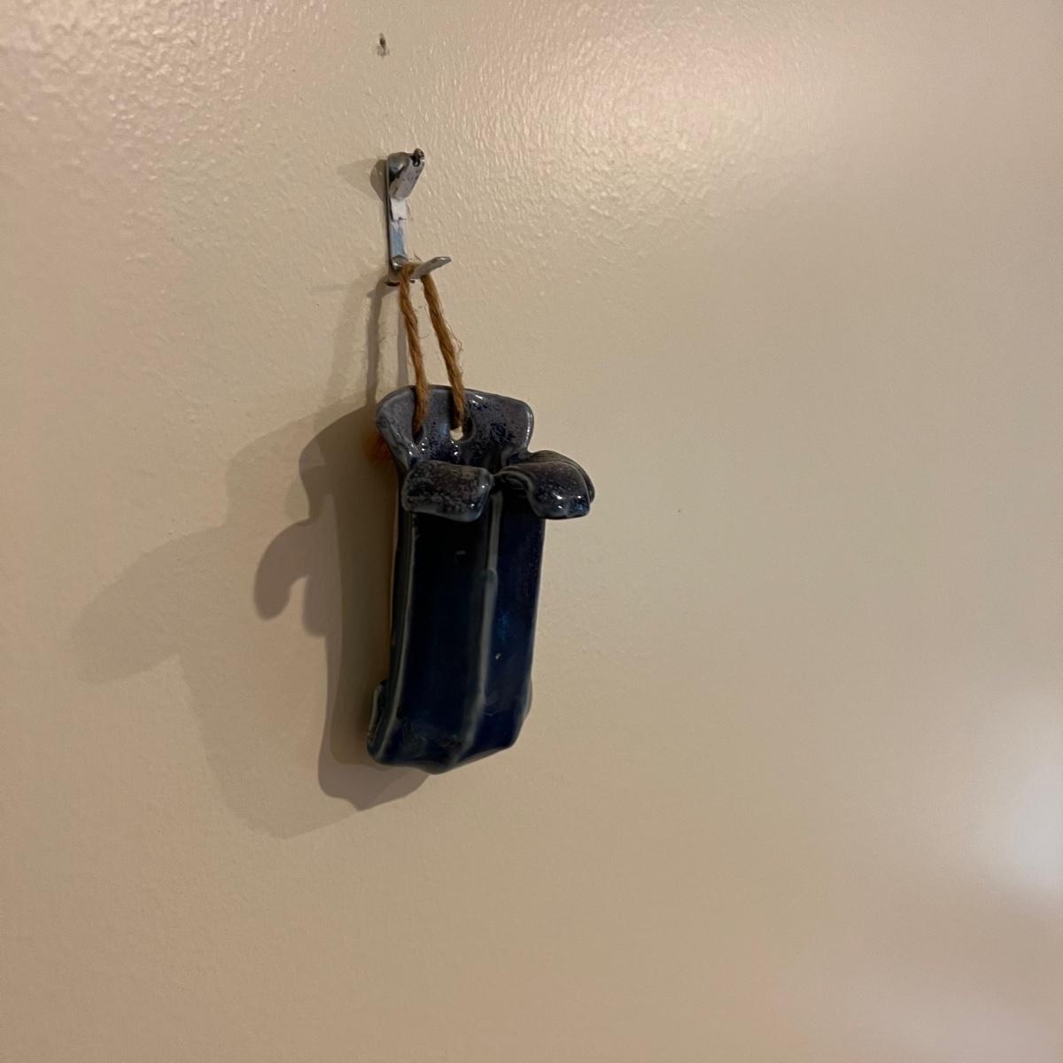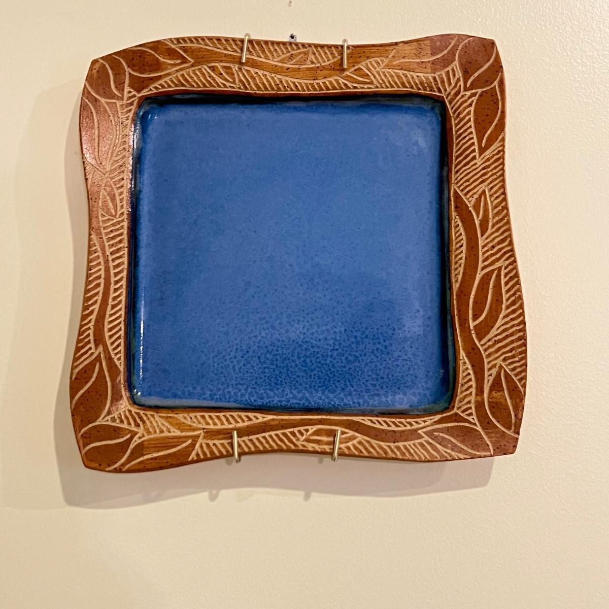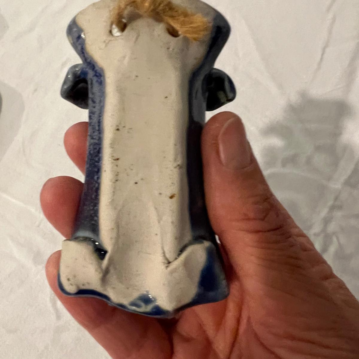 Of these two hand built plates, the blue and grey one features a leather hanging strap and has a built in small vase at its base perfect for a sprig of small flowers. The other plate comes with a gold colored removable hanging hook. Both the plates are signed, see images, the small hanging bud vase does not have a signature.