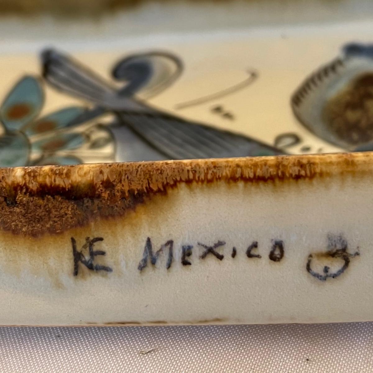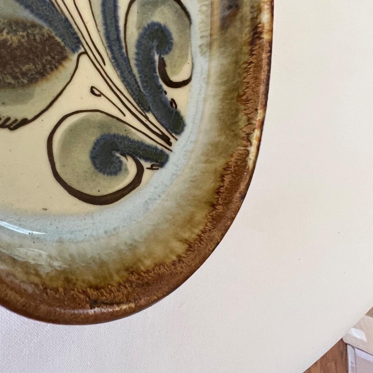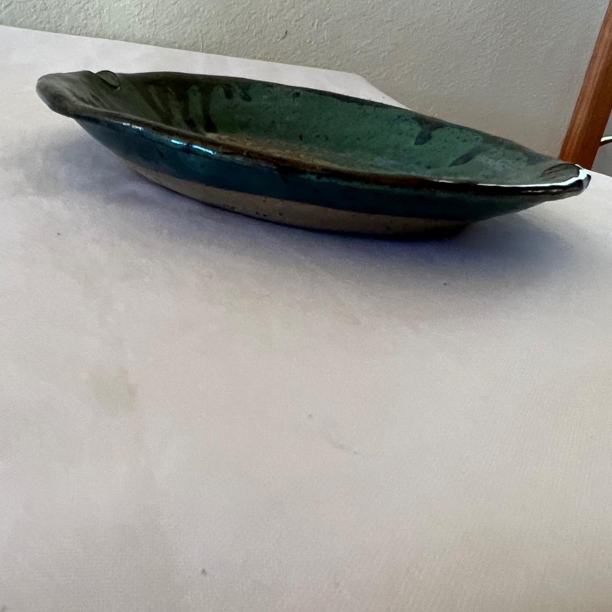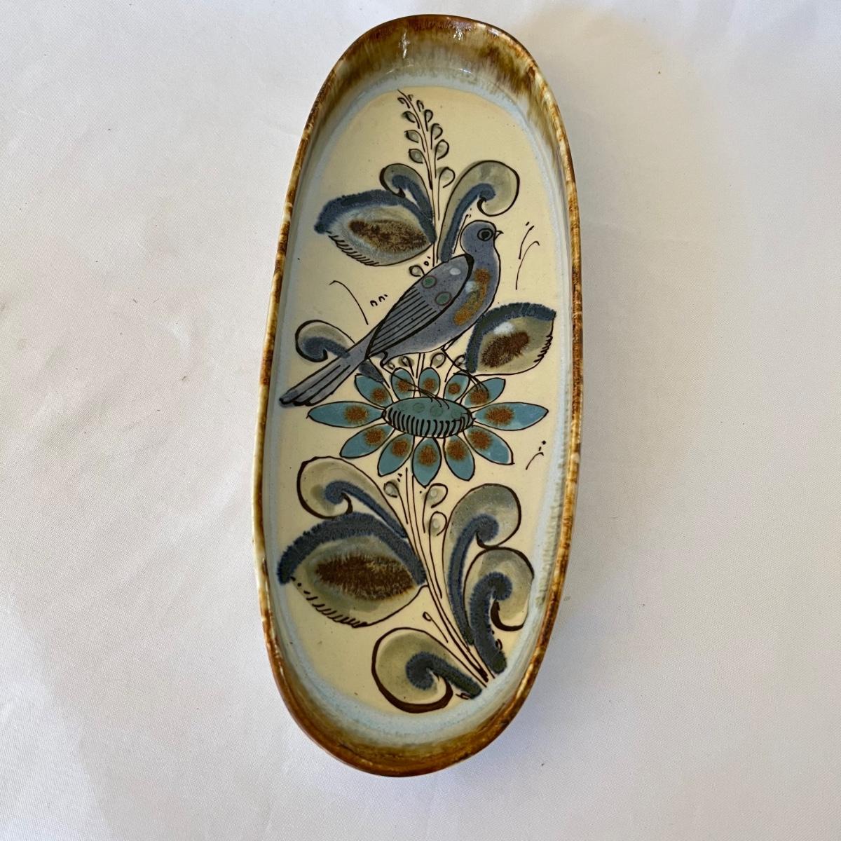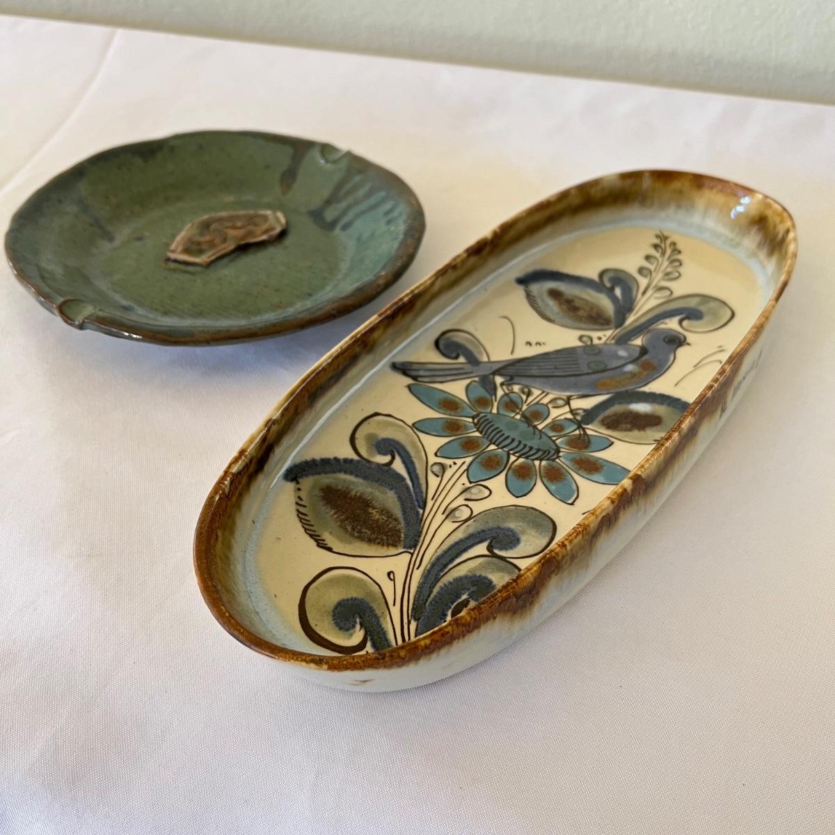 Two lovely pieces of hand made pottery in this lot. The platter is stamped KE Mexico and has a beautiful blue bird and flower painted on the inside, it measures 5” x 14” x 2”. The small speckled clay turquoise glazed plate measures 8” D and has 2 conveniently placed indents on its rim which are probably for chopsticks. Both items are in great condition with no chips or cracks.