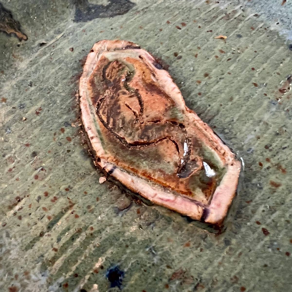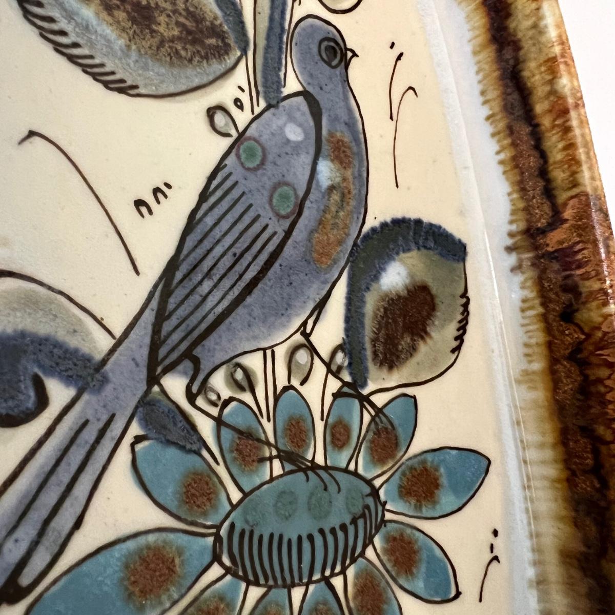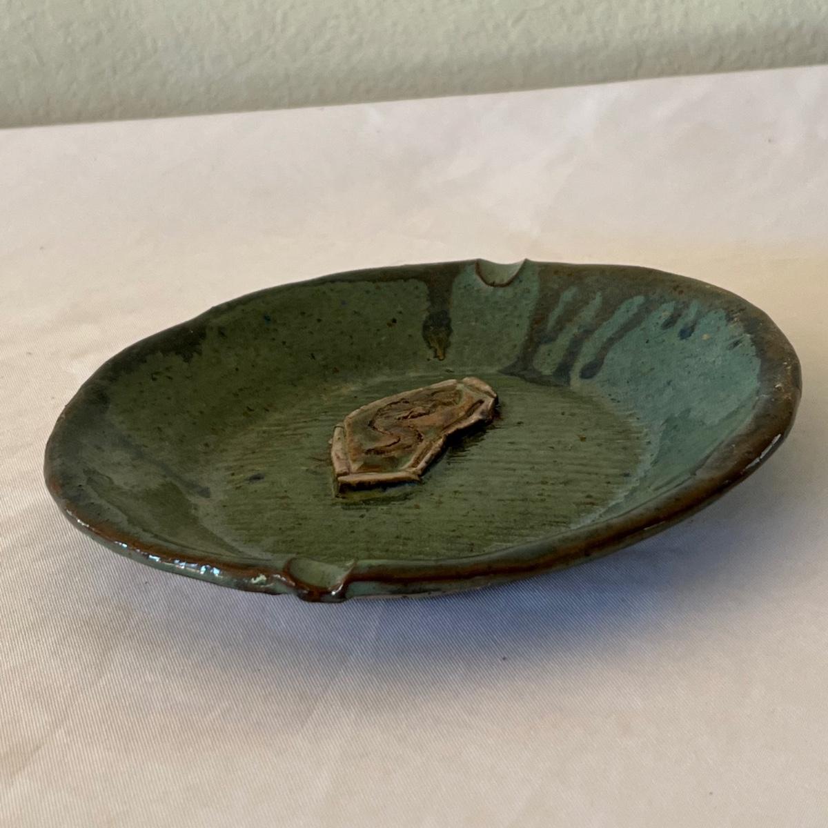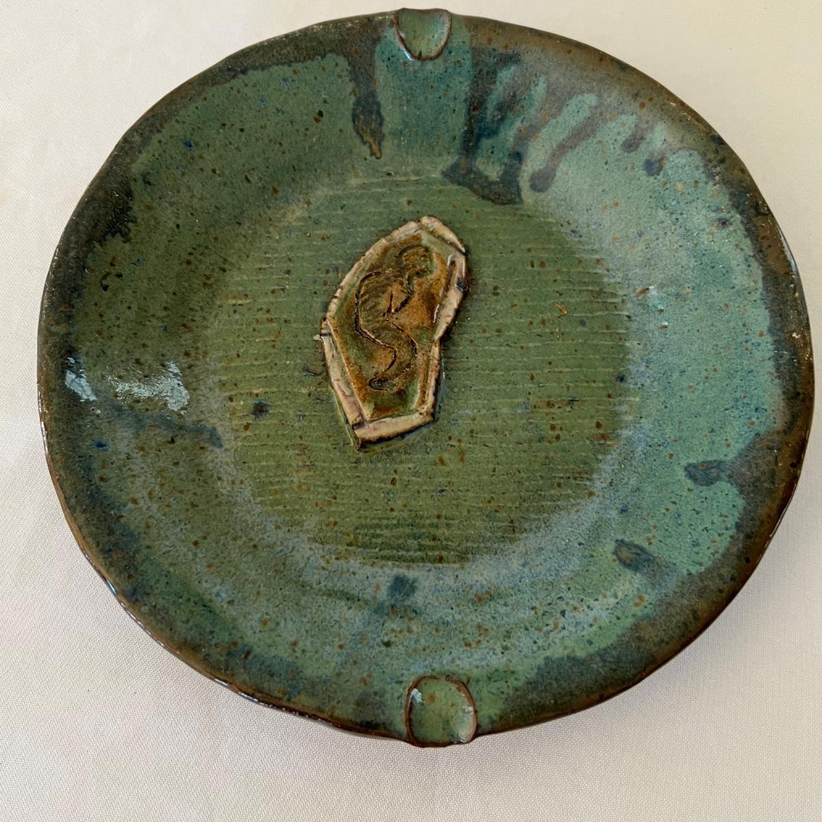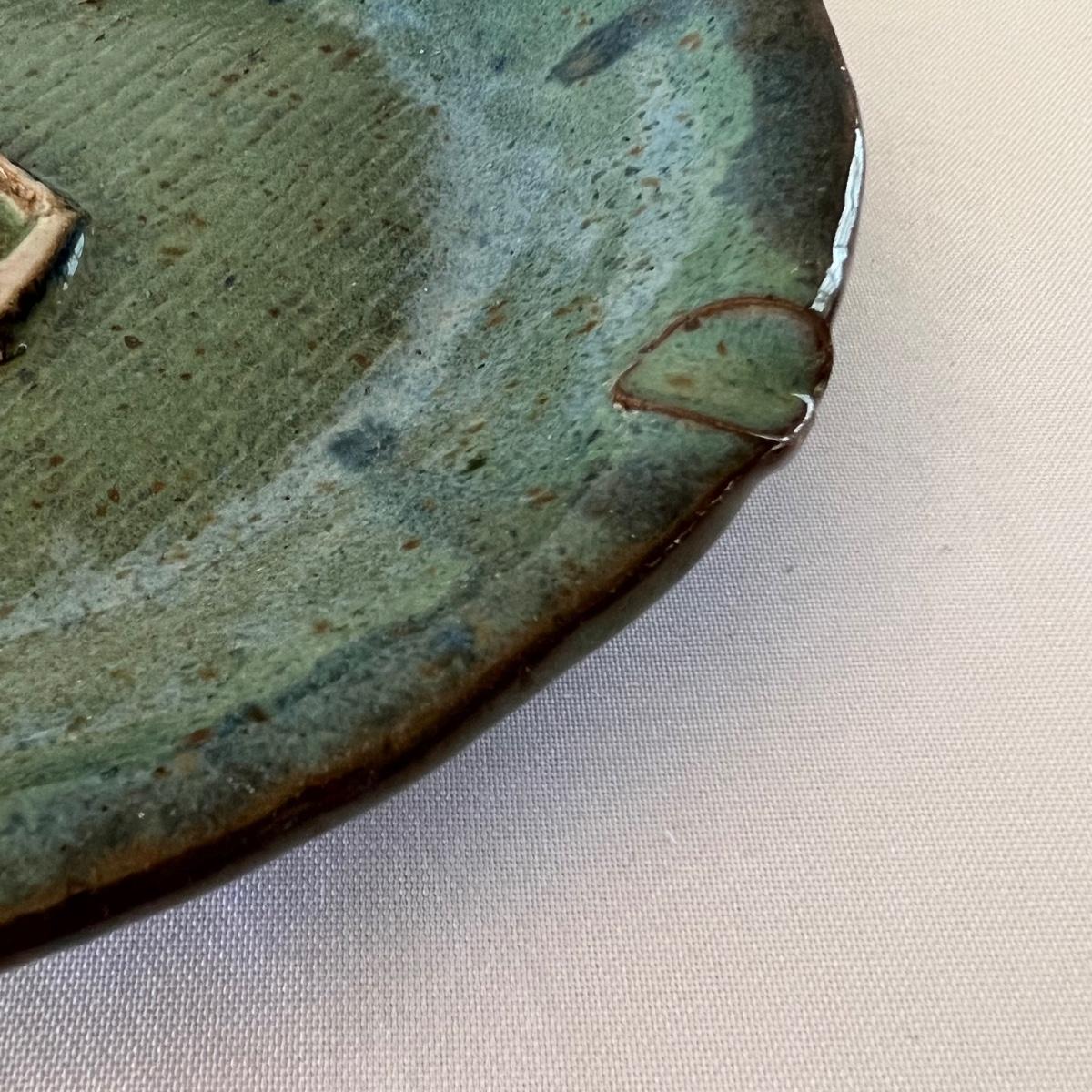 Two lovely pieces of hand made pottery in this lot. The platter is stamped KE Mexico and has a beautiful blue bird and flower painted on the inside, it measures 5” x 14” x 2”. The small speckled clay turquoise glazed plate measures 8” D and has 2 conveniently placed indents on its rim which are probably for chopsticks. Both items are in great condition with no chips or cracks.