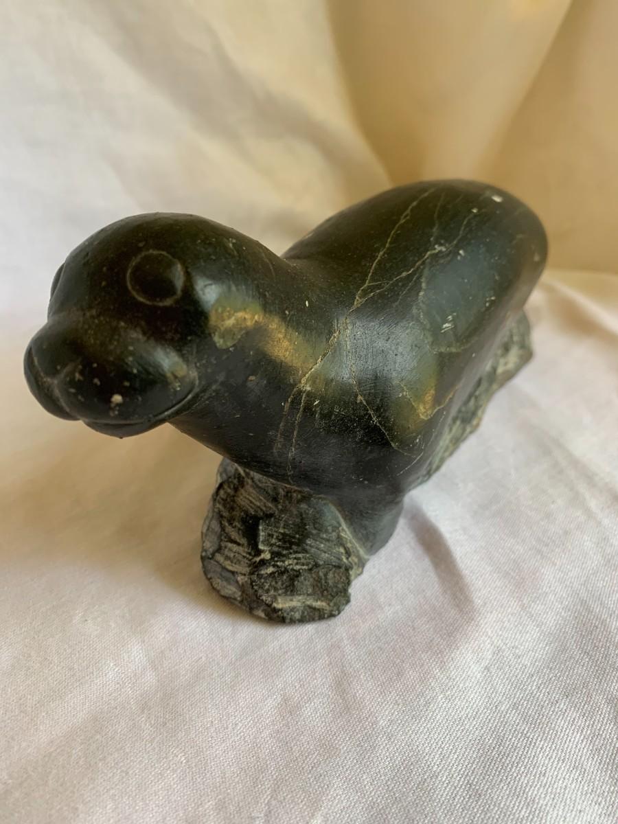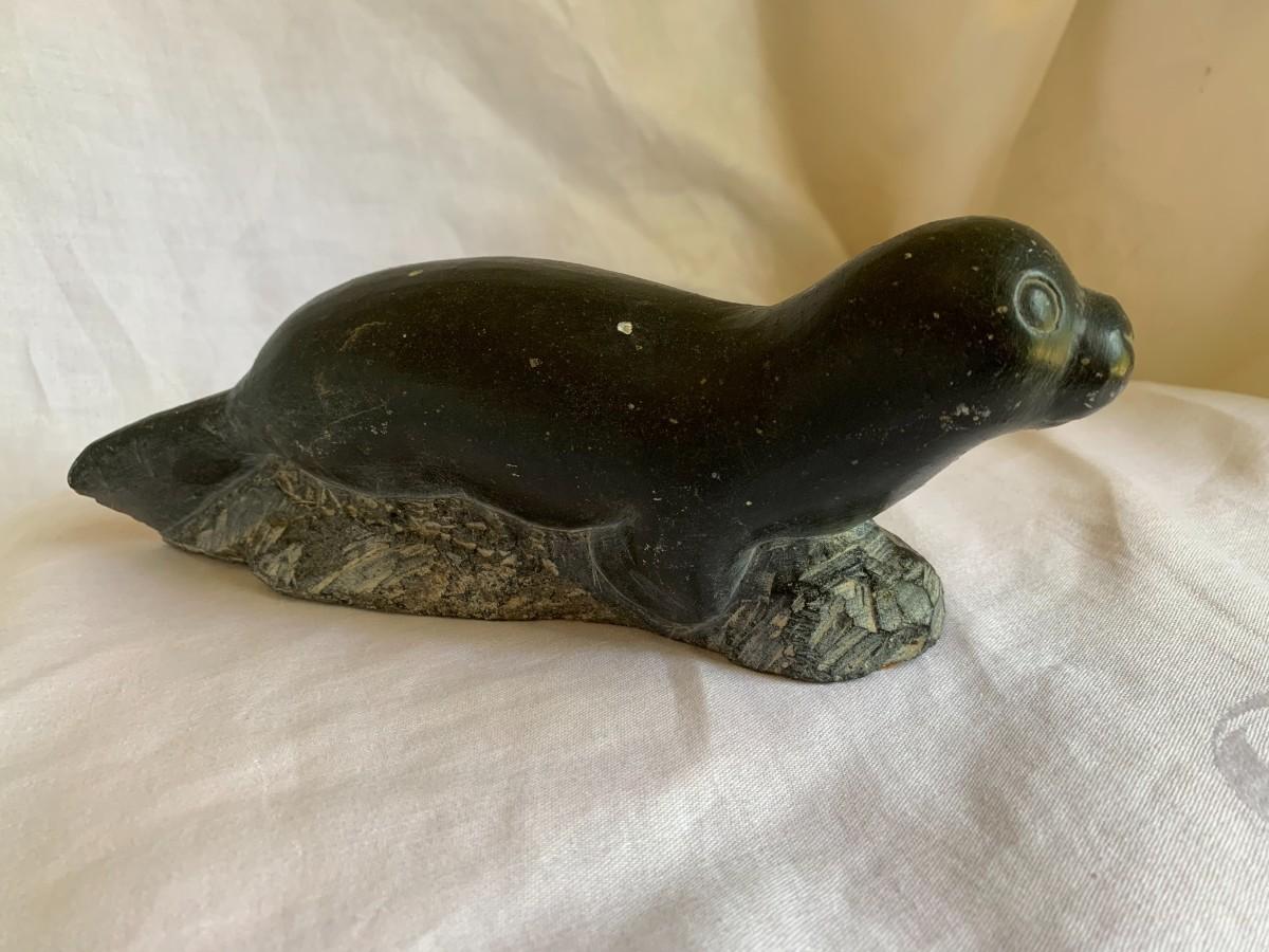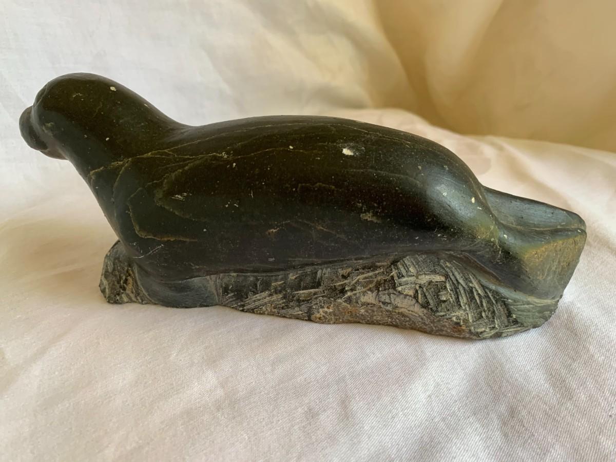 Most likely Inuit. There are green tones on both sides of this eye catching seal, along with lots of texture and white fleck in the stone. Measures 8 3/4" long x 3" tall x 2 1/2" wide