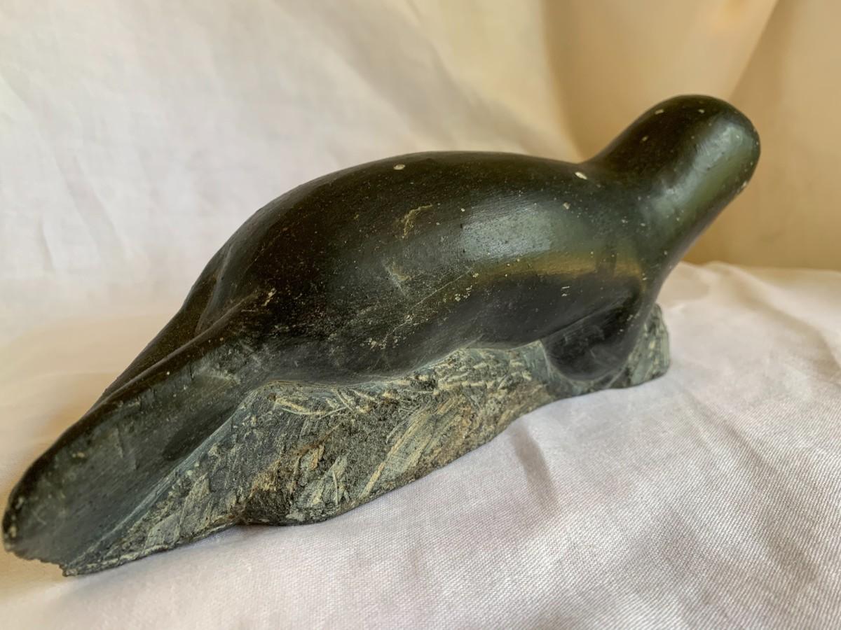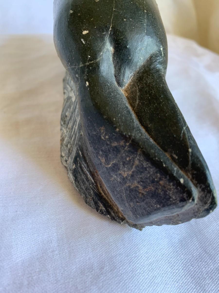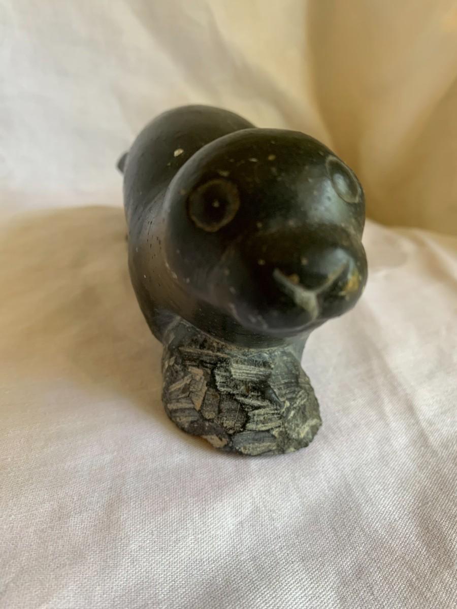 Most likely Inuit. There are green tones on both sides of this eye catching seal, along with lots of texture and white fleck in the stone. Measures 8 3/4" long x 3" tall x 2 1/2" wide